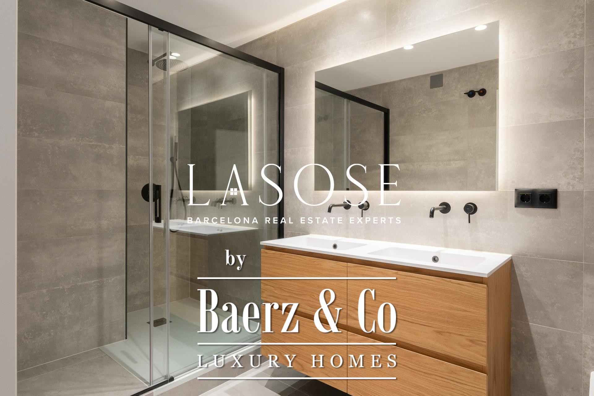 Three bedrooms, including a master suite with private bathroom and separate dressing room, are complemented by fitted wardrobes and custom carpentry. Comfort is assured through aerothermal air conditioning and double-glazed wooden windows. Residents benefit from the convenience of an elevator, concierge service, video intercom, and secure armored door. The long-tail variation luxury apartment for sale in Barcelona is well-suited for those who value discretion and design.
