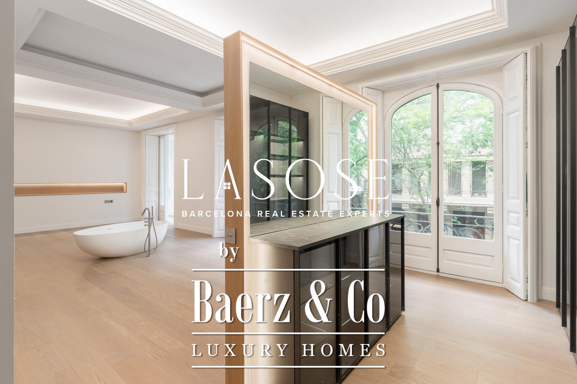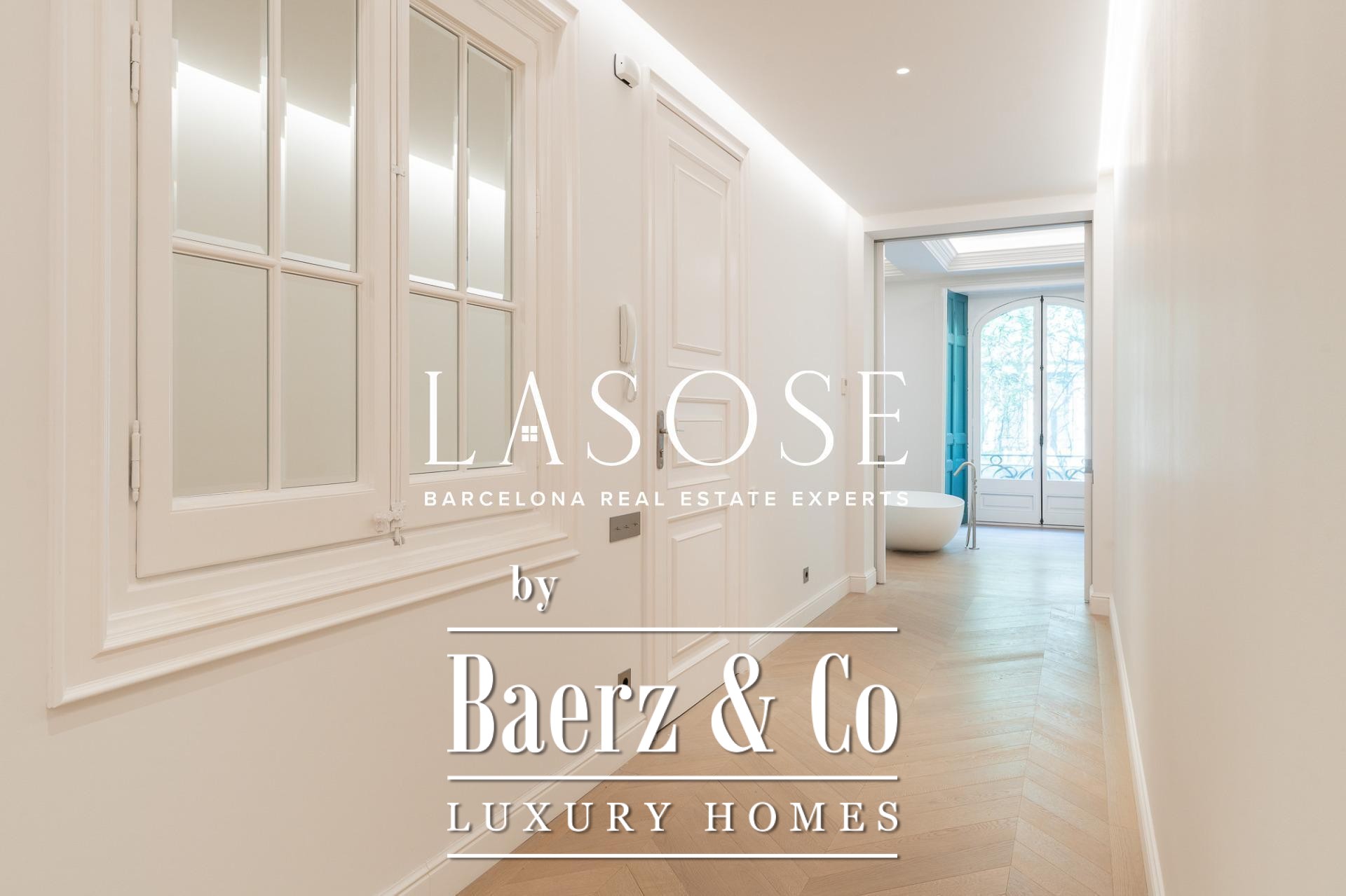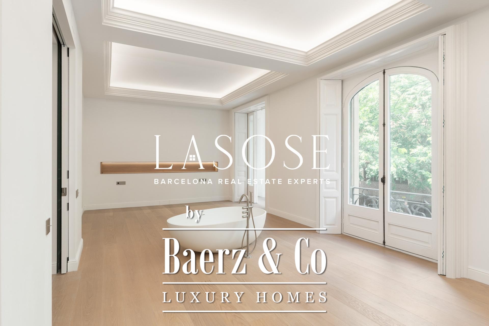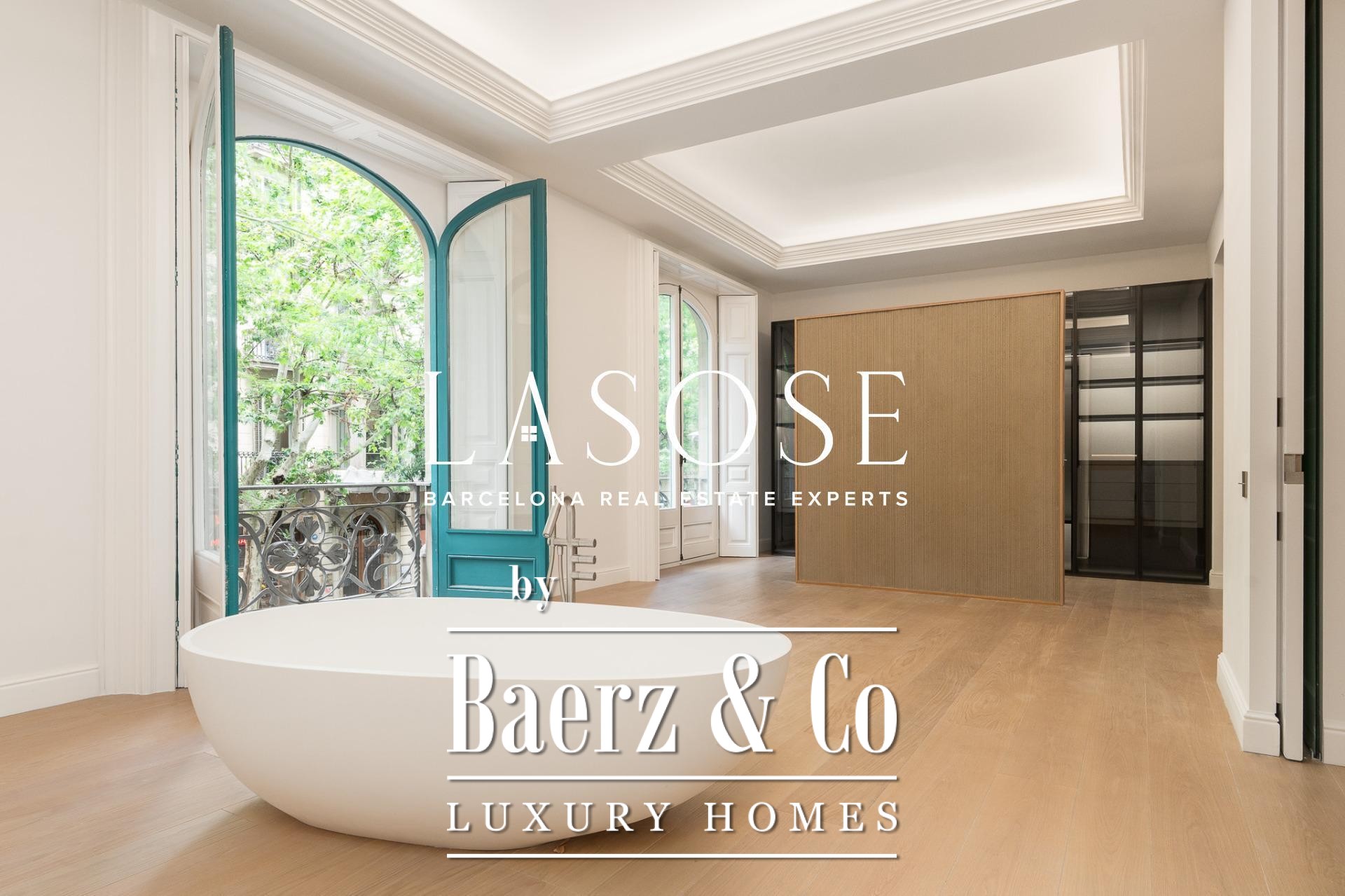 LASOSE presents this magnificent 347 m² property, completely renovated, which combines the charm of a classic estate with the comfort and sophistication of contemporary design. Located in an elegant regal estate dating from 1885, with elevator and in excellent condition, this property offers a unique experience in one of the most vibrant areas of the city.. . Located on the interfloor and with ceilings of 3.2 meters high, the apartment enjoys an exceptional luminosity thanks to its views to two streets and its southeast orientation. From the entrance, it surprises with a spectacular welcome area adorned with modernist details that make the difference.. . The day area consists of a large living-dining room with open kitchen, equipped with a central island space for six diners, ideal for meetings and dinners. This space is complemented by an elegant office, a guest toilet and a practical laundry area with washing machine, dryer and storage cabinets.. . The jewel of the home is its impressive 60 m² master suite, which