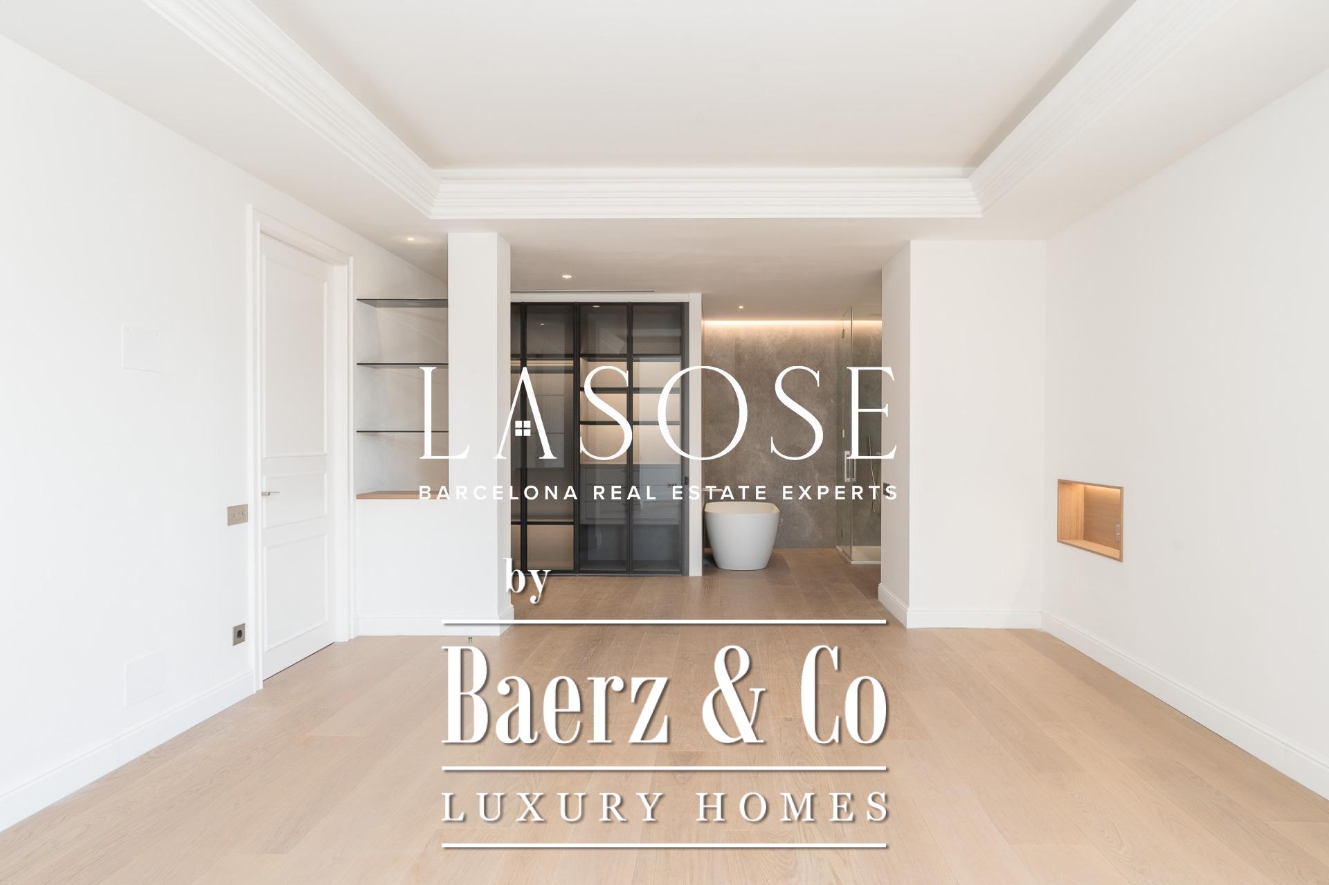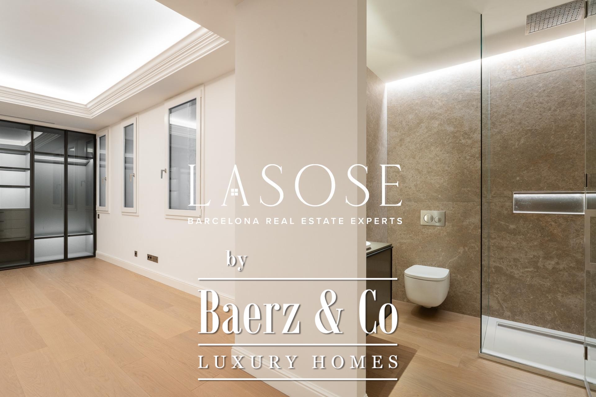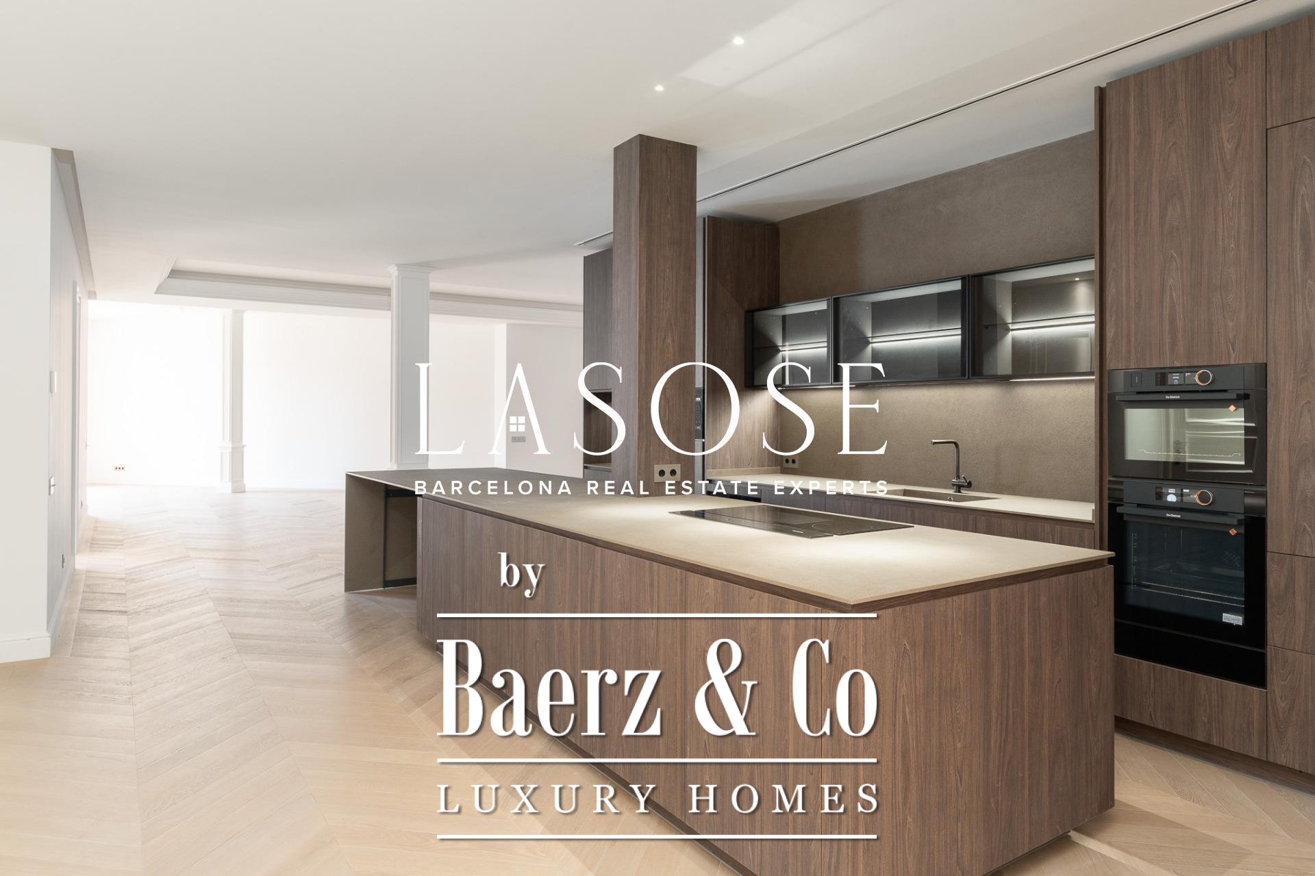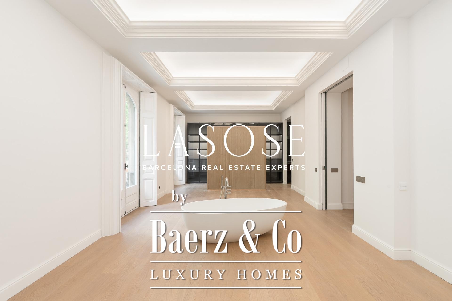 LASOSE presents this magnificent 347 m² property, completely renovated, which combines the charm of a classic estate with the comfort and sophistication of contemporary design. Located in an elegant regal estate dating from 1885, with elevator and in excellent condition, this property offers a unique experience in one of the most vibrant areas of the city.. . Located on the interfloor and with ceilings of 3.2 meters high, the apartment enjoys an exceptional luminosity thanks to its views to two streets and its southeast orientation. From the entrance, it surprises with a spectacular welcome area adorned with modernist details that make the difference.. . The day area consists of a large living-dining room with open kitchen, equipped with a central island space for six diners, ideal for meetings and dinners. This space is complemented by an elegant office, a guest toilet and a practical laundry area with washing machine, dryer and storage cabinets.. . The jewel of the home is its impressive 60 m² master suite, which