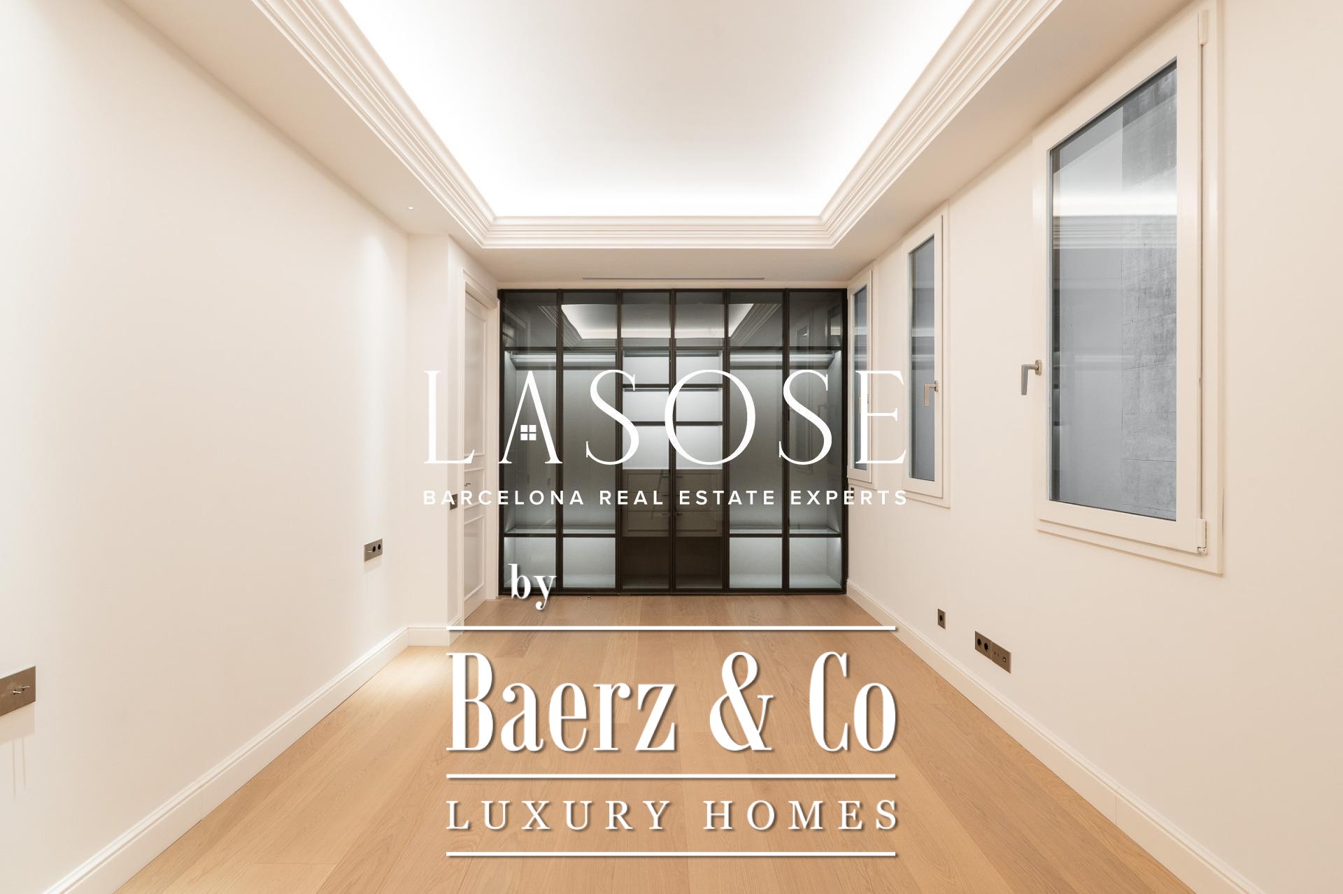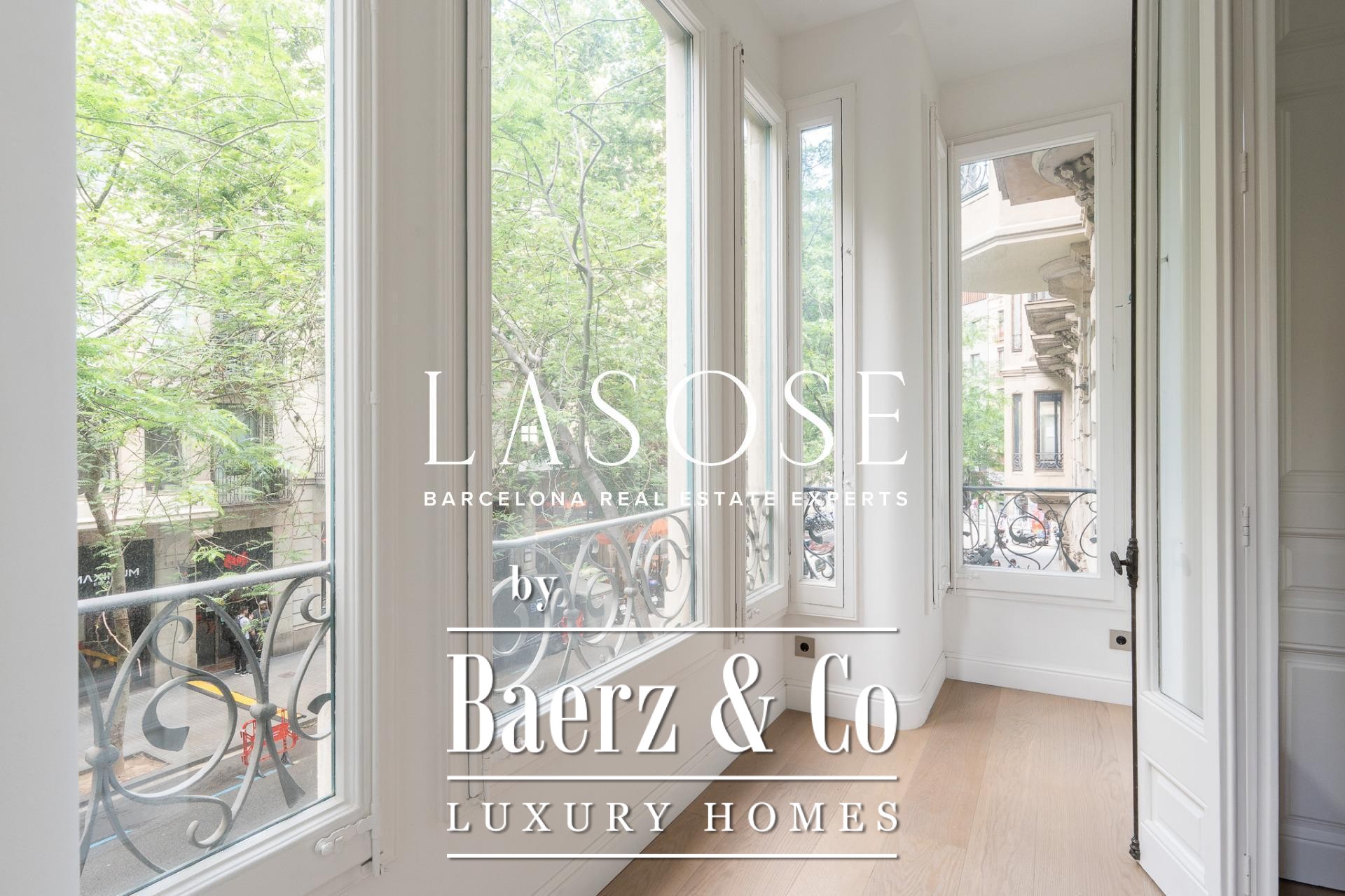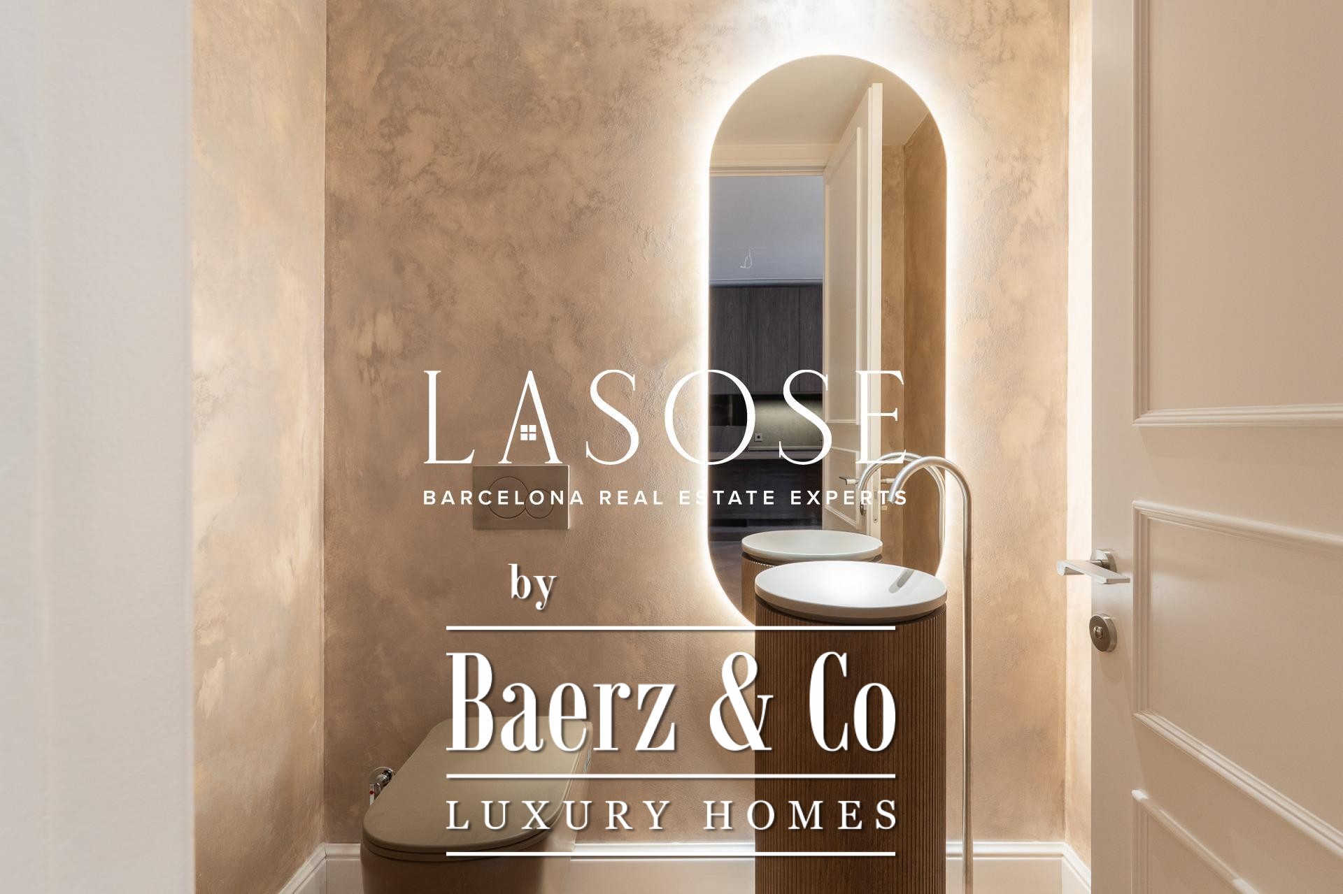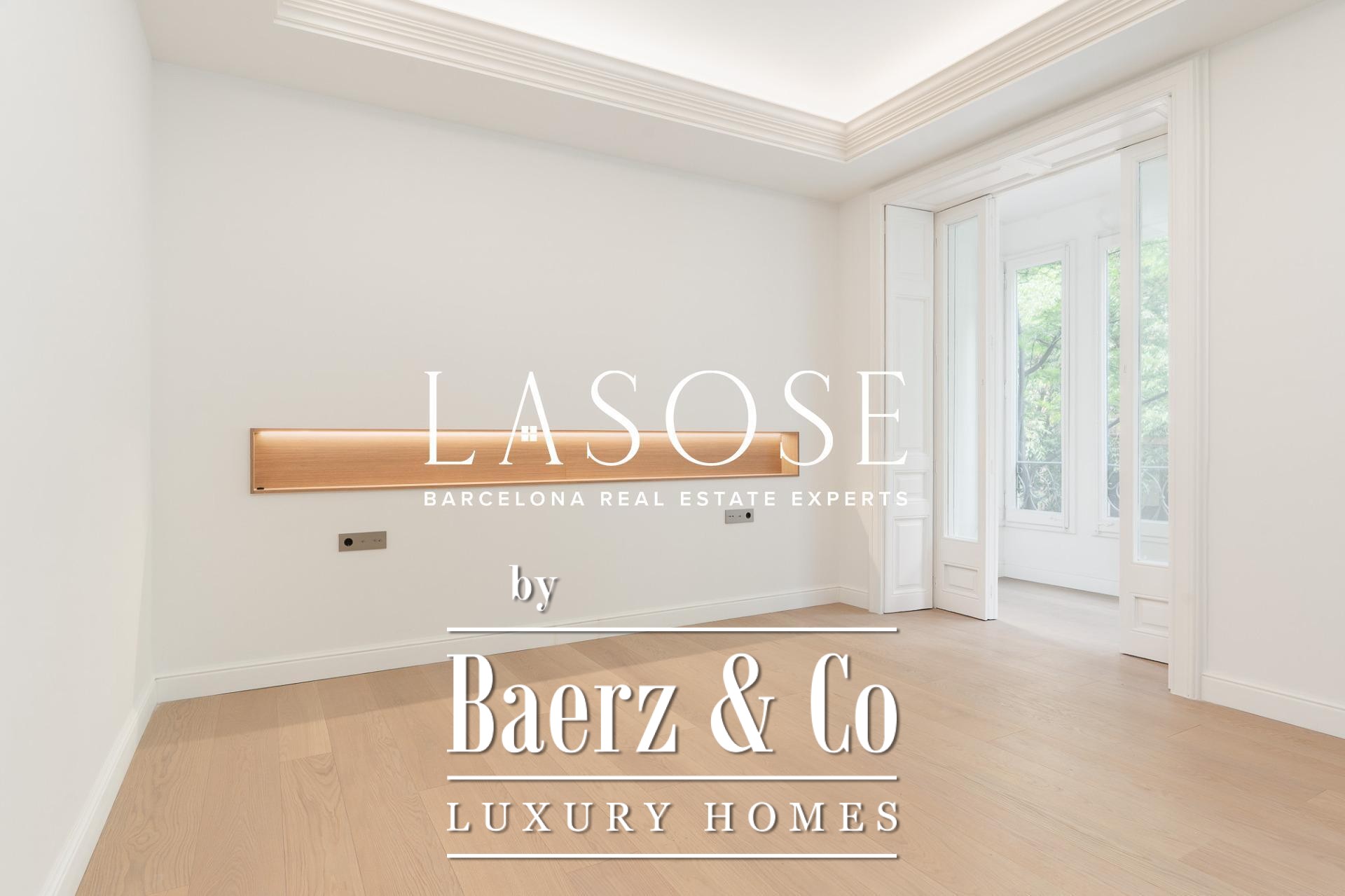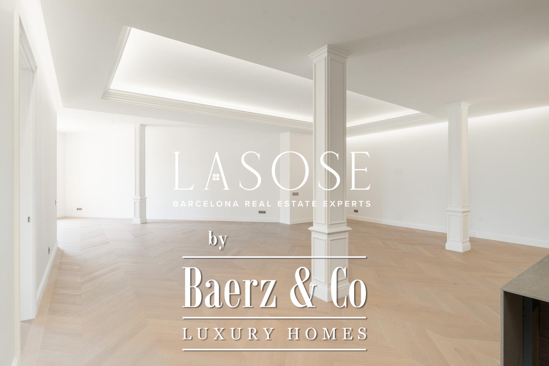 LASOSE presents this magnificent 347 m² property, completely renovated, which combines the charm of a classic estate with the comfort and sophistication of contemporary design. Located in an elegant regal estate dating from 1885, with elevator and in excellent condition, this property offers a unique experience in one of the most vibrant areas of the city.. . Located on the interfloor and with ceilings of 3.2 meters high, the apartment enjoys an exceptional luminosity thanks to its views to two streets and its southeast orientation. From the entrance, it surprises with a spectacular welcome area adorned with modernist details that make the difference.. . The day area consists of a large living-dining room with open kitchen, equipped with a central island space for six diners, ideal for meetings and dinners. This space is complemented by an elegant office, a guest toilet and a practical laundry area with washing machine, dryer and storage cabinets.. . The jewel of the home is its impressive 60 m² master suite, which