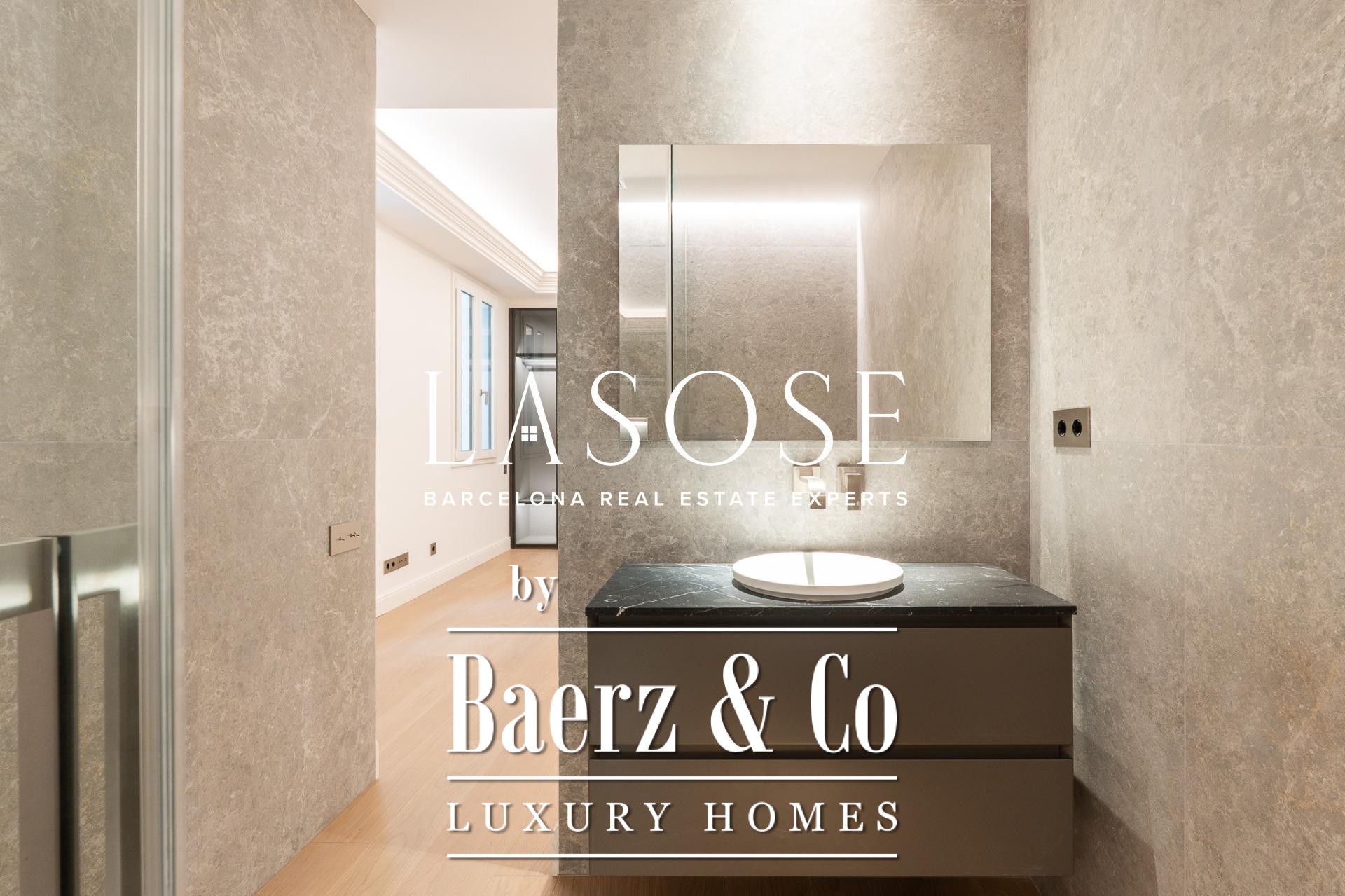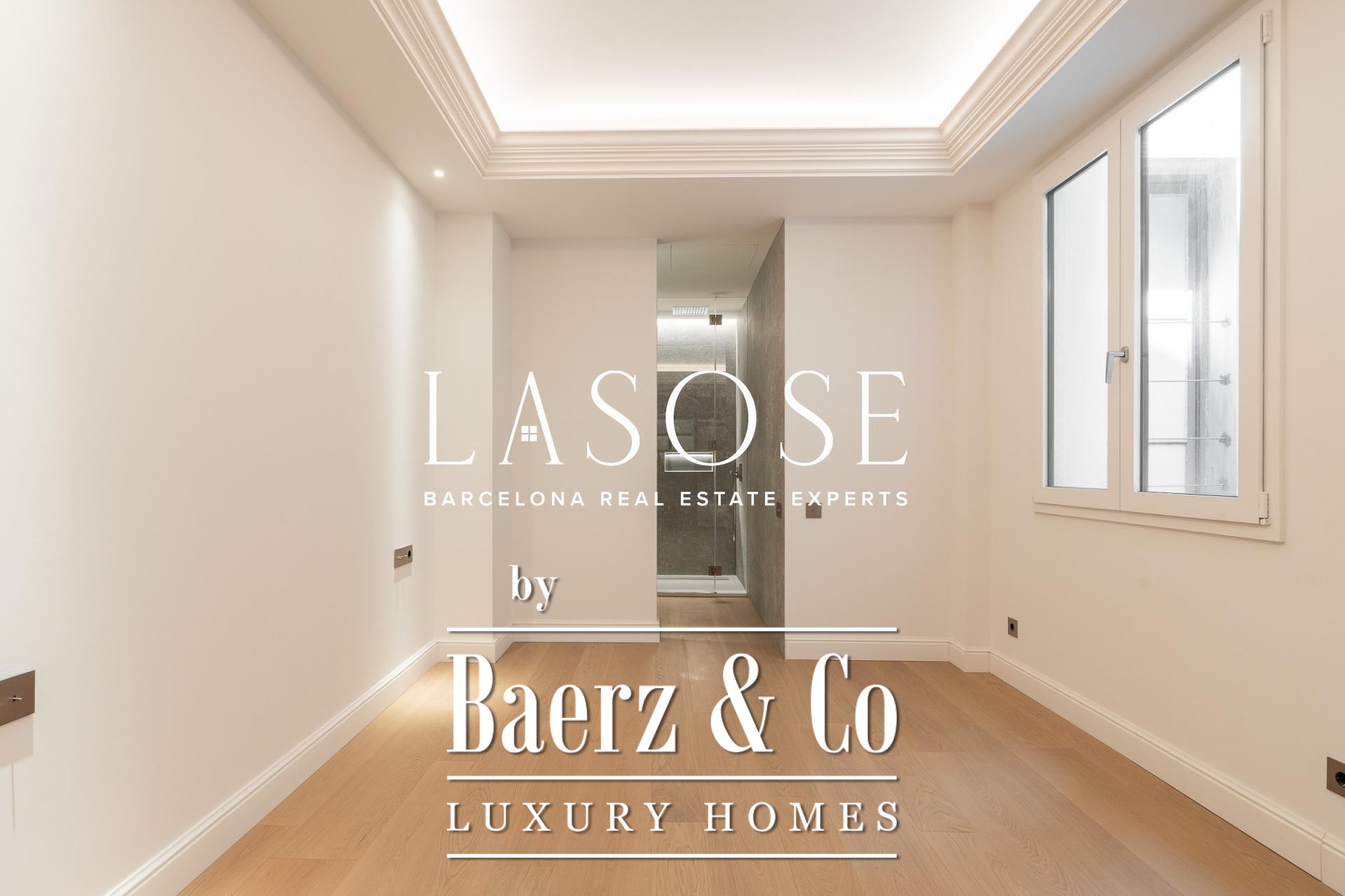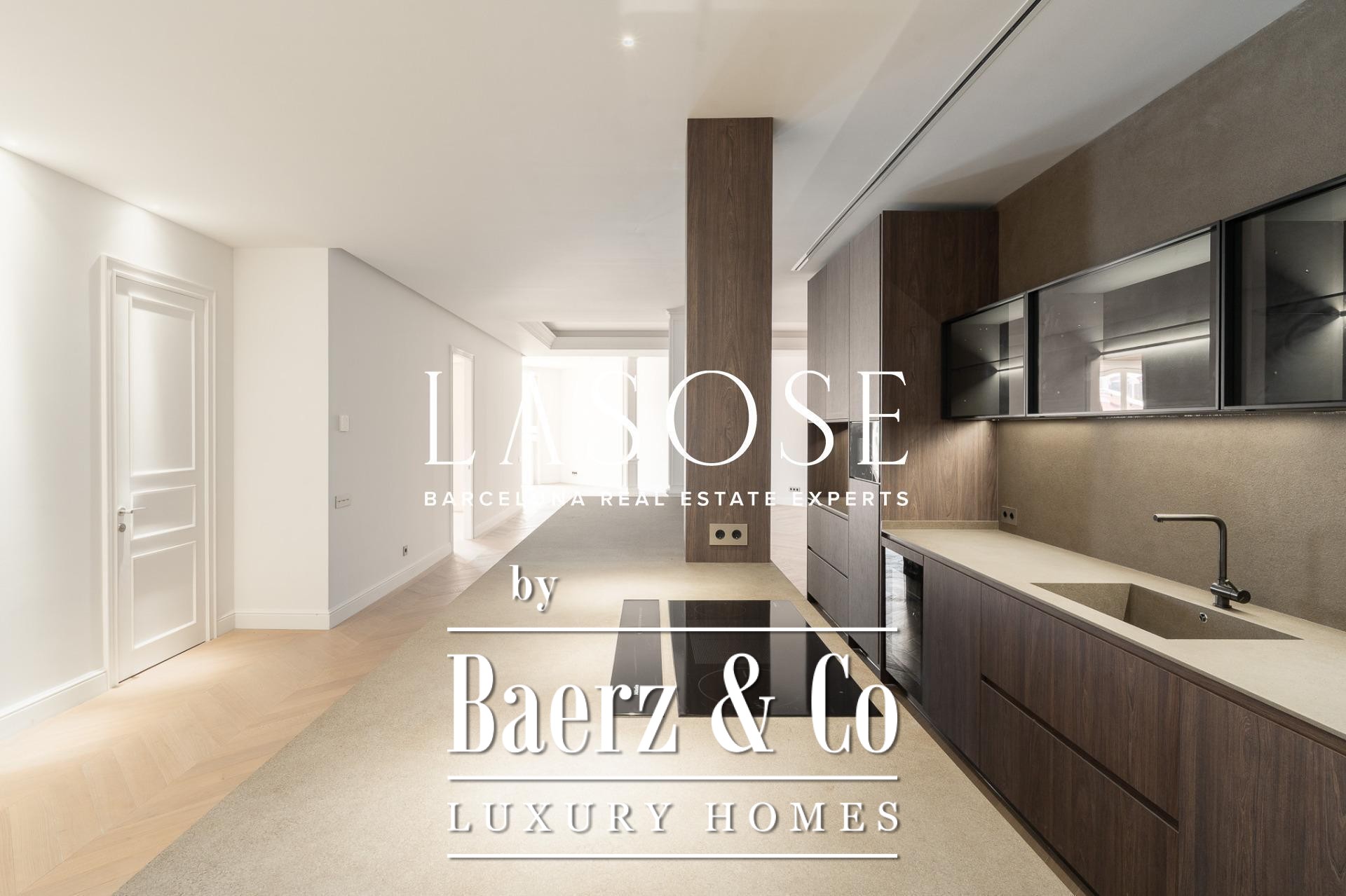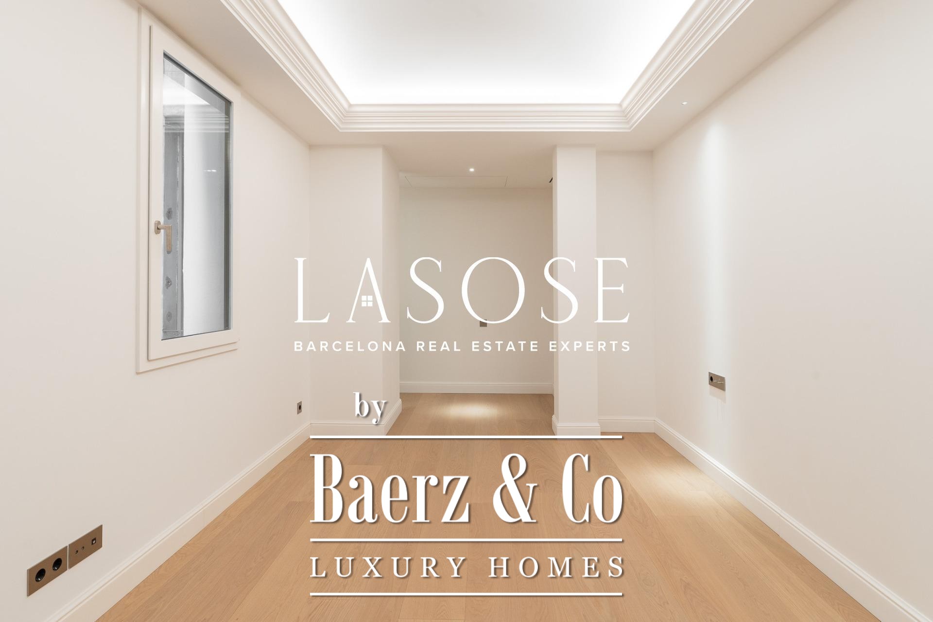 LASOSE presents this magnificent 347 m² property, completely renovated, which combines the charm of a classic estate with the comfort and sophistication of contemporary design. Located in an elegant regal estate dating from 1885, with elevator and in excellent condition, this property offers a unique experience in one of the most vibrant areas of the city.. . Located on the interfloor and with ceilings of 3.2 meters high, the apartment enjoys an exceptional luminosity thanks to its views to two streets and its southeast orientation. From the entrance, it surprises with a spectacular welcome area adorned with modernist details that make the difference.. . The day area consists of a large living-dining room with open kitchen, equipped with a central island space for six diners, ideal for meetings and dinners. This space is complemented by an elegant office, a guest toilet and a practical laundry area with washing machine, dryer and storage cabinets.. . The jewel of the home is its impressive 60 m² master suite, which