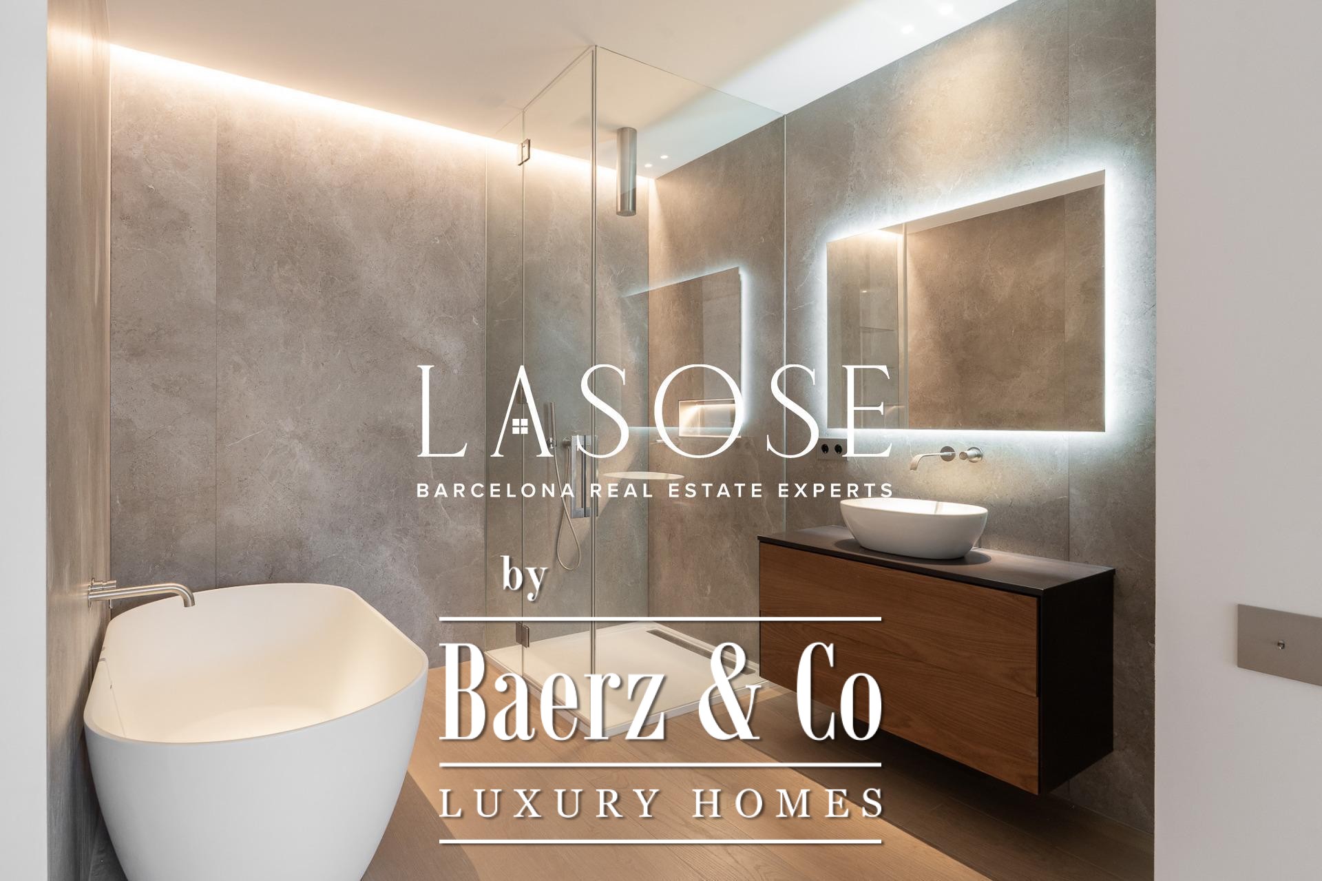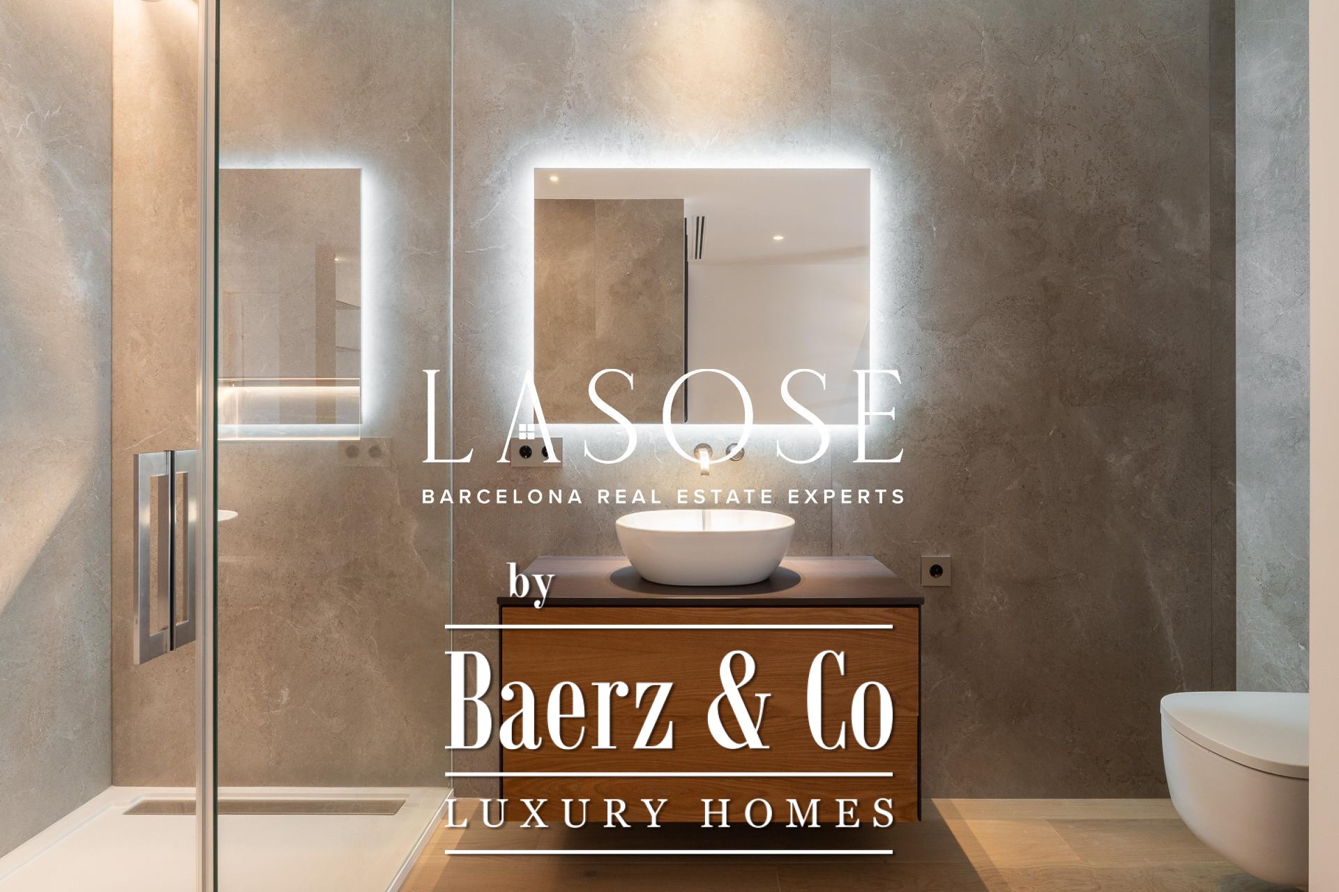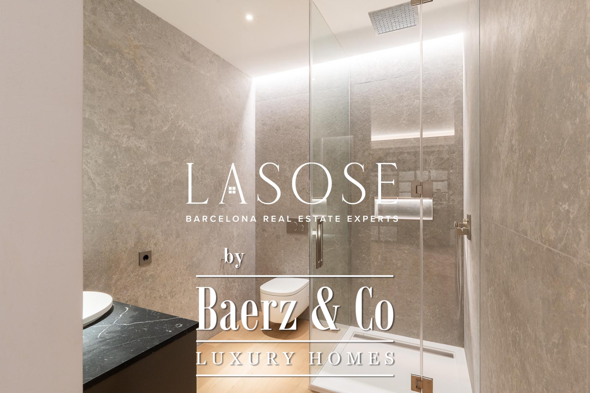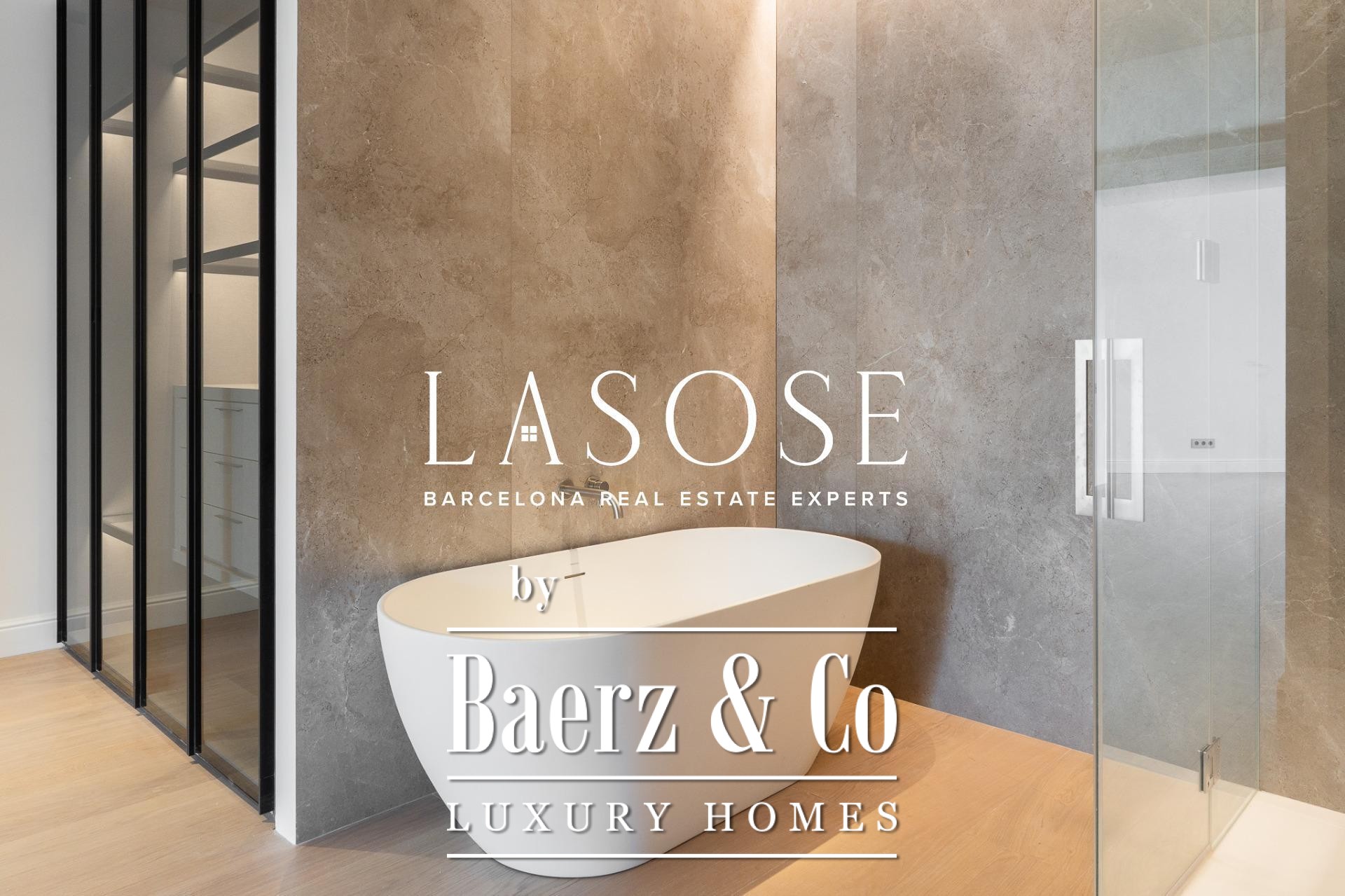 LASOSE presents this magnificent 347 m² property, completely renovated, which combines the charm of a classic estate with the comfort and sophistication of contemporary design. Located in an elegant regal estate dating from 1885, with elevator and in excellent condition, this property offers a unique experience in one of the most vibrant areas of the city.. . Located on the interfloor and with ceilings of 3.2 meters high, the apartment enjoys an exceptional luminosity thanks to its views to two streets and its southeast orientation. From the entrance, it surprises with a spectacular welcome area adorned with modernist details that make the difference.. . The day area consists of a large living-dining room with open kitchen, equipped with a central island space for six diners, ideal for meetings and dinners. This space is complemented by an elegant office, a guest toilet and a practical laundry area with washing machine, dryer and storage cabinets.. . The jewel of the home is its impressive 60 m² master suite, which