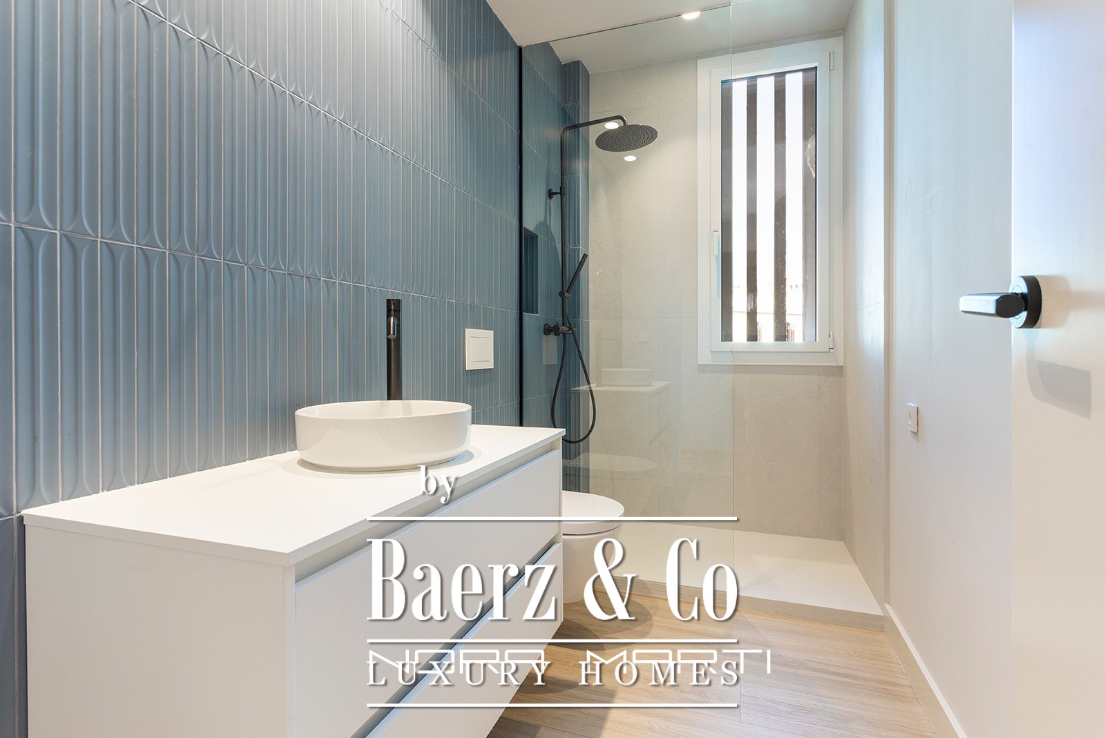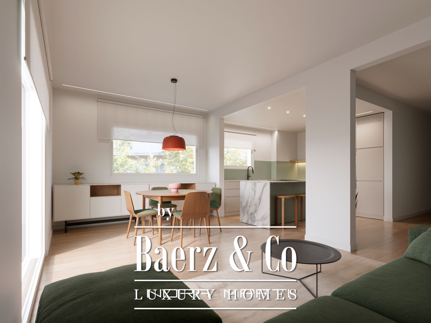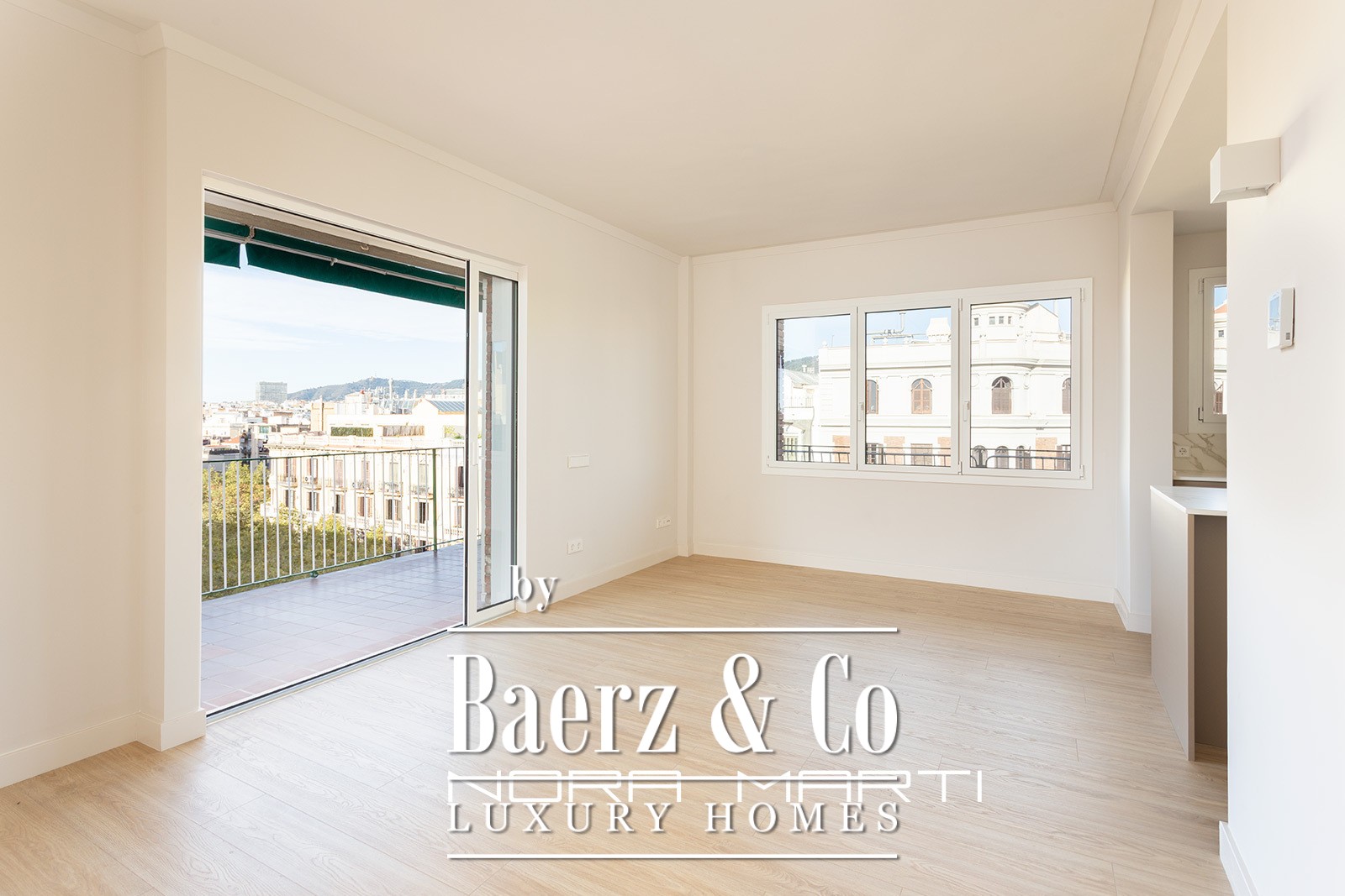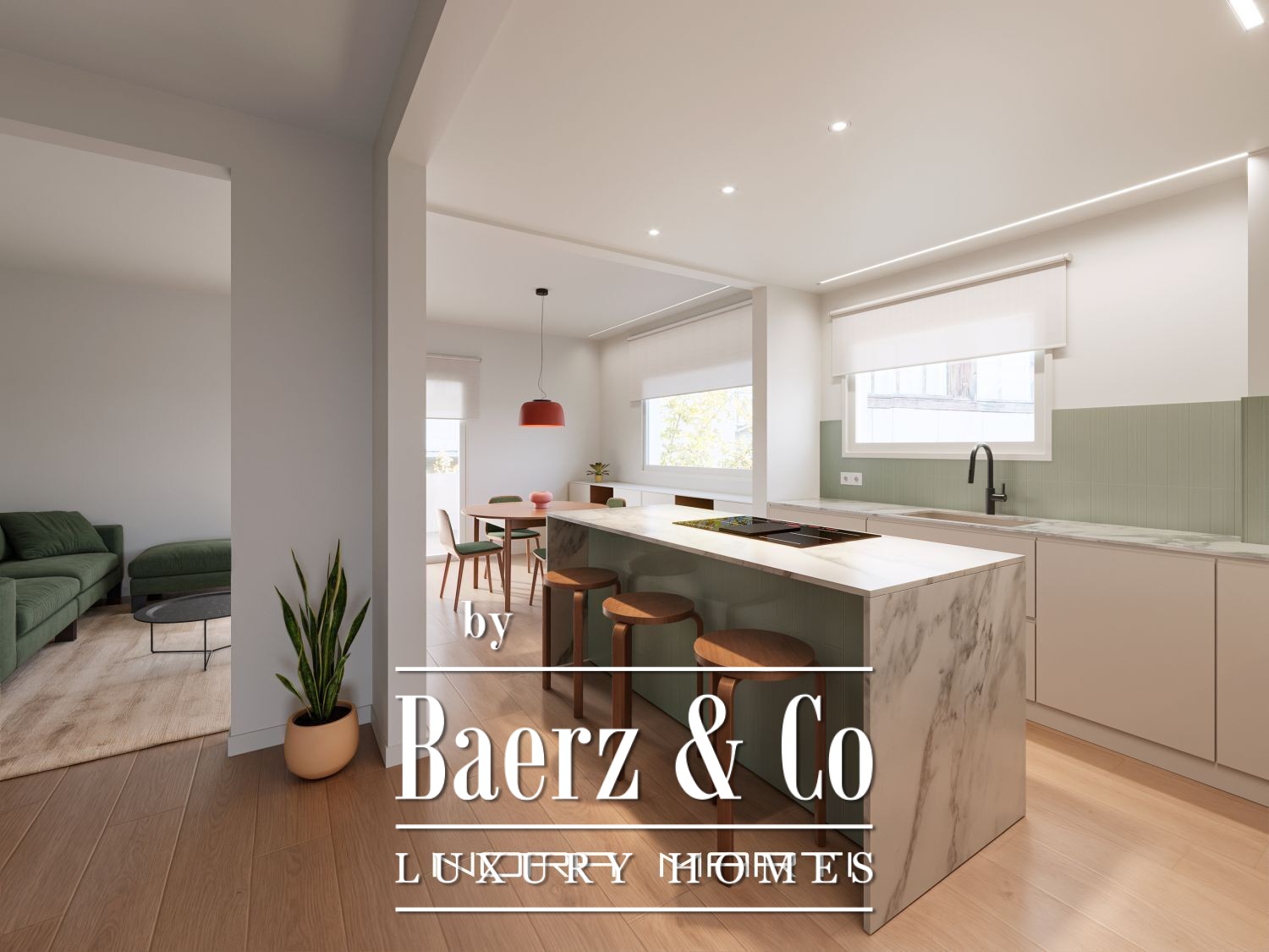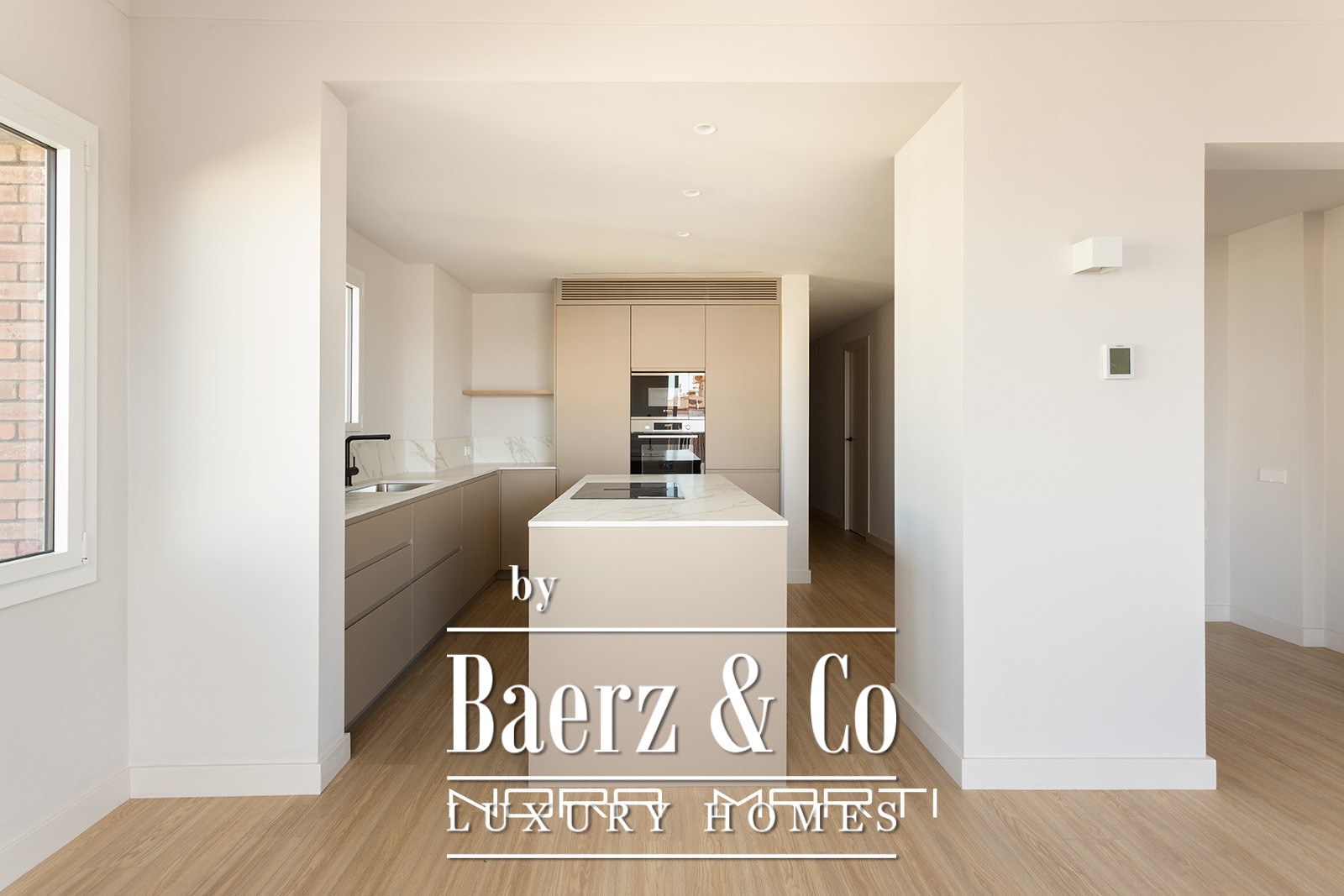 In the living area, we find a spacious living-dining room with access to the 30 m2 terrace, a perfect private oasis for relaxing or entertaining guests; a fully equipped kitchen with an island and a separate utility area.