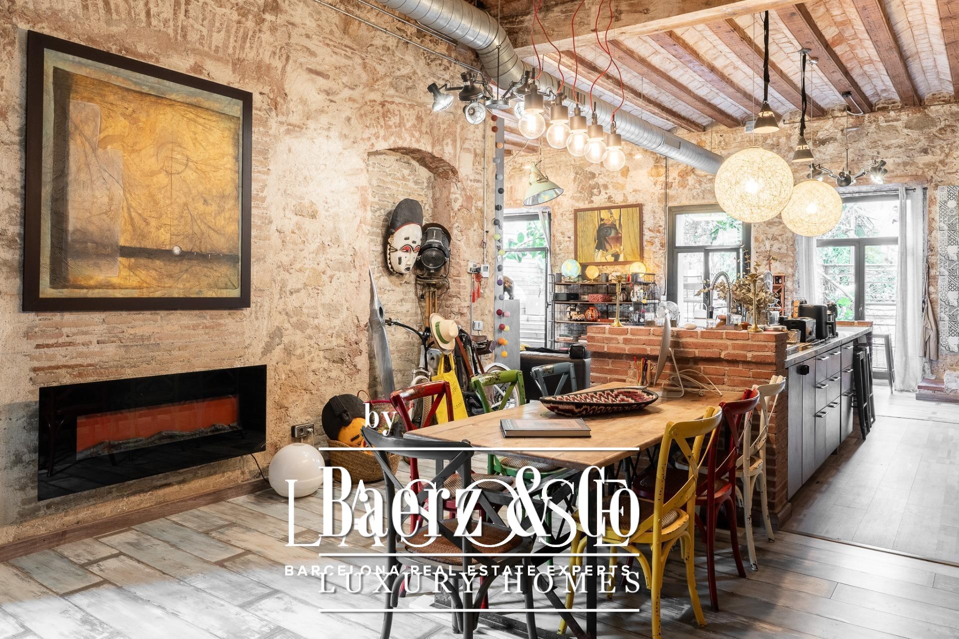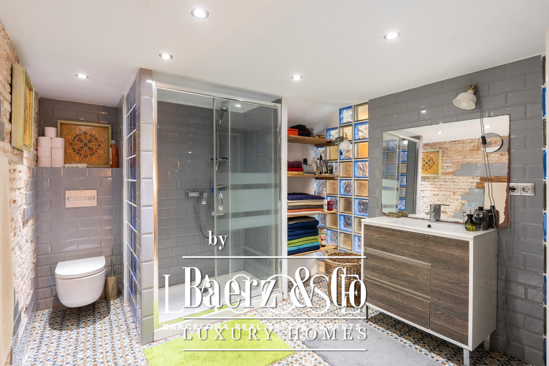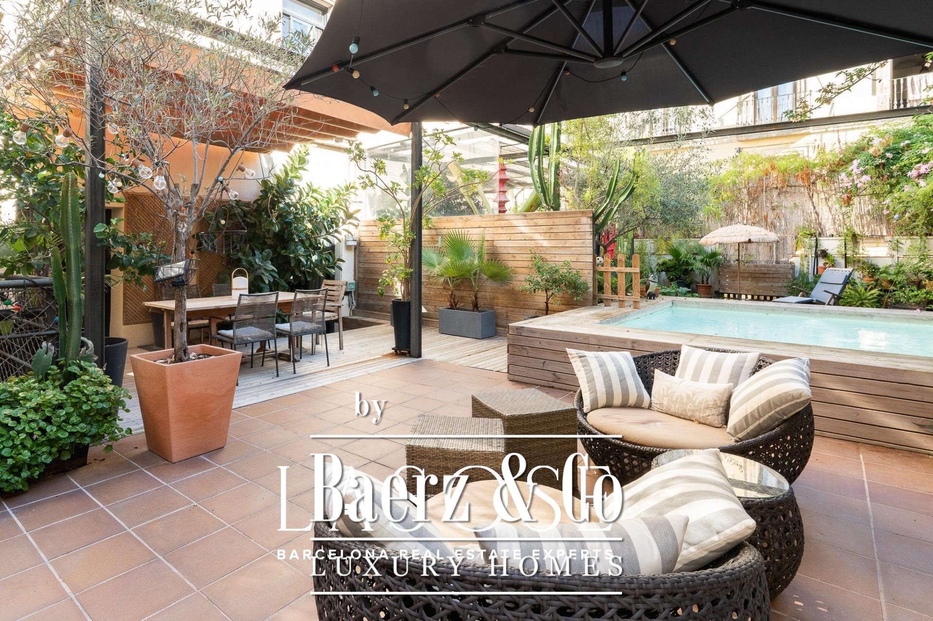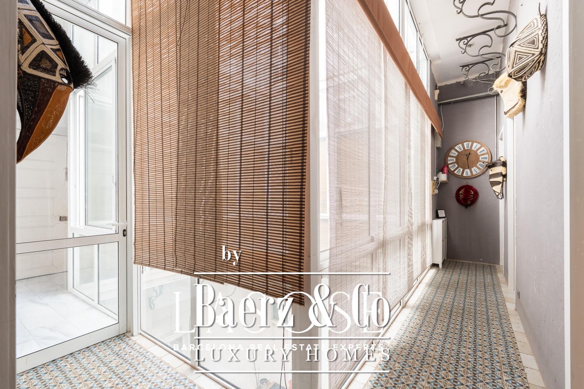 . . This catalan style apartment consists of 218 m2 plus 74 m2 of private terrace with pool. Upon entering, we find a corridor with huge windows that overlooks a large interior patio offering the space plenty of natural light. Ithis area connects the three double bedrooms; each one with its private bathroom, and another room that acts as a large multifunctional space that can perfectly be used as an office space.. . Following the corridor we find the day area, a huge and spacious space with very high ceilings up to 5 meters, composed of a large open kitchen, original brick walls and tiles, a toilet and a beautiful living room with a (wood) fireplace from which you can access the wonderful terrace with a pool shared with the neighbour next door. The terrace is private and is recently restored with new roofing to guarantee privacy. The whole house was completely renovated keeping original elements and decorated with great