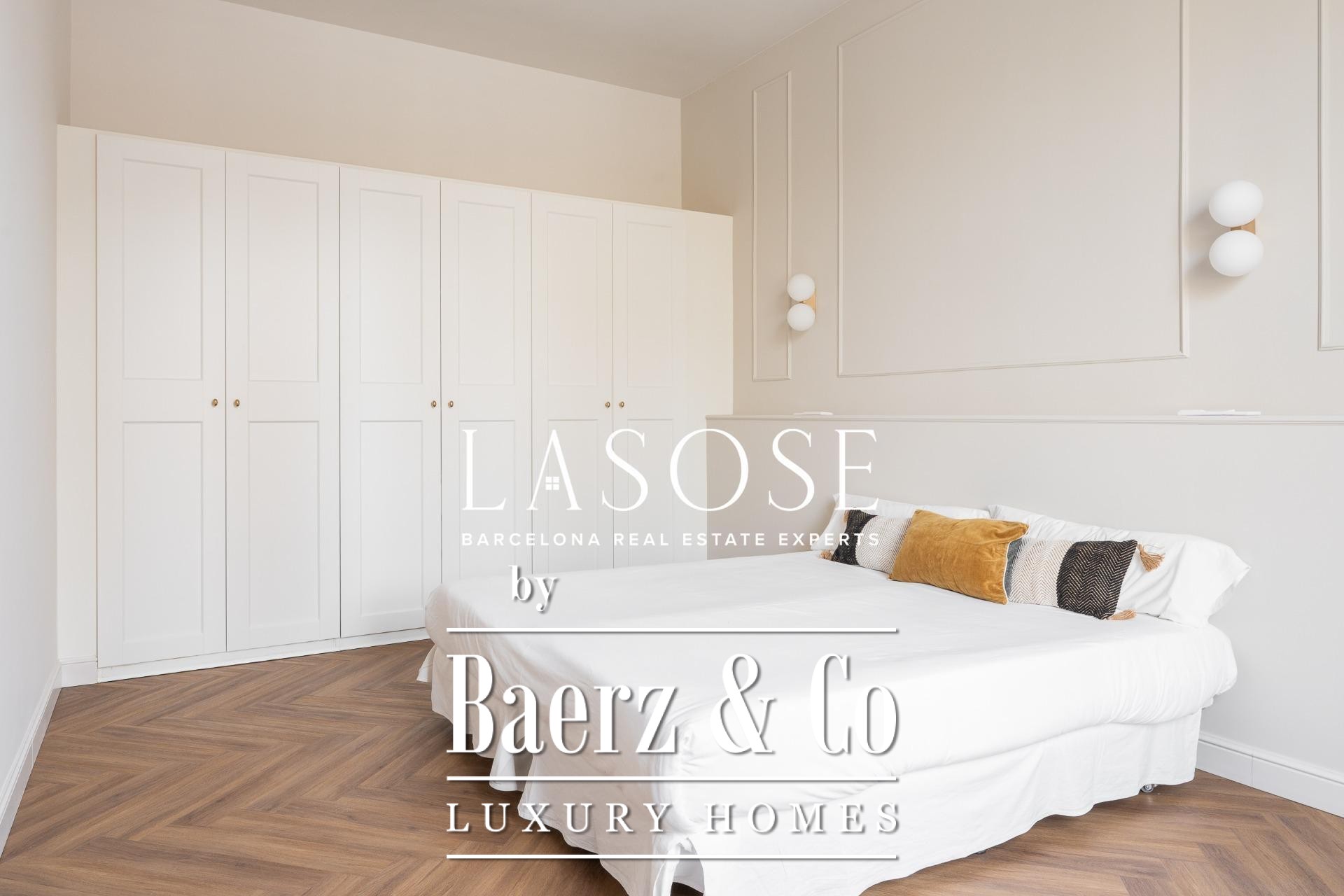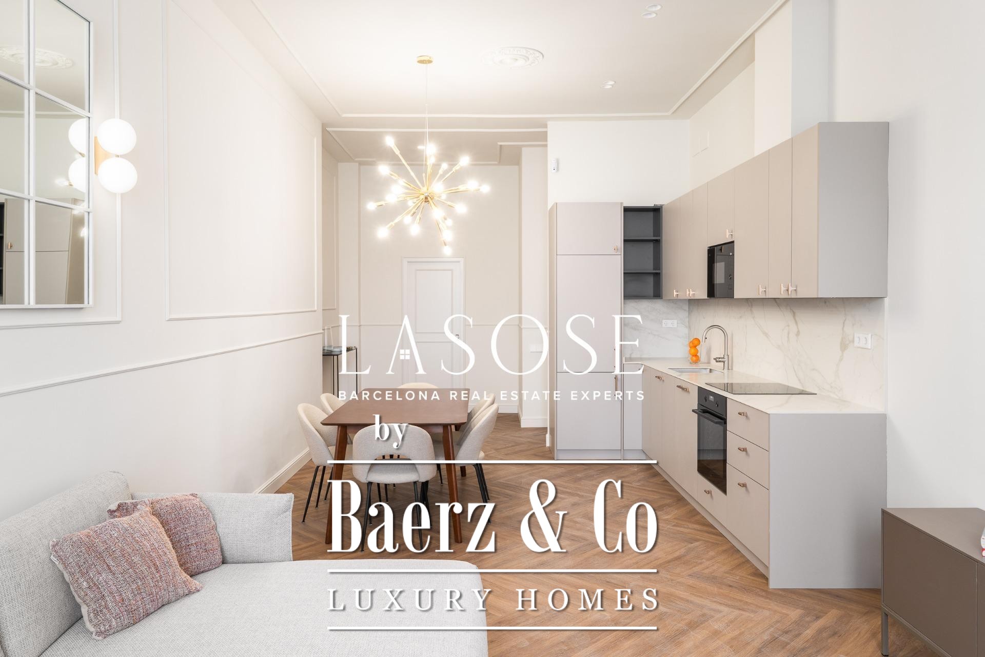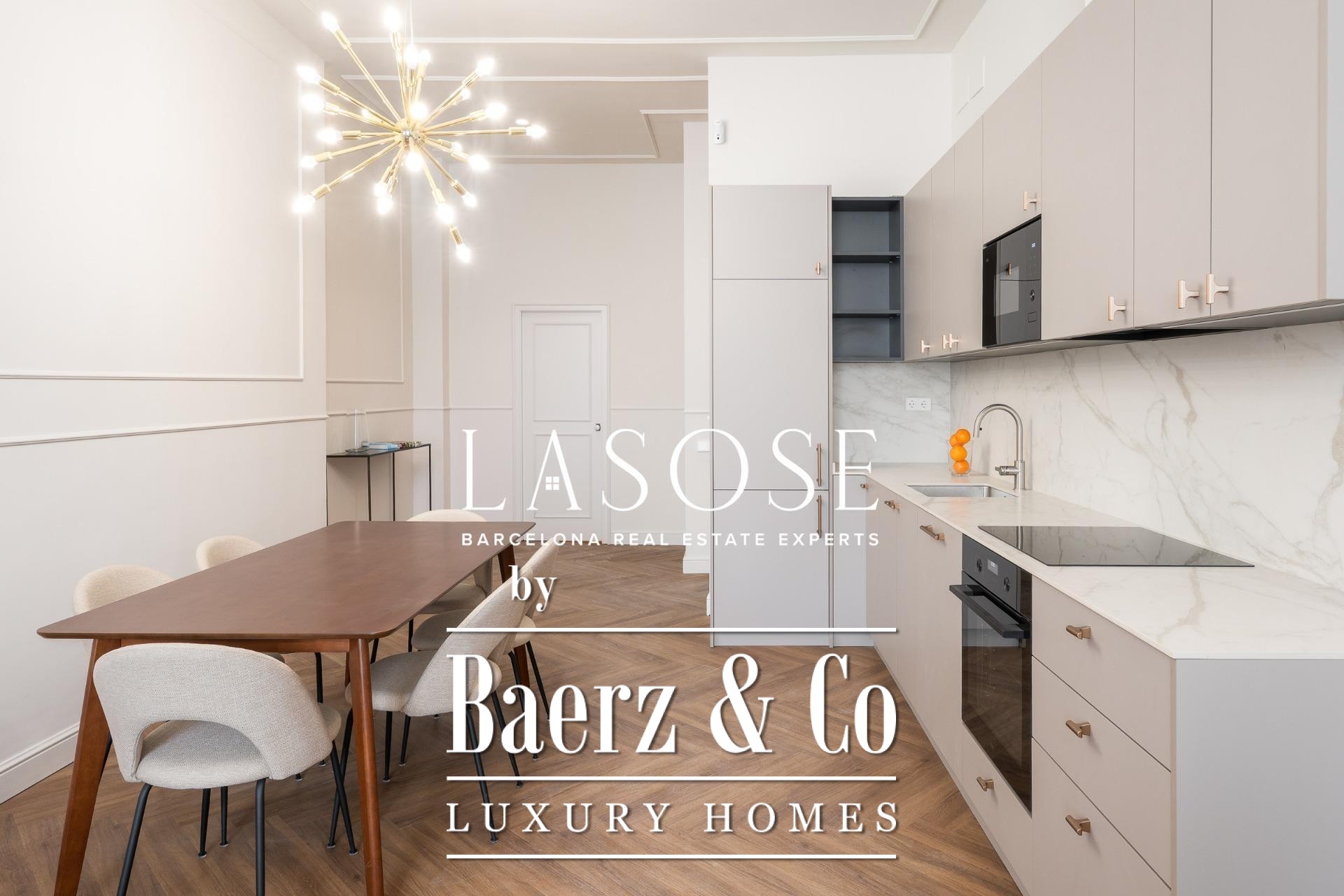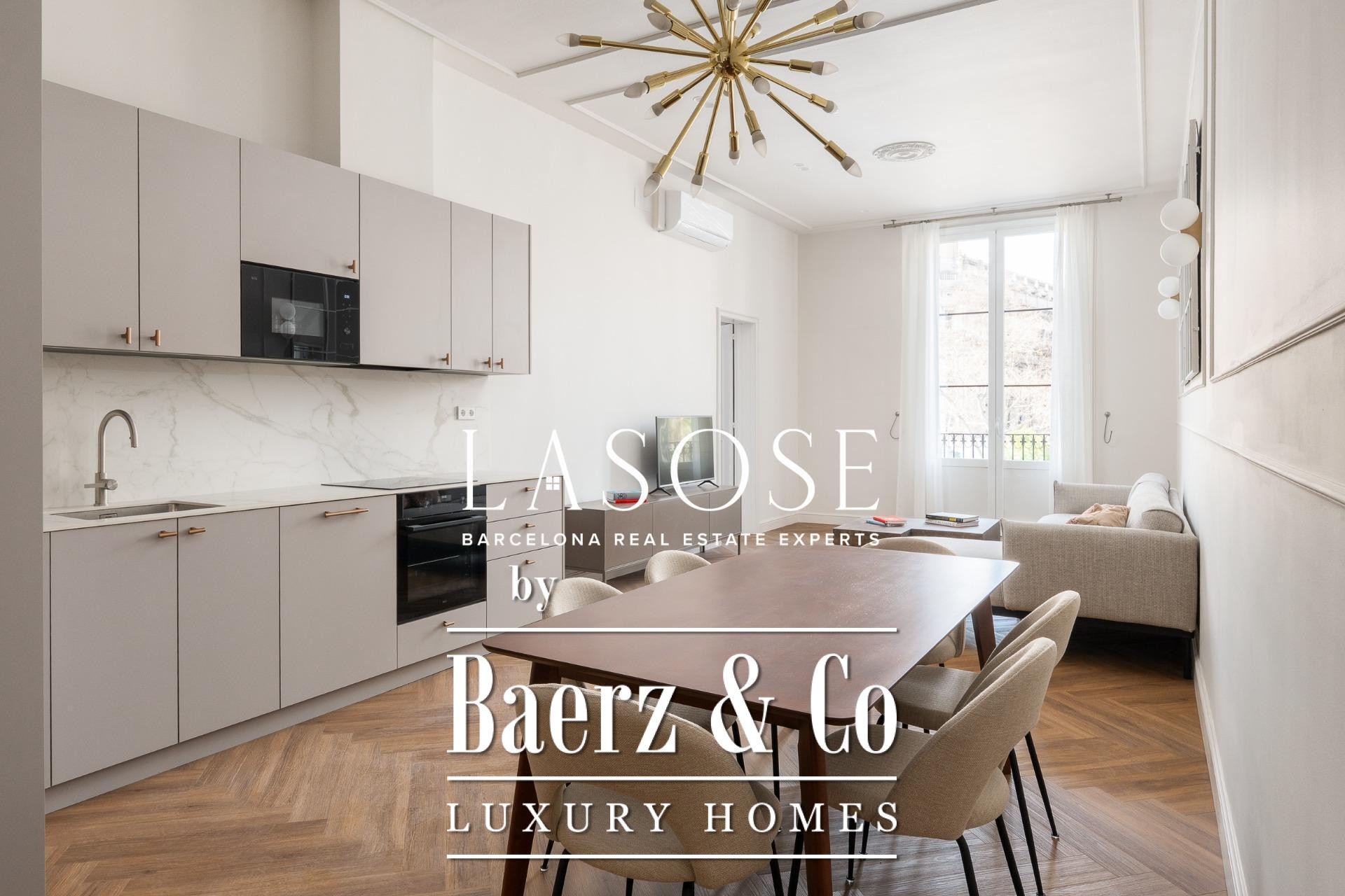 Apartment Barcelona is redefined in this exceptional 118 m² residence, showcasing a meticulous renovation within a historic 1850 building, now a Local Heritage Site. The property achieves the rare harmony between preserved architectural character and the expectations of contemporary luxury. Entering, you are welcomed by an immediate sense of space and refinement, with an open-plan living and dining area bathed in natural light through generous windows facing Paseo Isabel II. Designer furnishings and premium finishes elevate every moment spent here.