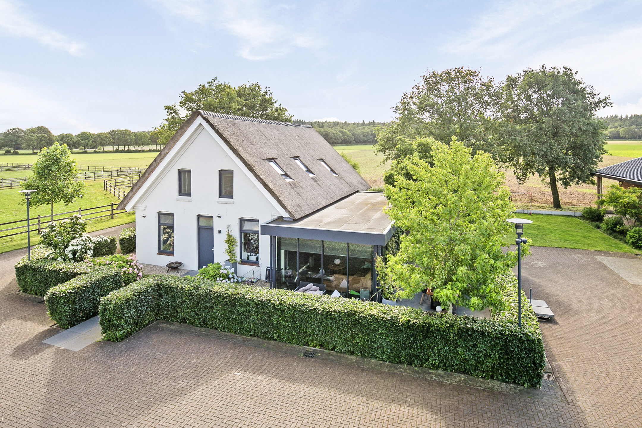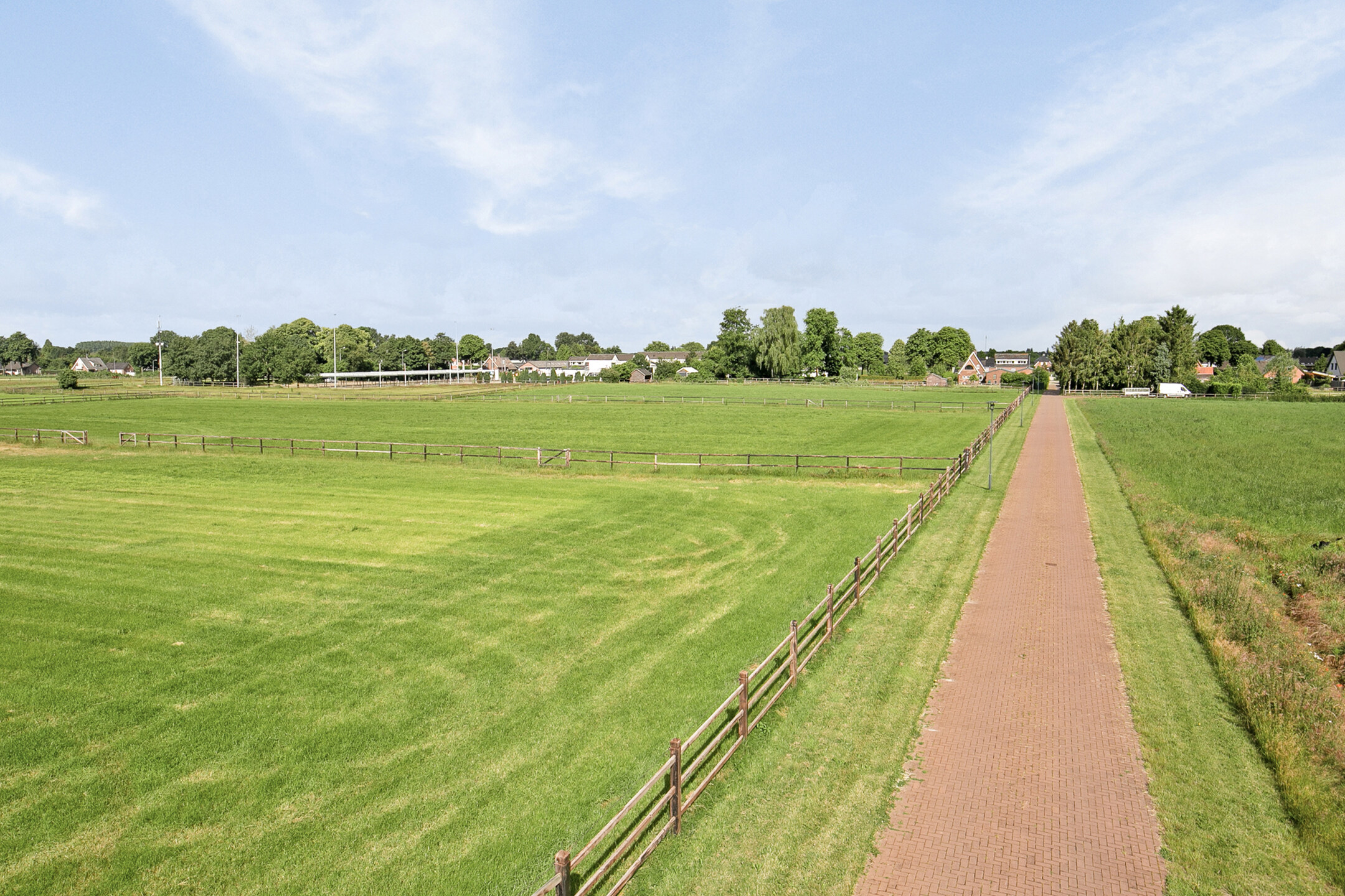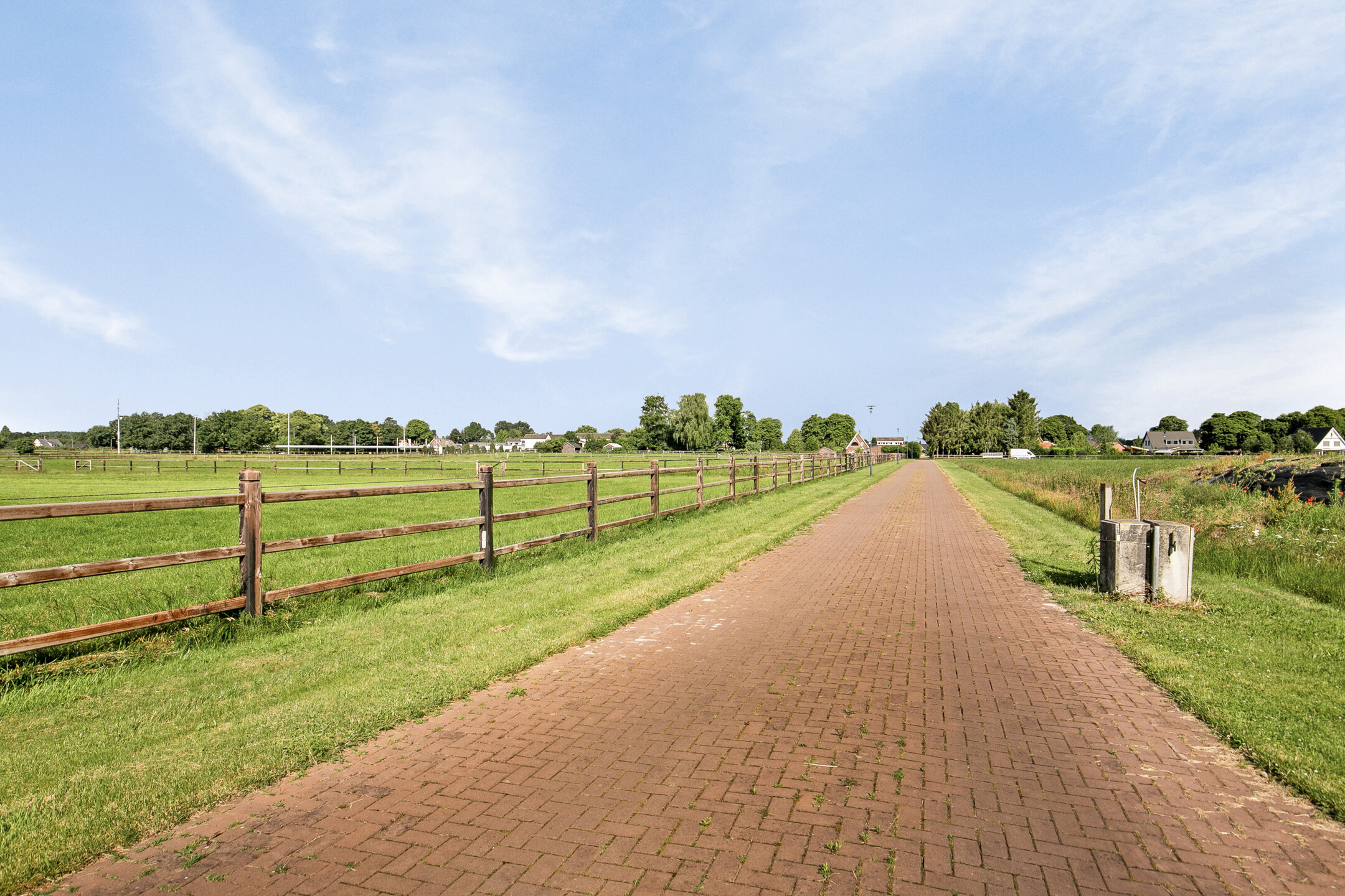 The outside grounds at the rear of the property are equipped with an outdoor arena, a horse walker, a lunging circle, manure pit and paddocks. The entire yard is paved with baked clinkers. The outdoor arena measures approx. 30x60 metres and has an Equisport ebb and flow riding surface. The arena is fenced off with a beech hedge. The horse walker is suitable for 4 horses and has a wooden fence. The sandy soil is mixed with flakes. The lunging circle is equipped with an ebb and flow riding surface and a wooden fence. There are 2 paddocks, which are equipped with a drained sandy soil and a wooden fence. Pastures are located around the accommodation and fenced with wood. Extension of pasture land is possible by buying or leasing neighbouring plots.
