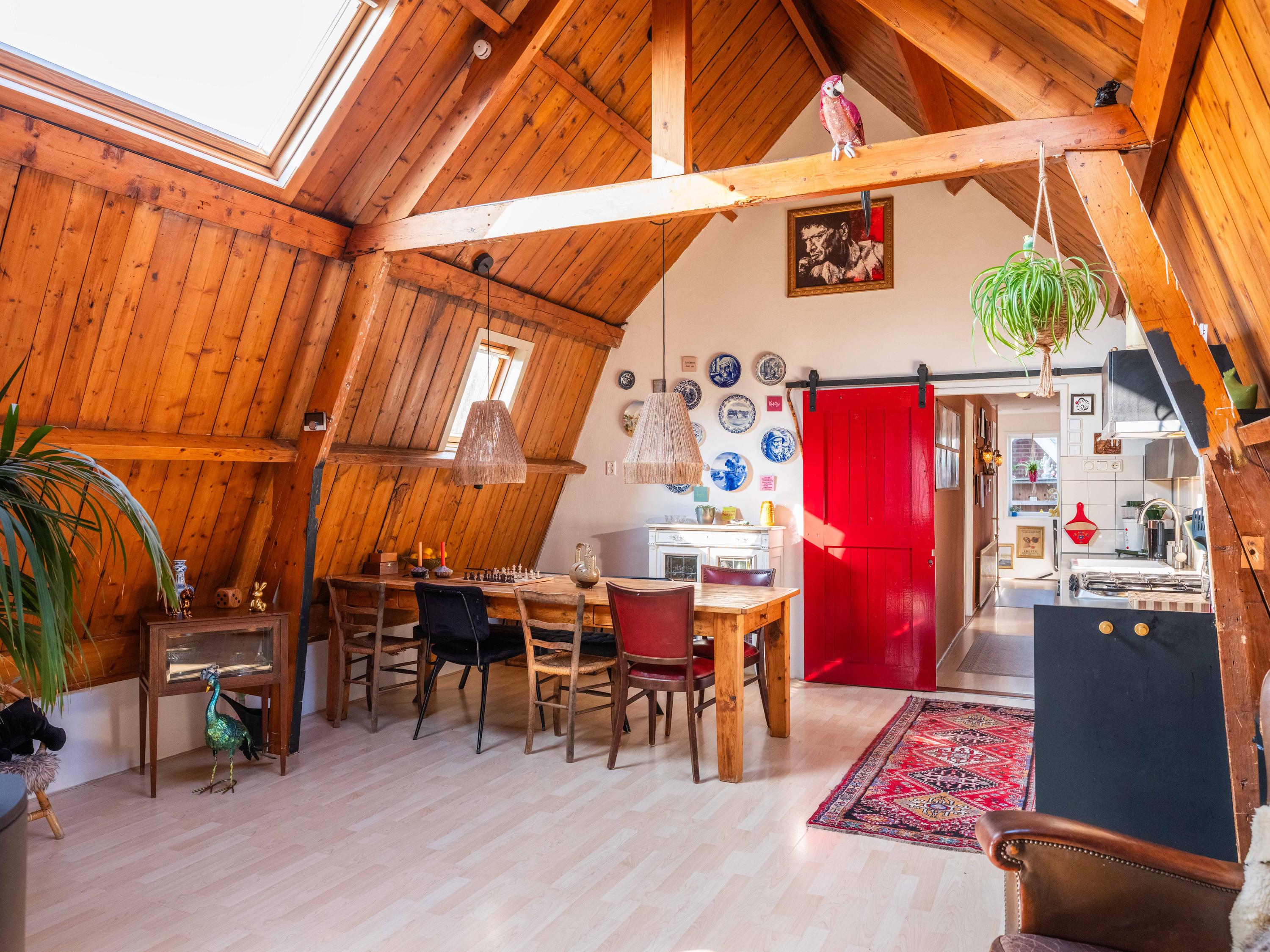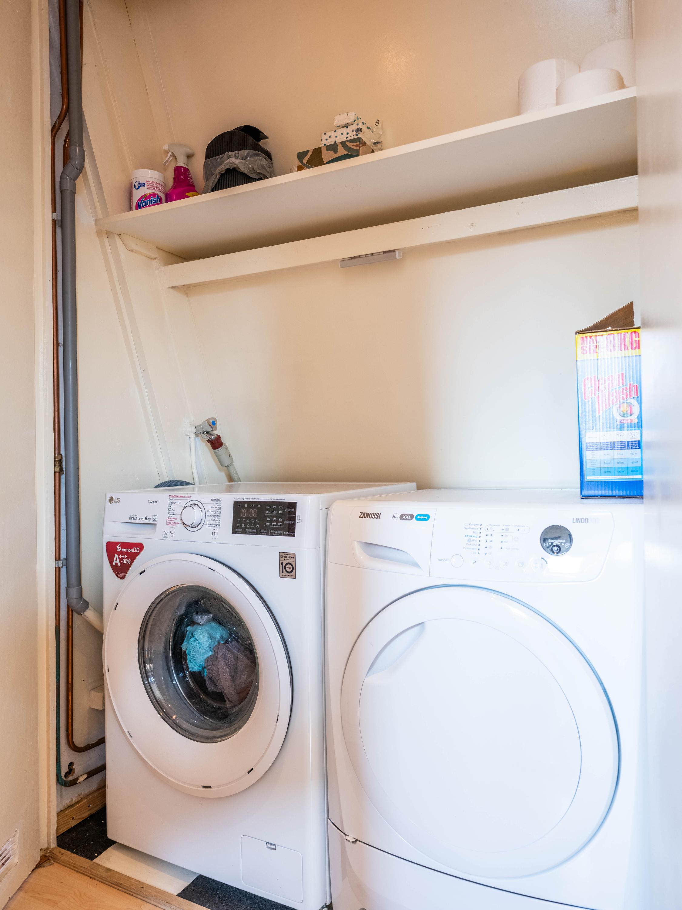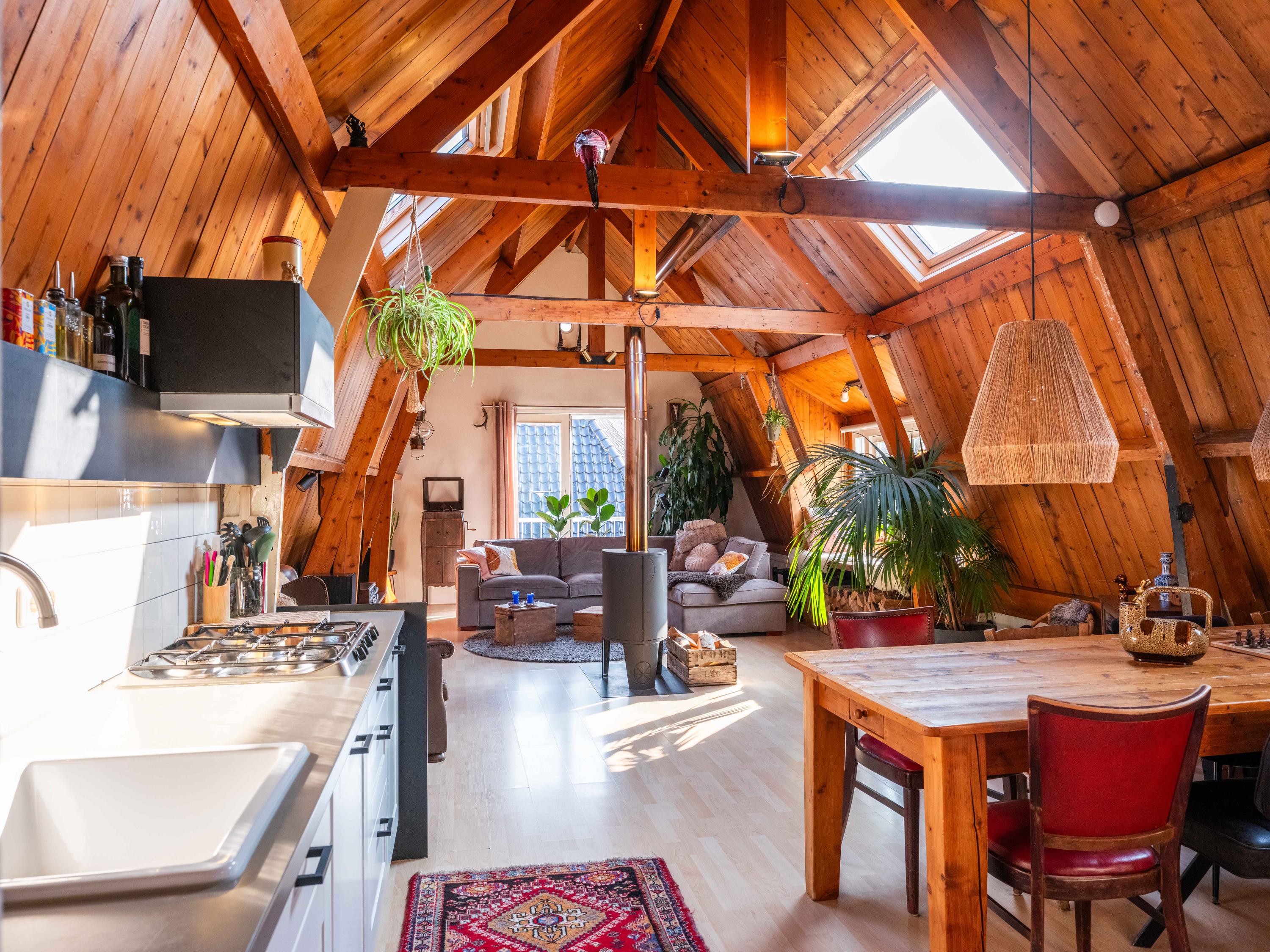 The upstairs apartment (approx. 76 m²) features a very spacious living room with a French balcony and views of Bergen’s two churches. The charming dormer window was fitted with a new frame and insulated glass in 2023 and is currently used as a cozy sitting area. The centrally located wood-burning stove not only creates atmosphere but also provides a pleasant and comfortable indoor climate.