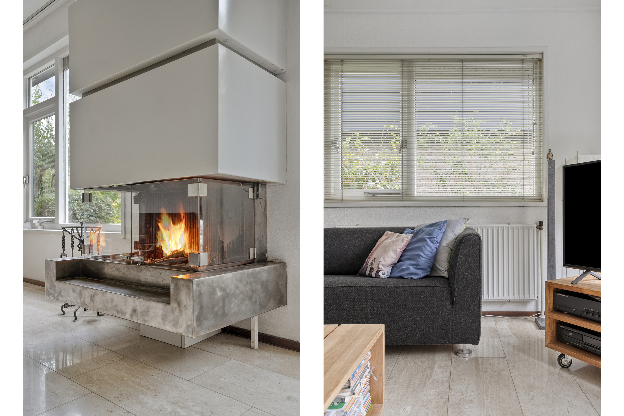 What immediately stands out are the large windows, which provide abundant natural light. The living room features a beautiful natural stone floor with underfloor heating and a cozy fireplace. From the living room, you step directly into the beautifully landscaped backyard. Facing south, the garden offers plenty of privacy and is designed with multiple terraces, perfect for enjoying either sun or shade. The waterfront enhances the open and spacious feel of this location.