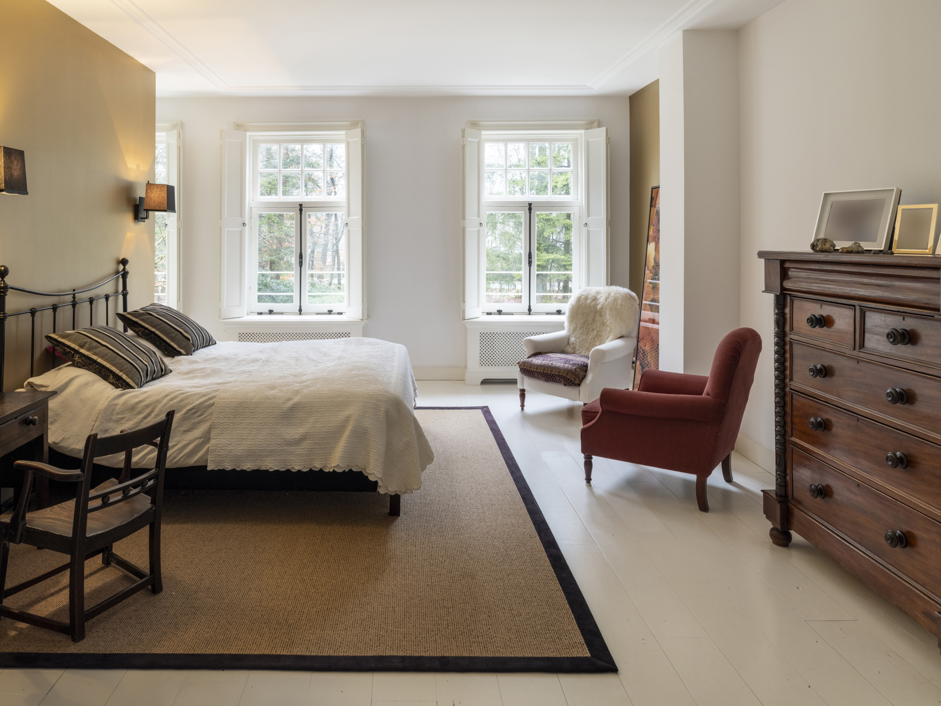 The rear/garden room features a bay window with French doors. Facing nearly due south, the bay window allows abundant light and provides a superb view and connection to the garden and surrounding forest. In addition to central heating, this room includes a wood-burning insert fireplace with a marble mantel.