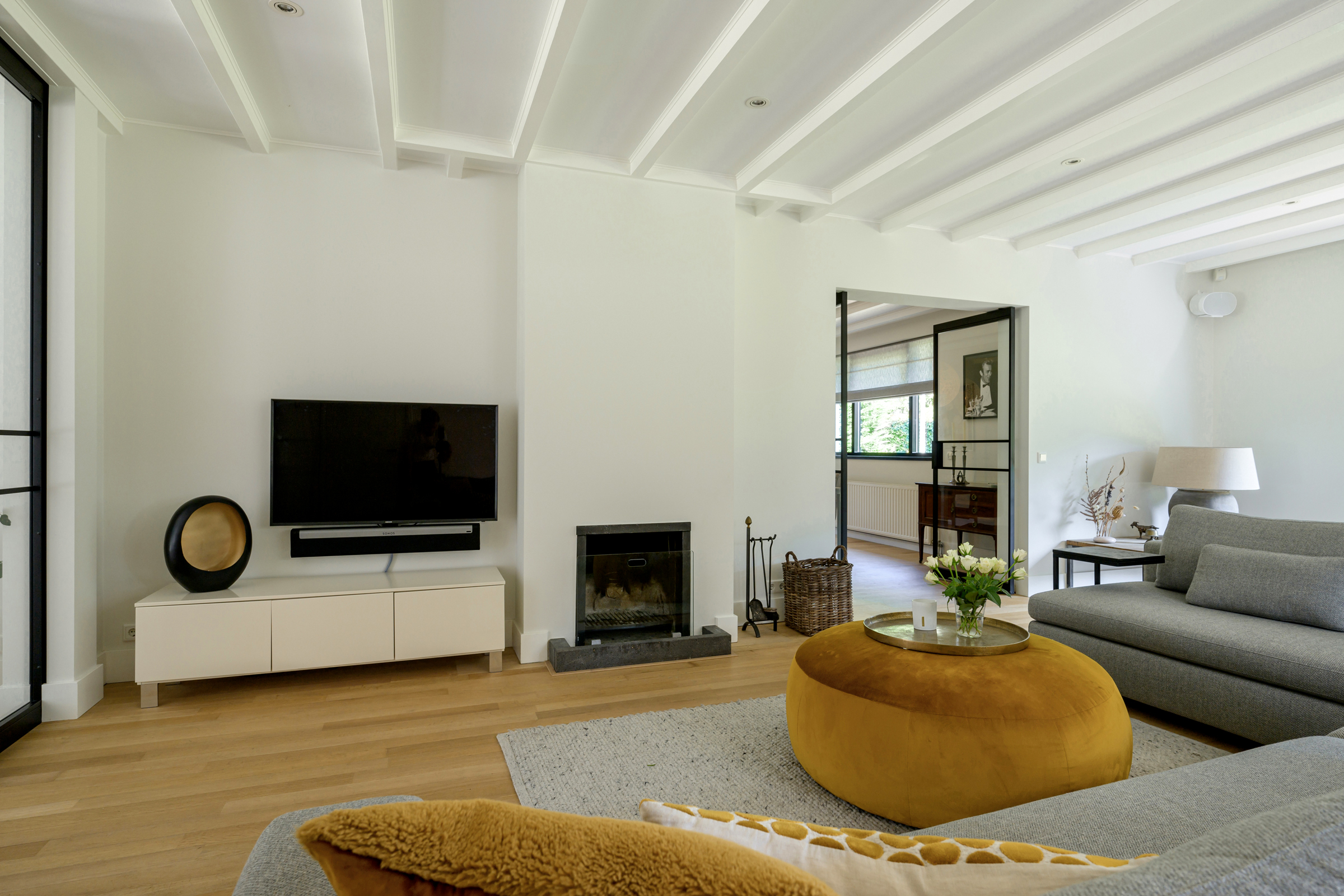 Living room with beautiful natural light and a view of the front garden. The living room is equipped with a fireplace, built-in cupboards, and a (solid) wooden floor.