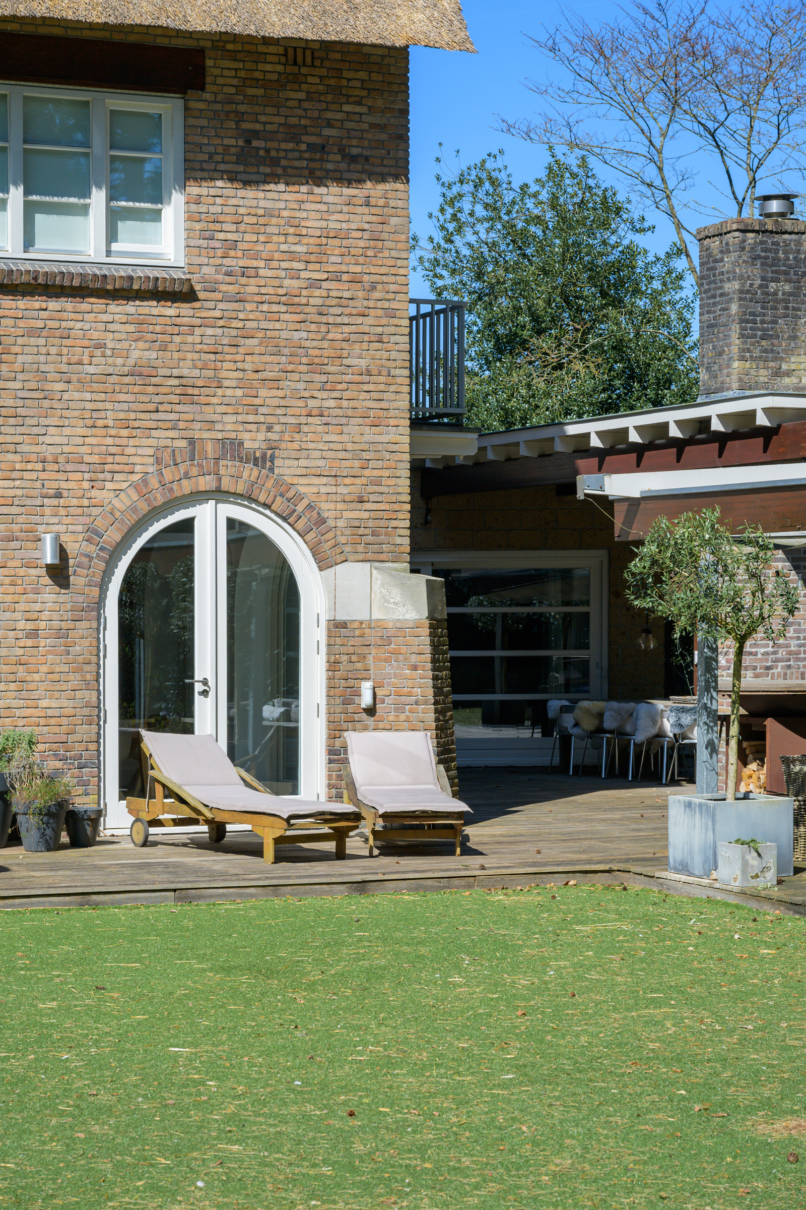 The living room was expanded in 2005. The extension connects nicely to the thatched roof, making the garden doors extra high and offering a fantastic view of the garden. With the windows all around, the living room has a beautiful light. From the living room you have access to the second office / fitness room and through a beautiful sliding door to the kitchen.