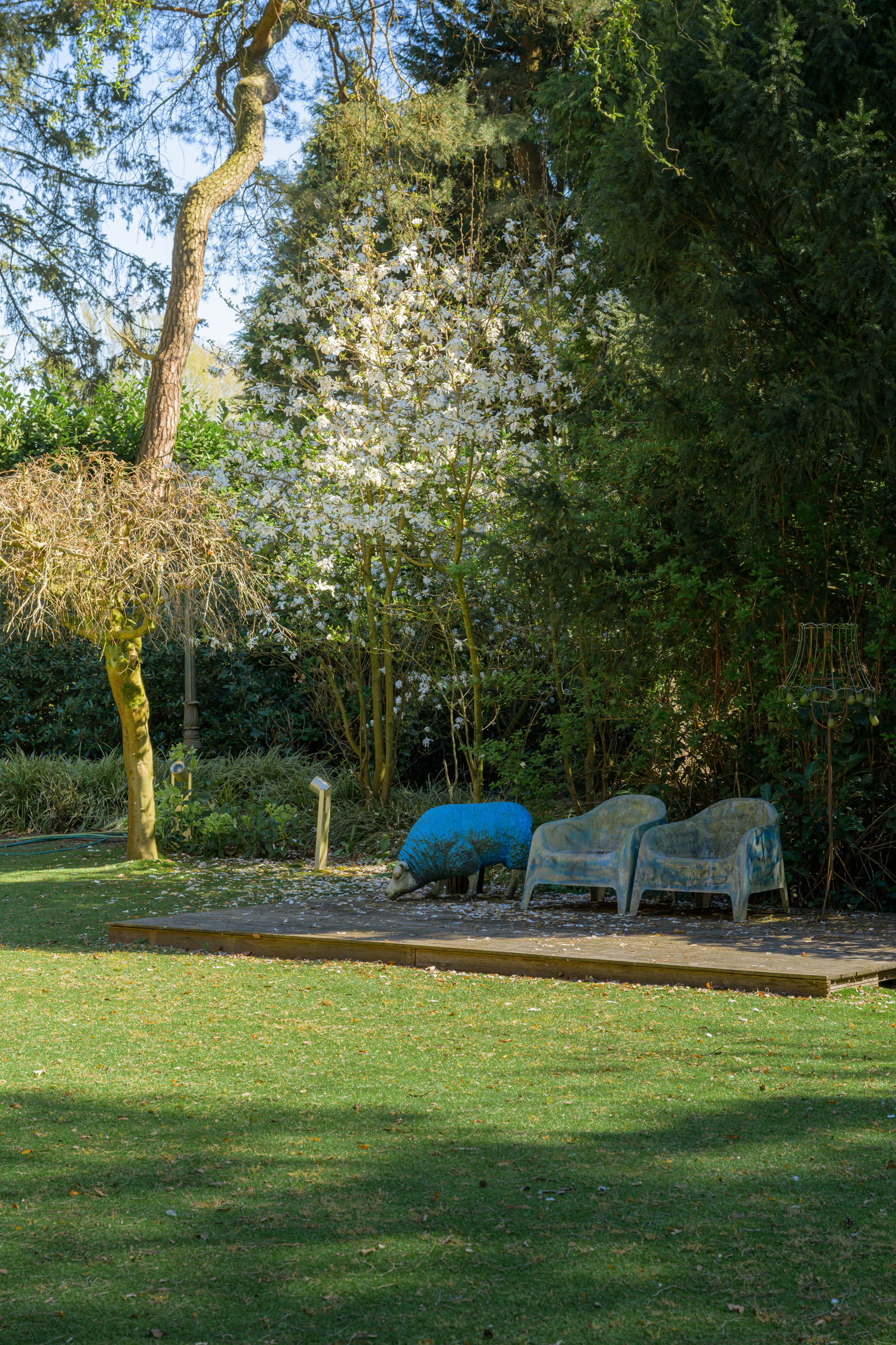 The garden is beautifully landscaped with a variety of terraces, green borders, a pond, a large (artificial) lawn, a wooden shed and mature trees. The garden is equipped with a sprinkler system