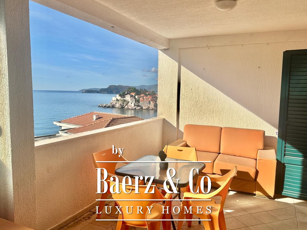Duplex apartment Sveti Stefan welcomes you with a rare union of panoramic sea and mountain views, set within an enviable proximity to the Adriatic. This 142 m² residence occupies the third floor of a three-storey building, just 50 metres from the shore and walking distance from the celebrated Milocer park and Queen's beach. Seamlessly connected to the main road, the setting offers gentle rhythm between nature and ease of access.