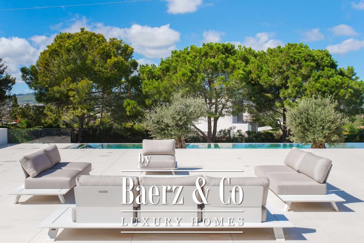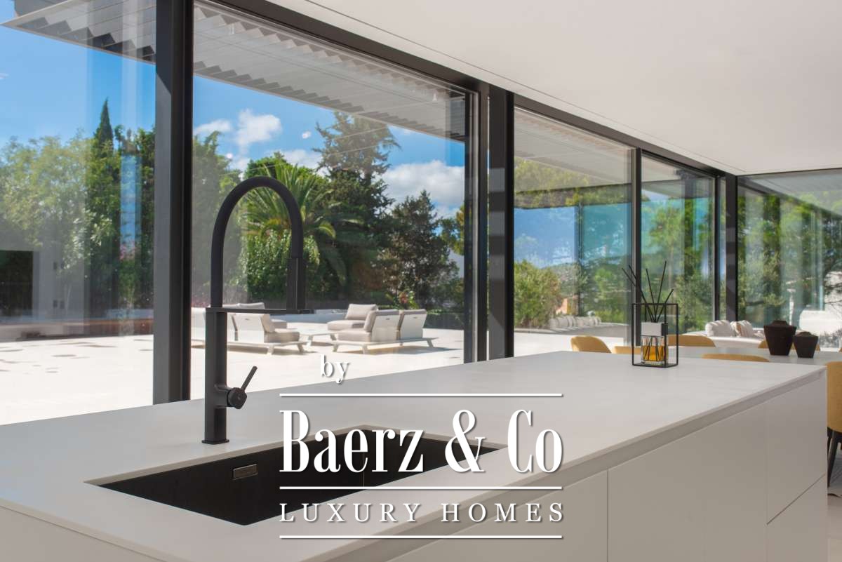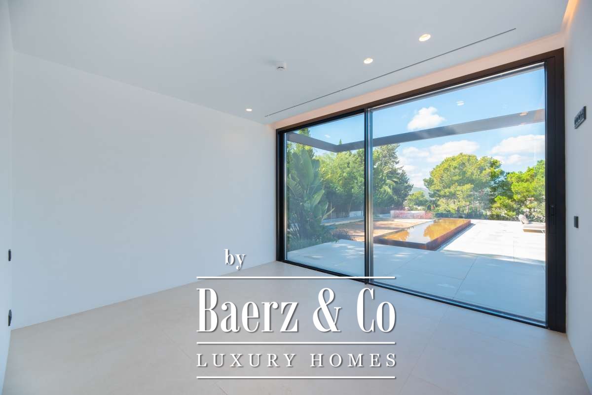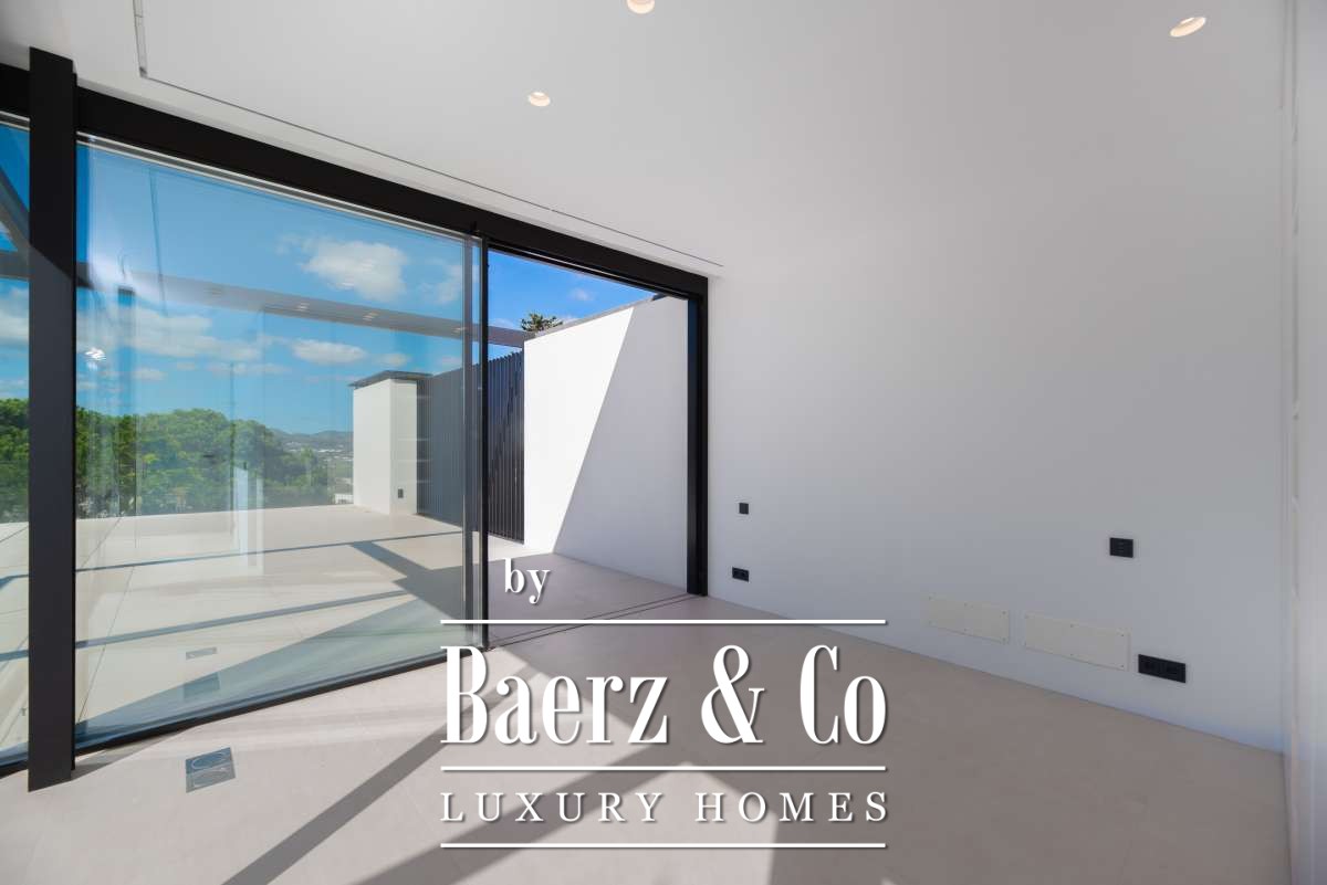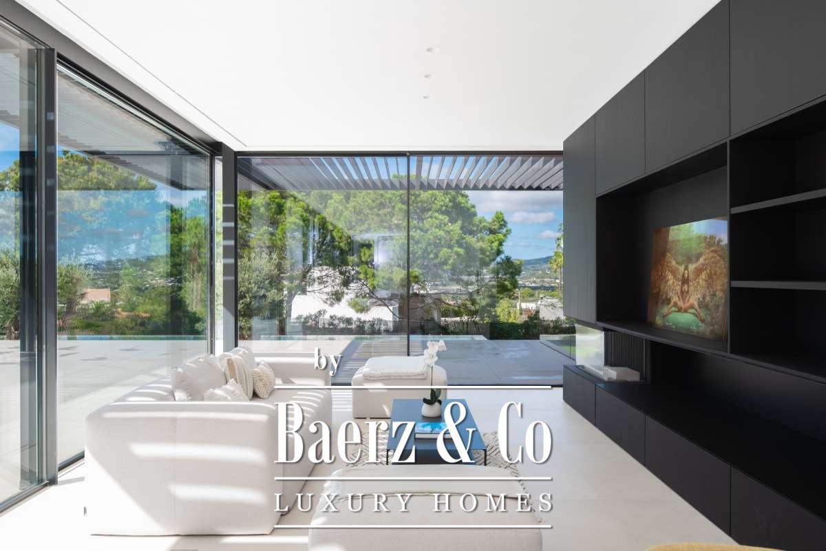 The surroundingsThis immaculate villa is located in the highly sought-after residential area of Can Bessó, on the outskirts of Ibiza Town, close to Jesús. The charming town of Jesús is just a 5-minute drive away, where you will find all your daily necessities, including supermarkets, shops, and local bars and restaurants. For more vibrant energy, the historic Ibiza Town is only 10 minutes away. Here, you’ll discover a lively marina, rooftop bars, and a variety of dining options, from gourmet restaurants to local eateries. In addition, if you're looking for a relaxing beach day, the wide sandy beach of Talamanca is reachable within an 8-minute drive. You can soak up the sun on the loungers, enjoy seaside dining, or partake in water sports, all while admiring the stunning views of Talamanca Bay. If you prefer unspoilt coves, Cala Olivera and Cala Espart are just 15 minutes away. On top of that, the elegant Marina Botafoch area is only 10 minutes from the villa, where you can stroll past impressive superyachts, high-end restaurants, luxury designer boutiques, and Ibiza’s iconic night clubs like Pacha and Lío. This location provides the perfect balance of peaceful residential living while being close to Ibiza’s hotspots, beaches, and essential amenities.The villaThis brand-new villa offers 4 bedrooms and 4 bathrooms spread across 2 levels. It is a masterpiece of contemporary luxury, crafted with high-quality materials and move-in ready. The sleek design combines white foundations with black accents, creating a refined and sophisticated aesthetic. One of the standout features is the extensive use of glass, allowing natural light to flood the space. The open-plan living area flows effortlessly onto the outdoor terraces, providing a true Mediterranean indoor-outdoor living experience. In addition, a built-in entertainment center offers space for a large television, making it perfect for cozy family gatherings or relaxing movie nights. The modern, fully-equipped kitchen features a sleek kitchen bar where you can enjoy your morning coffee or evening drinks. The bedrooms
