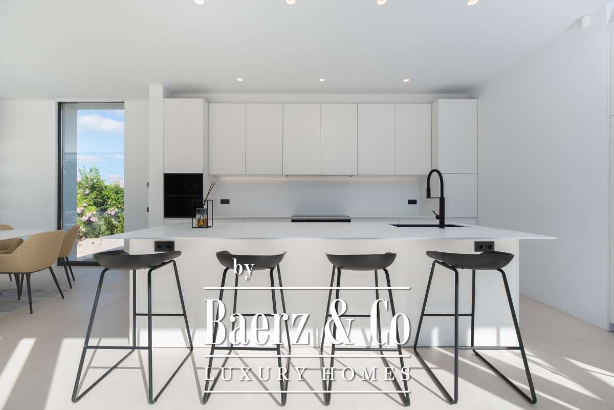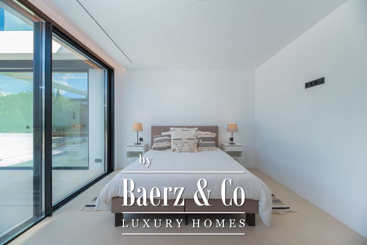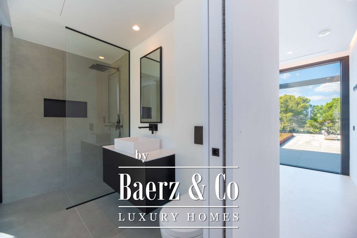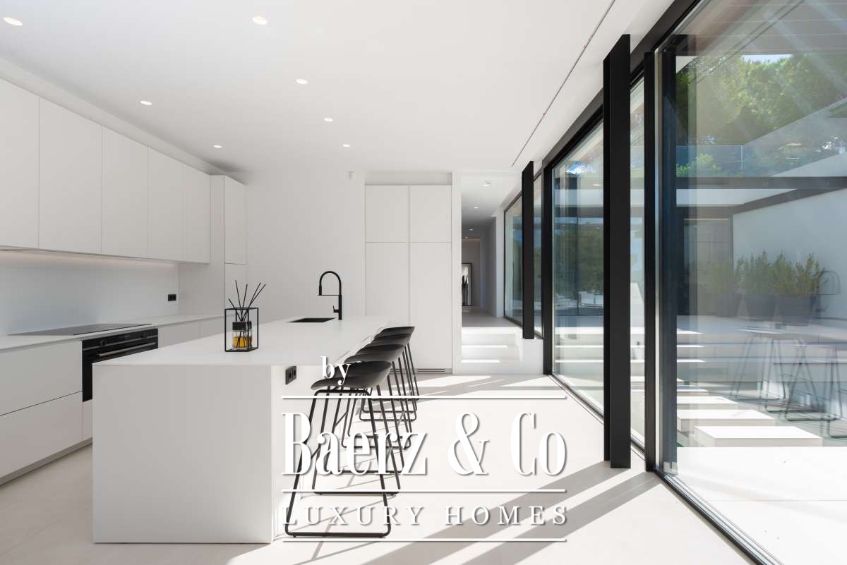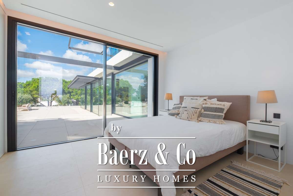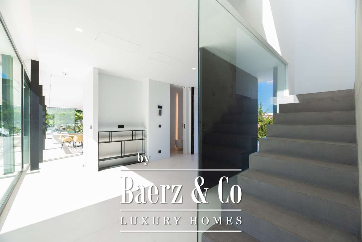 The surroundingsThis immaculate villa is located in the highly sought-after residential area of Can Bessó, on the outskirts of Ibiza Town, close to Jesús. The charming town of Jesús is just a 5-minute drive away, where you will find all your daily necessities, including supermarkets, shops, and local bars and restaurants. For more vibrant energy, the historic Ibiza Town is only 10 minutes away. Here, you’ll discover a lively marina, rooftop bars, and a variety of dining options, from gourmet restaurants to local eateries. In addition, if you're looking for a relaxing beach day, the wide sandy beach of Talamanca is reachable within an 8-minute drive. You can soak up the sun on the loungers, enjoy seaside dining, or partake in water sports, all while admiring the stunning views of Talamanca Bay. If you prefer unspoilt coves, Cala Olivera and Cala Espart are just 15 minutes away. On top of that, the elegant Marina Botafoch area is only 10 minutes from the villa, where you can stroll past impressive superyachts, high-end restaurants, luxury designer boutiques, and Ibiza’s iconic night clubs like Pacha and Lío. This location provides the perfect balance of peaceful residential living while being close to Ibiza’s hotspots, beaches, and essential amenities.The villaThis brand-new villa offers 4 bedrooms and 4 bathrooms spread across 2 levels. It is a masterpiece of contemporary luxury, crafted with high-quality materials and move-in ready. The sleek design combines white foundations with black accents, creating a refined and sophisticated aesthetic. One of the standout features is the extensive use of glass, allowing natural light to flood the space. The open-plan living area flows effortlessly onto the outdoor terraces, providing a true Mediterranean indoor-outdoor living experience. In addition, a built-in entertainment center offers space for a large television, making it perfect for cozy family gatherings or relaxing movie nights. The modern, fully-equipped kitchen features a sleek kitchen bar where you can enjoy your morning coffee or evening drinks. The bedrooms