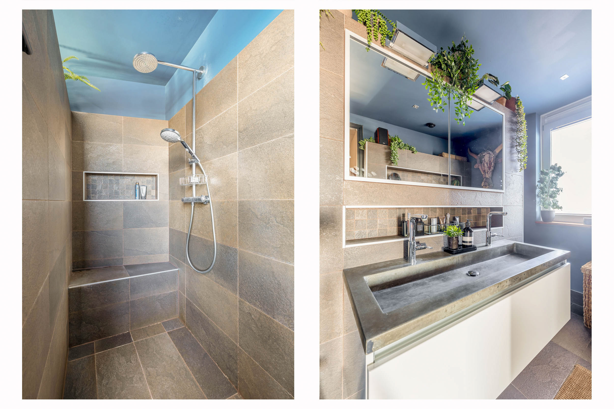 Entrance with wardrobe and guest toilet. The extremely spacious living room (85 m²) boasts incredible natural light thanks to a massive 7-meter-high window and an impressive mezzanine with an industrial-style balustrade. The entire floor is finished with luxurious Italian stone flooring and underfloor heating. On both sides of the living room, you’ll find expansive rooftop terraces, facing southwest and southeast respectively – 98 m² total. Enjoy all-day sun and phenomenal views. The skyline of Rotterdam feels almost within reach.