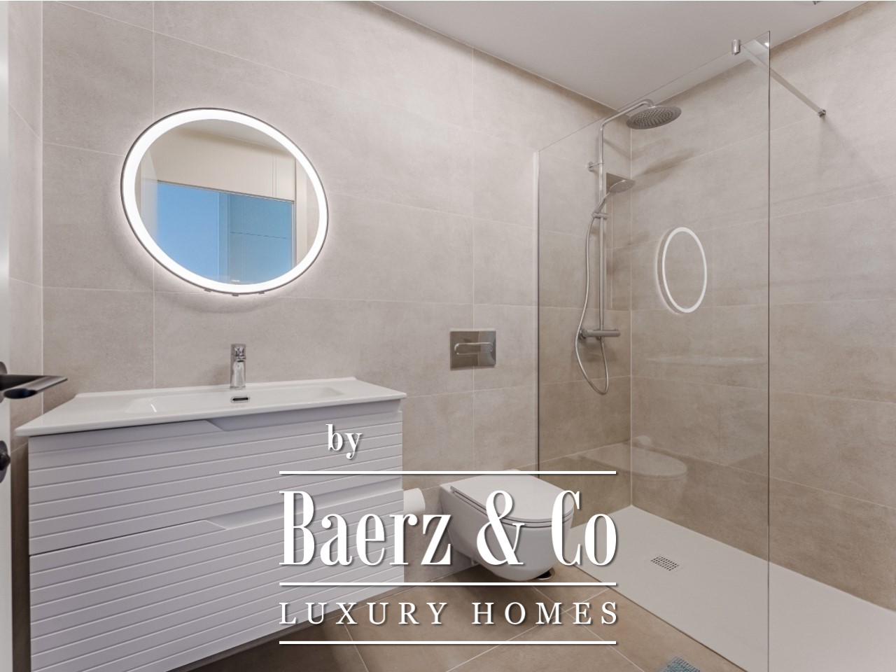 The sense of space is brought to life by interiors that balance comfort with modern design. The penthouse features three bedrooms, two bathrooms with showers, including a master suite with an en-suite bathroom and private dressing area. Fitted wardrobes and luxurious beds speak to a thoughtful integration of function and comfort. Every room is illuminated by elegant decorative lighting and framed by designer furnishings, while high-end appliances from Bosch and Miele ensure a seamless domestic experience.