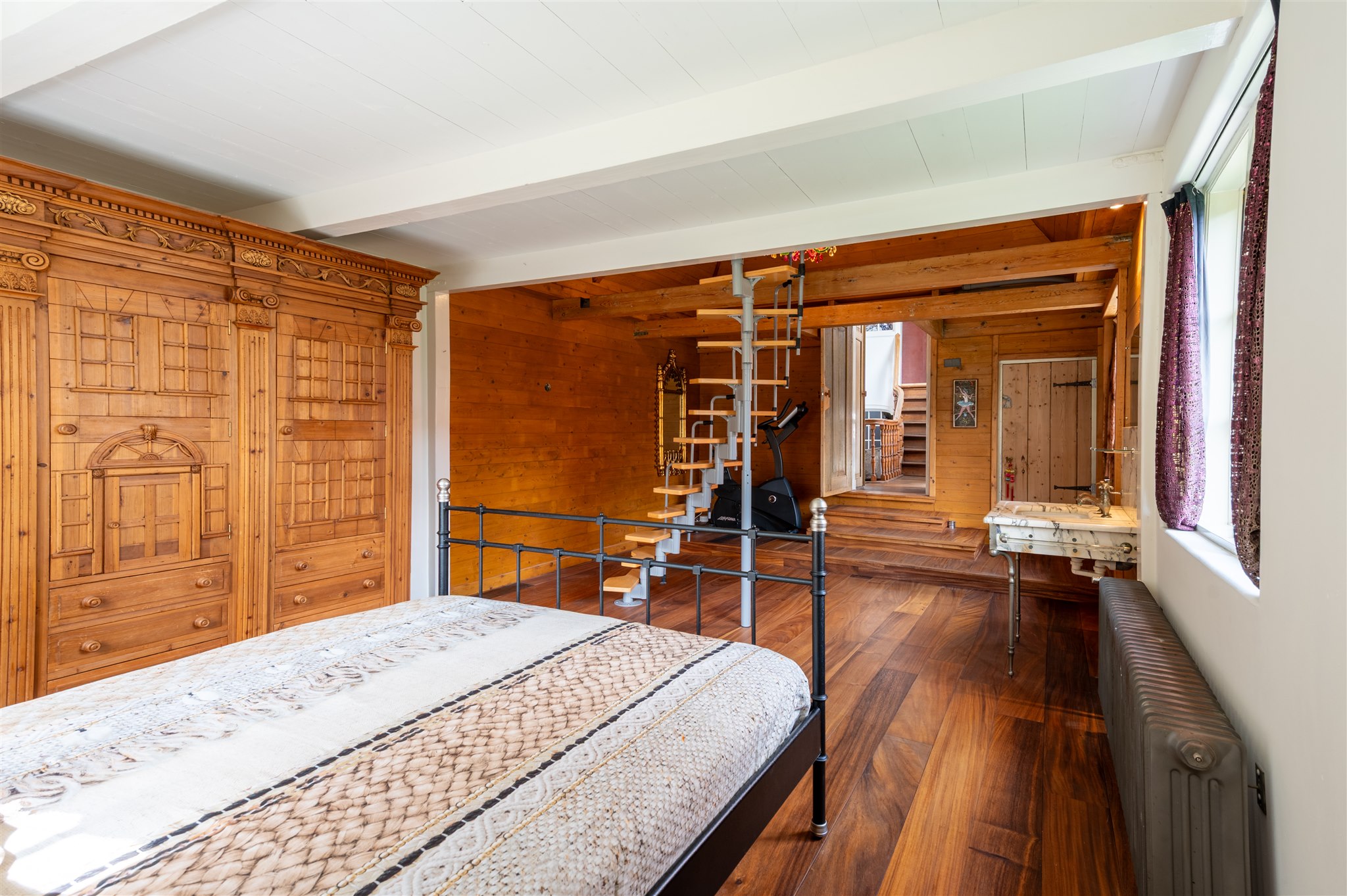 An inviting attic floor with roof windows and ample light, offering a versatile space for work, play, or relaxation. This floor also includes a bedroom with a half-recessed balcony facing south, as well as a technical room housing the heat pumps and solar panel inverters.
