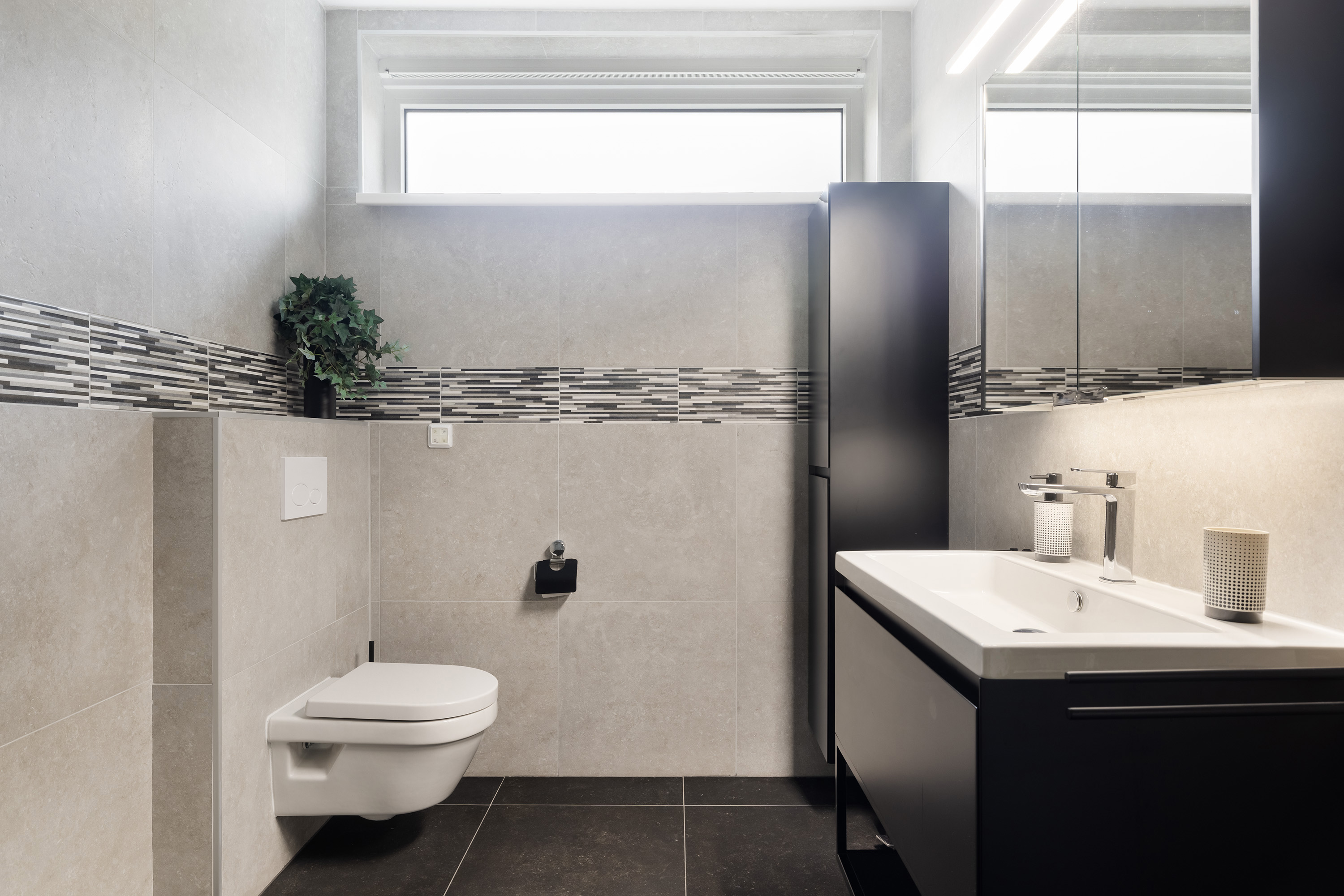 Fully tiled and stylishly finished with a wall-hung toilet and hand basin.