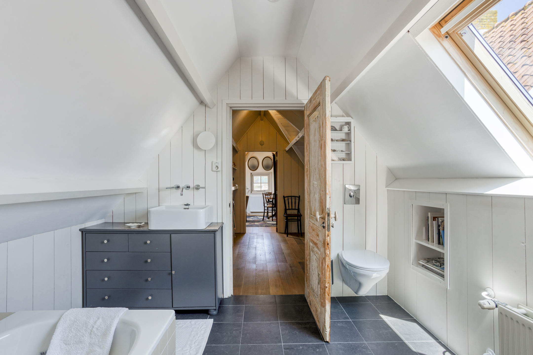The transition to the rear house is formed by a spacious hallway, which not only functions as a practical connecting space but also features a shower and a toilet with washbasin.