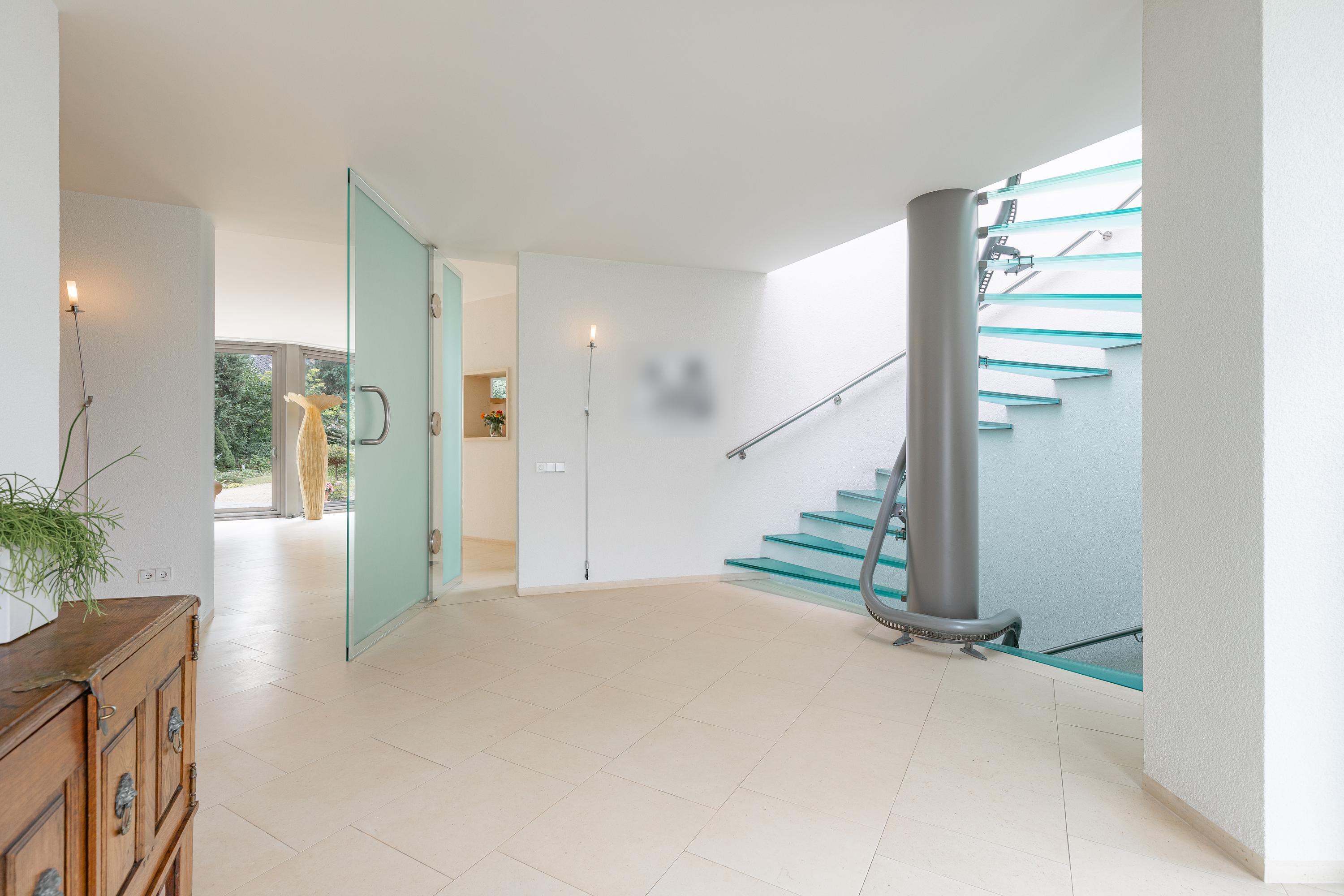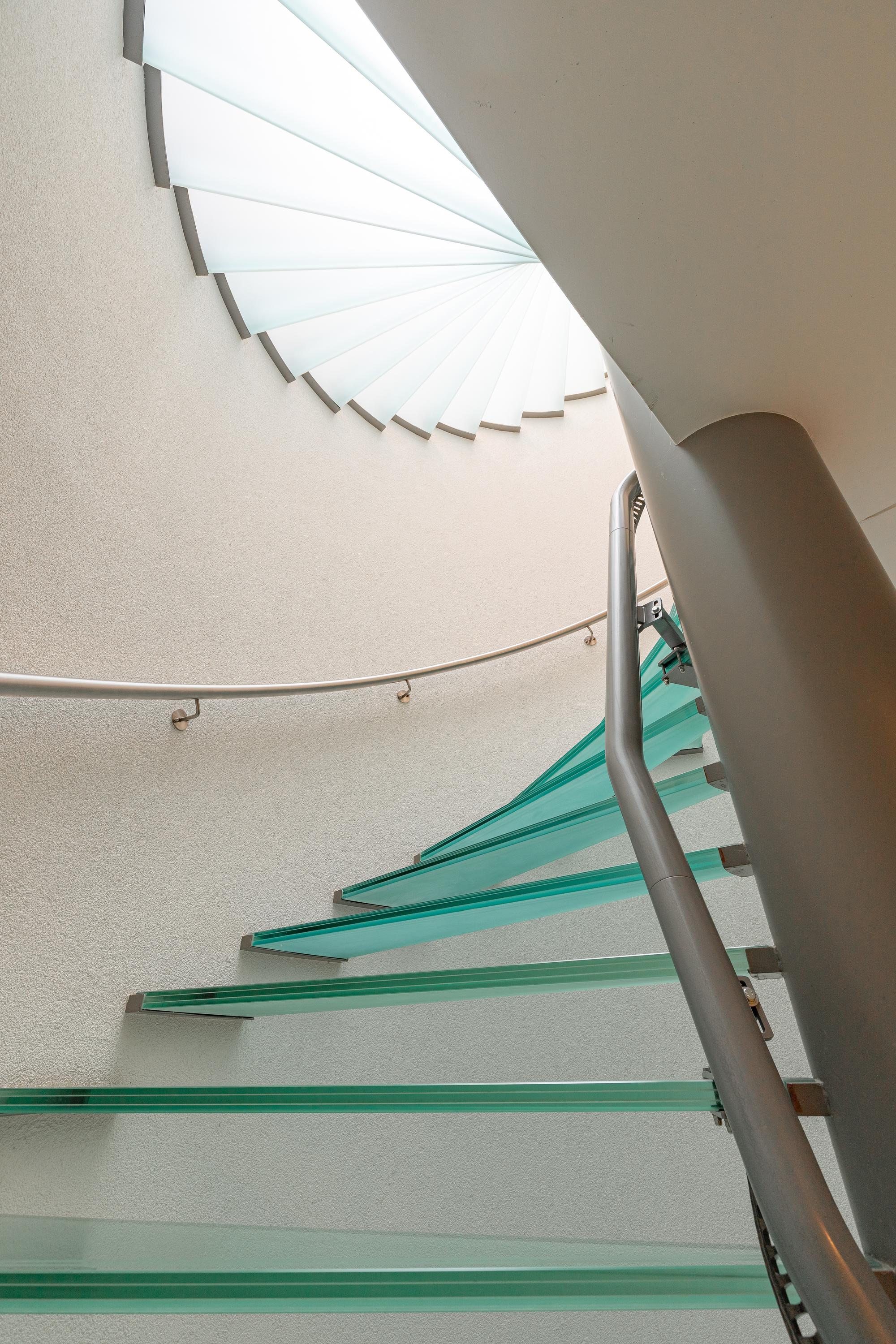 The imposing staircase is built in a circular shape and runs from the basement to the landing on the second floor. The steel tube central serves as a laundry chute and for fixing the hard glass stair treads.