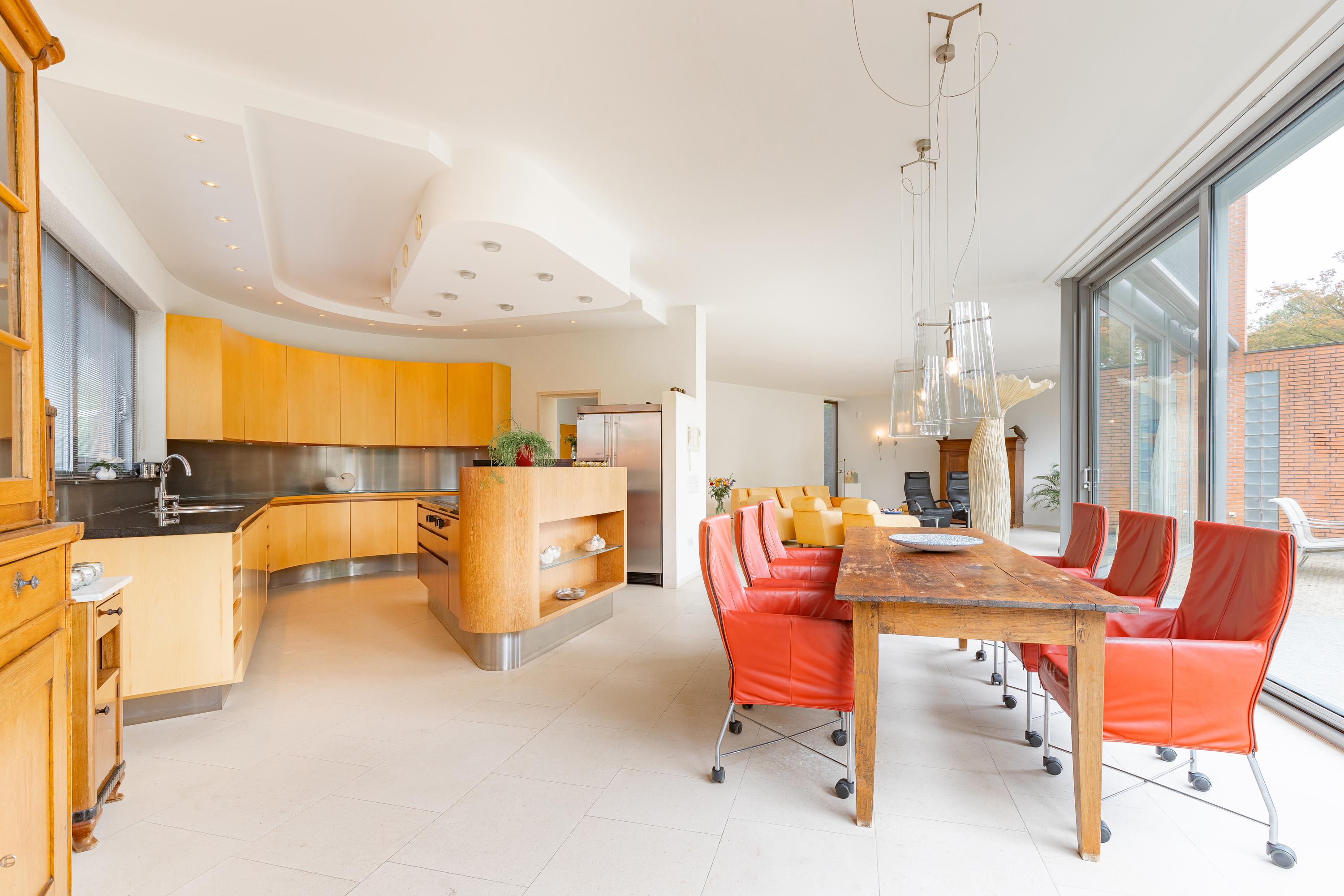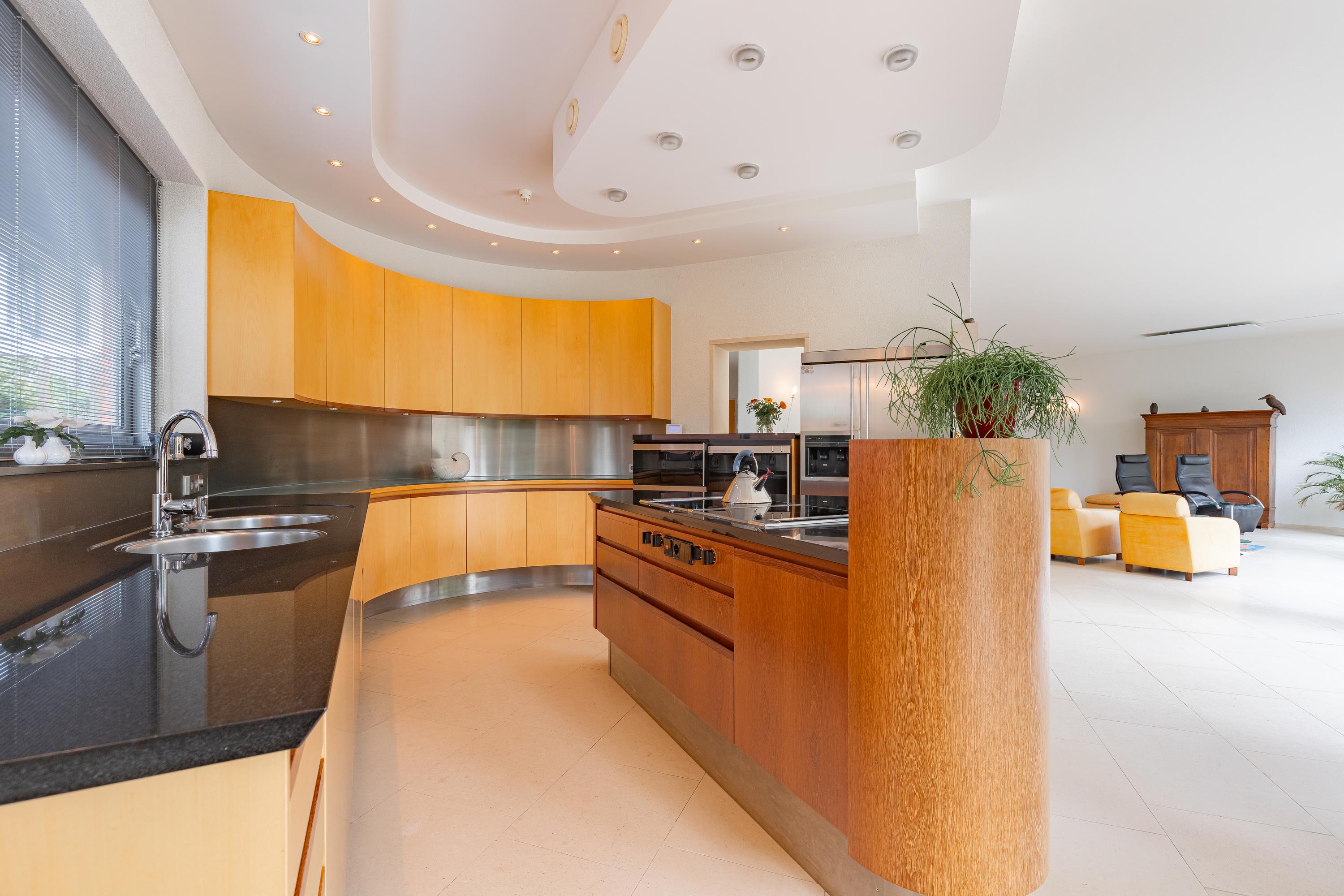 The semi-open kitchen features a beautiful kitchen installation in circular arrangement along the wall and a centrally located kitchen island. Equipped with black granite worktop and the following appliances: convection oven, ceramic hob with integrated double hood, dishwasher and fridge-freezer. The kitchen has attractive recessed lighting in the ceiling.