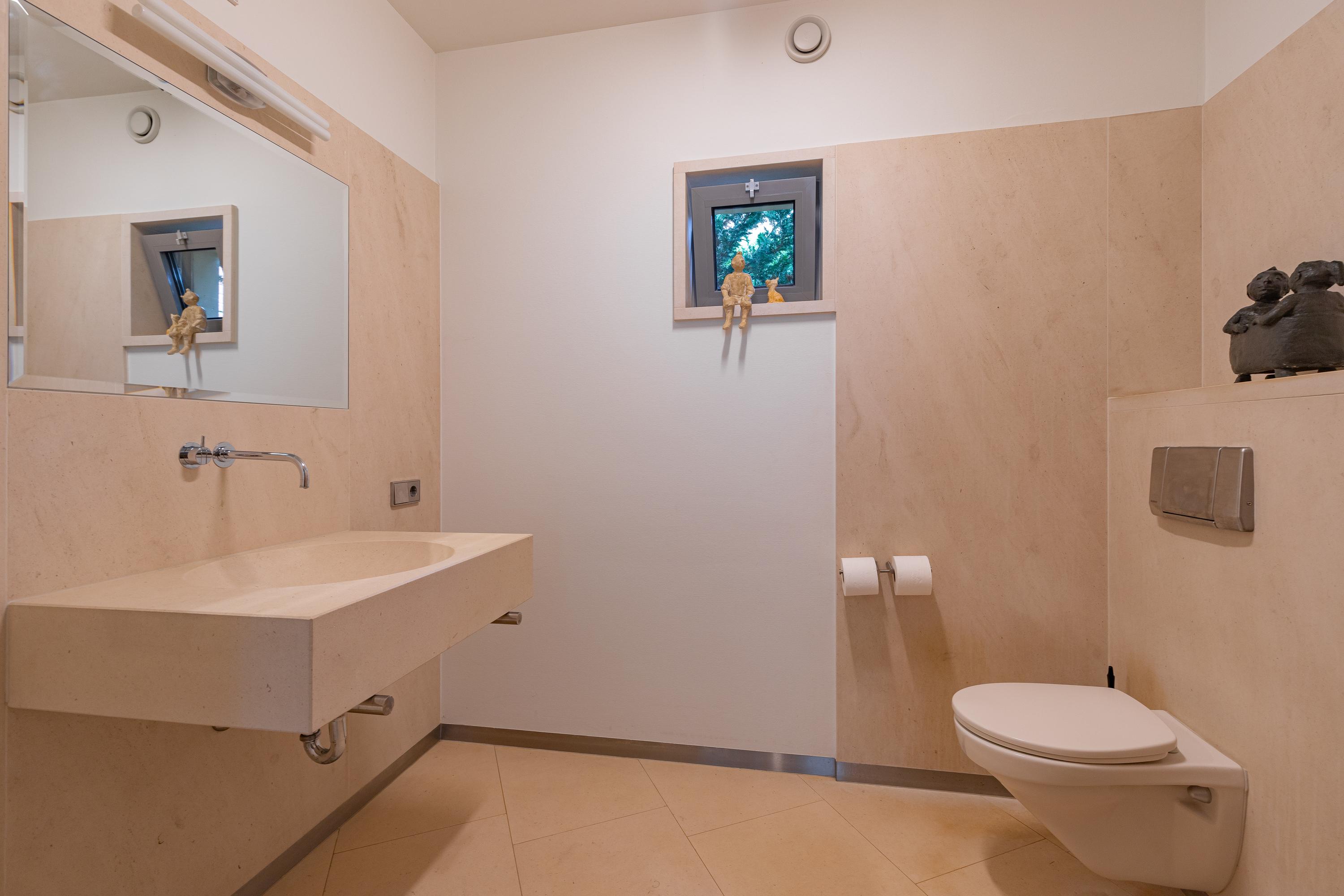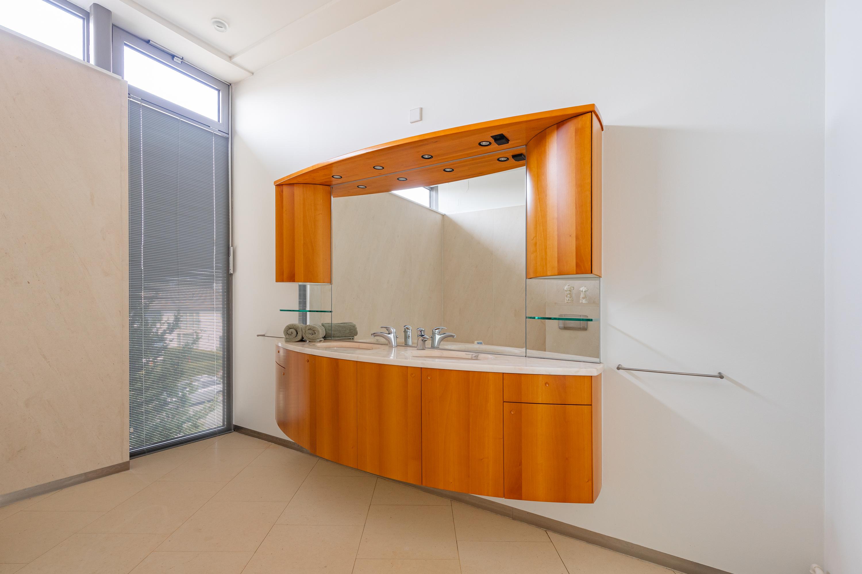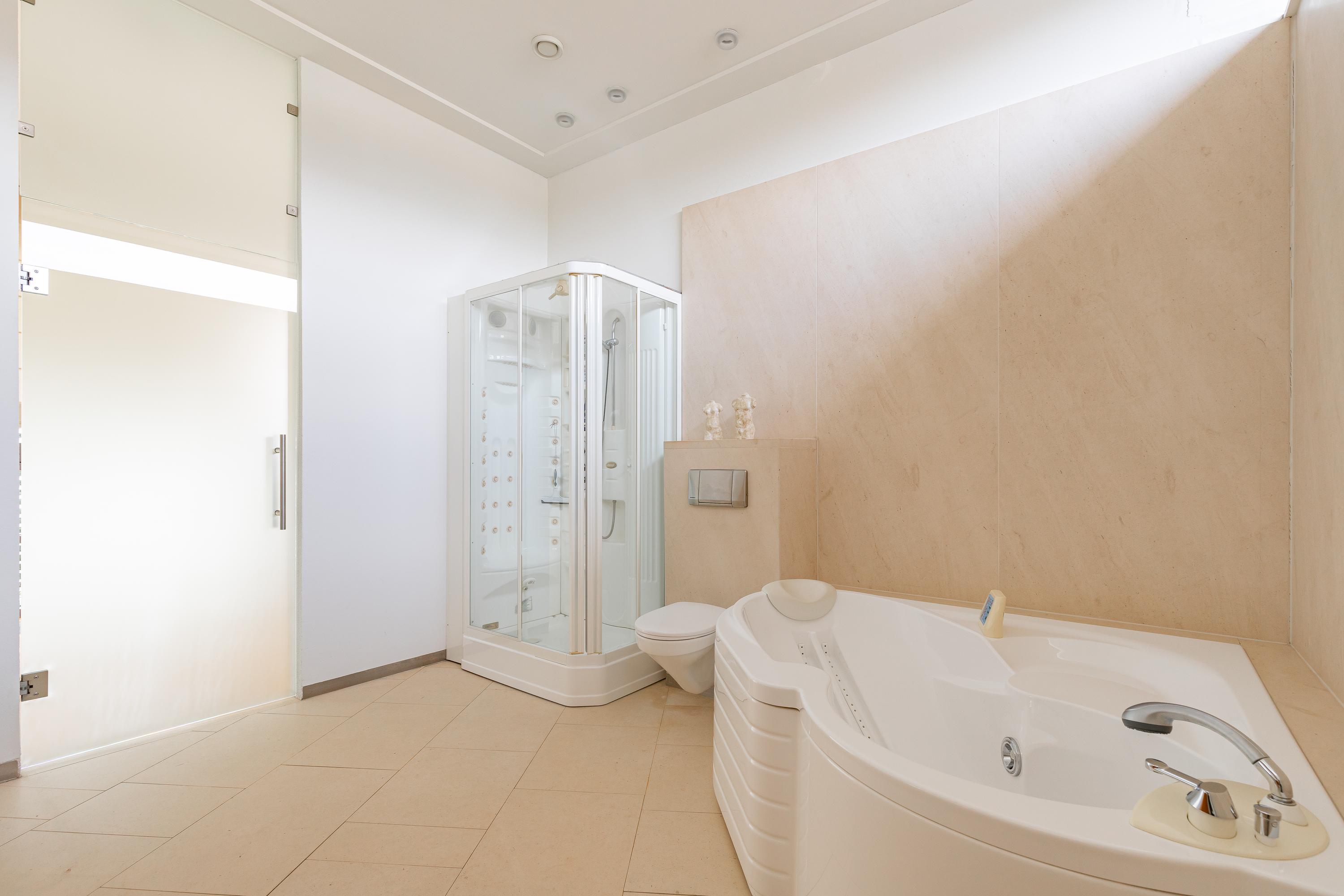 Spacious landing with optimal light through the central skylight. From the landing access to the three very spacious bedrooms and beautiful bathroom with shower, bathroom cabinet and toilet. The bathroom has a skylight. The floor and wall finishes are done in a light color of Portuguese slate. The master bedroom, with large aluminum sliding doors to the sunny terrace, offers plenty of space for both wardrobe and sleeping space. Immediately adjacent to this room is the master bathroom. Accessible through hard glass door with Jacuzzi corner bathtub, shower/steam room, floating toilet and bathroom cabinet with two sinks.