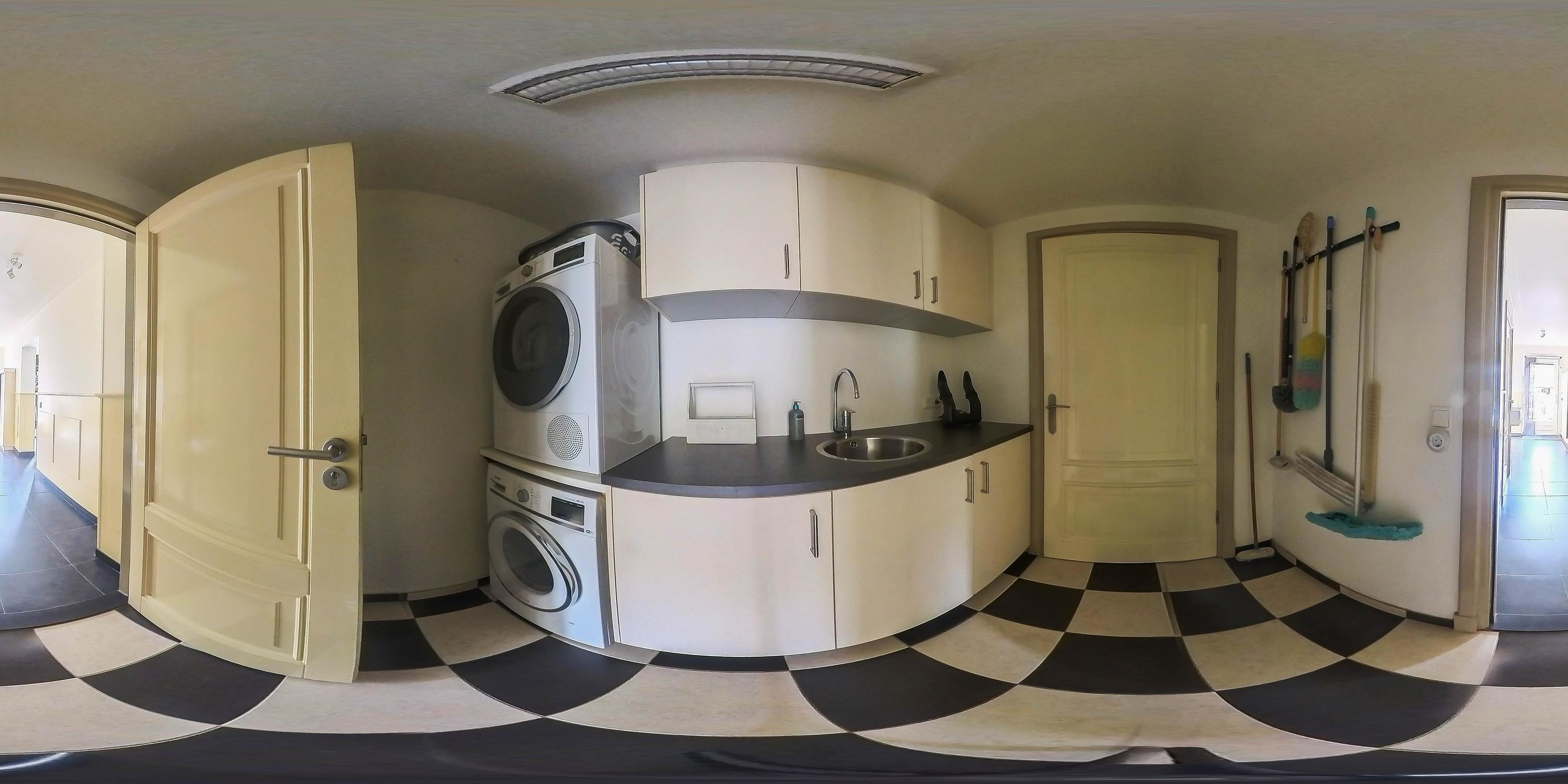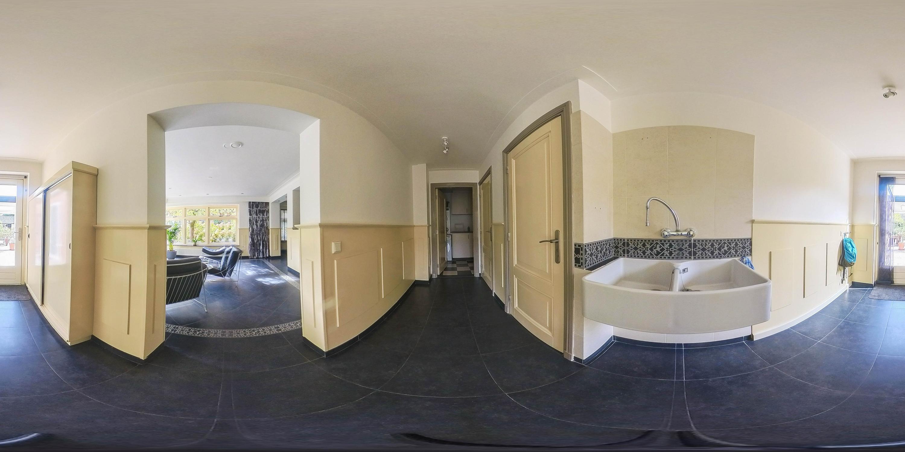 window provides access to the living room. The living room has a marble tiled floor with underfloor heating, stucco walls and a stucco ceiling with decorative mouldings. Thanks to the many windows and a large bay window, the room enjoys plenty of natural light, creating a spacious effect. Adjacent to the living room is a versatile space, ideal for an inspiring workspace or a cosy play area. The space can be closed off with a sliding door with stained glass. The kitchen has a corner layout and is equipped with a 5-burner gas hob, combination microwave/oven, sink, American fridge and dishwasher. Various base and wall cabinets provide storage space. There is enough space to place a dining table. The kitchen has a tiled floor with bis. The walls are partly finished with sleek stucco and partly with wooden panelling. The ceiling has stucco with decorative mouldings. The kitchen is open to the adjoining garden room. Here too, large windows provide a sea of light and a beautiful view of the surrounding garden. A wonderful place to relax! The walls are partly finished with sleek stucco and partly with wooden panelling. The ceiling is also finished with stucco and decorative mouldings. French doors provide access to the garden. There is also access to the utility room from here. The utility room is a practical space, equipped with a sink, a storage cupboard and a fixed cupboard wall with sliding doors. There is also a toilet. A door provides access to the garden. You can also reach the rear of the house from this room.