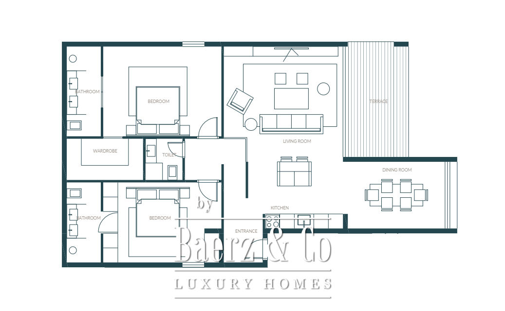2nd floor apartment: living room with kitchen and dining table, 2 bedrooms, 2 bathrooms, a toilet and a terrace.