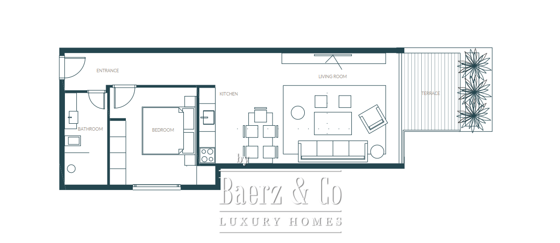 3rd floor apartment 1: living room with kitchen and dining table, a bedroom, a bathroom and a terrace.