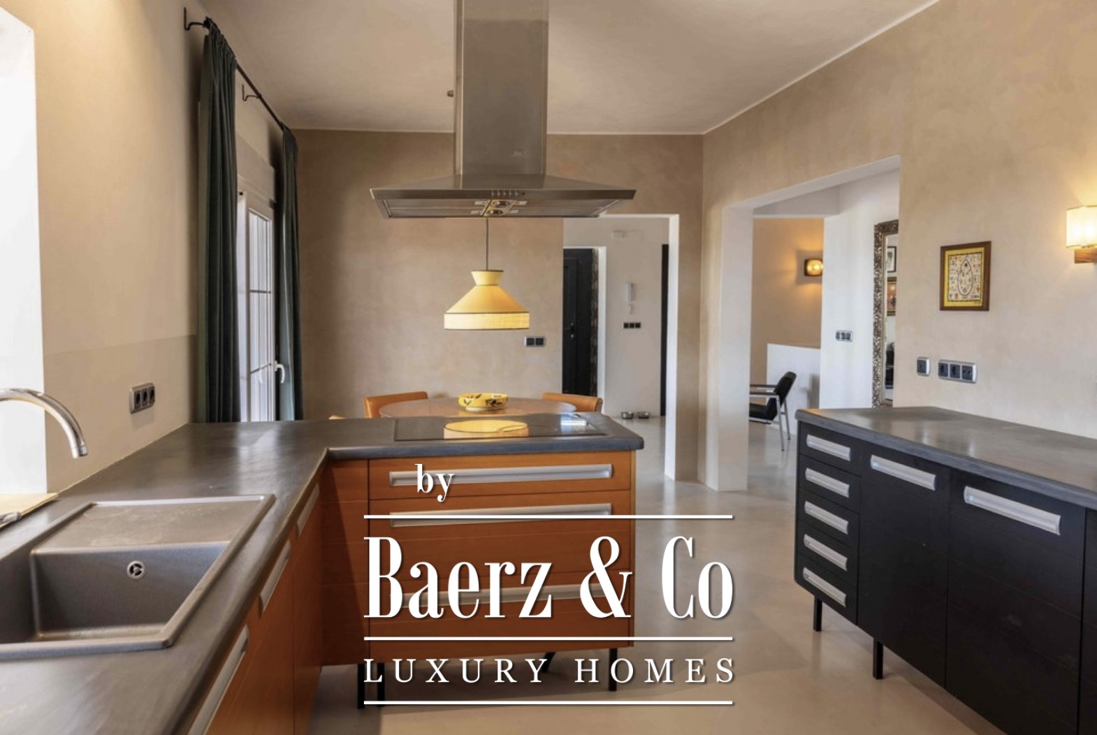 A staircase leads to the lower level of the property, where the 4 independent studio apartments are located — each designed to a high standard. All offer a private kitchenette, an en-suite bathroom and access to individual terraces that connect seamlessly to the landscaped garden.