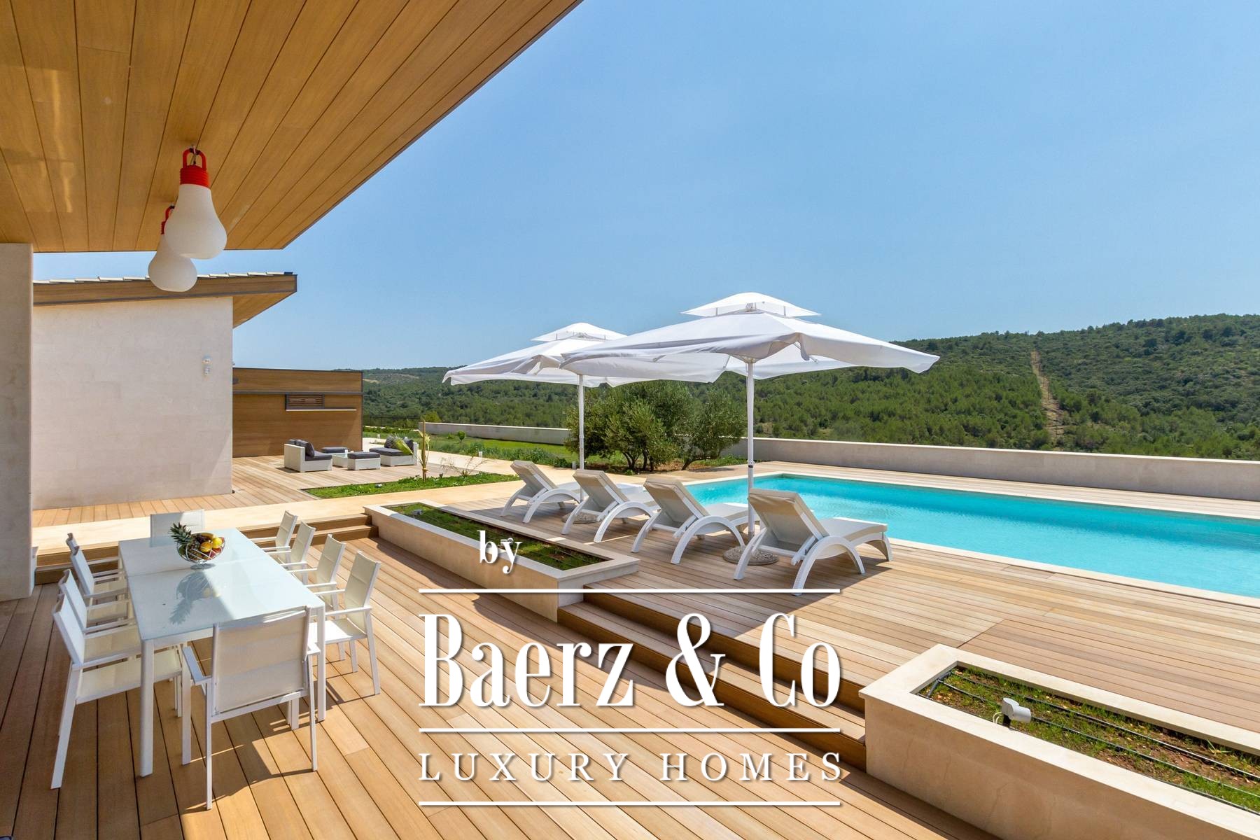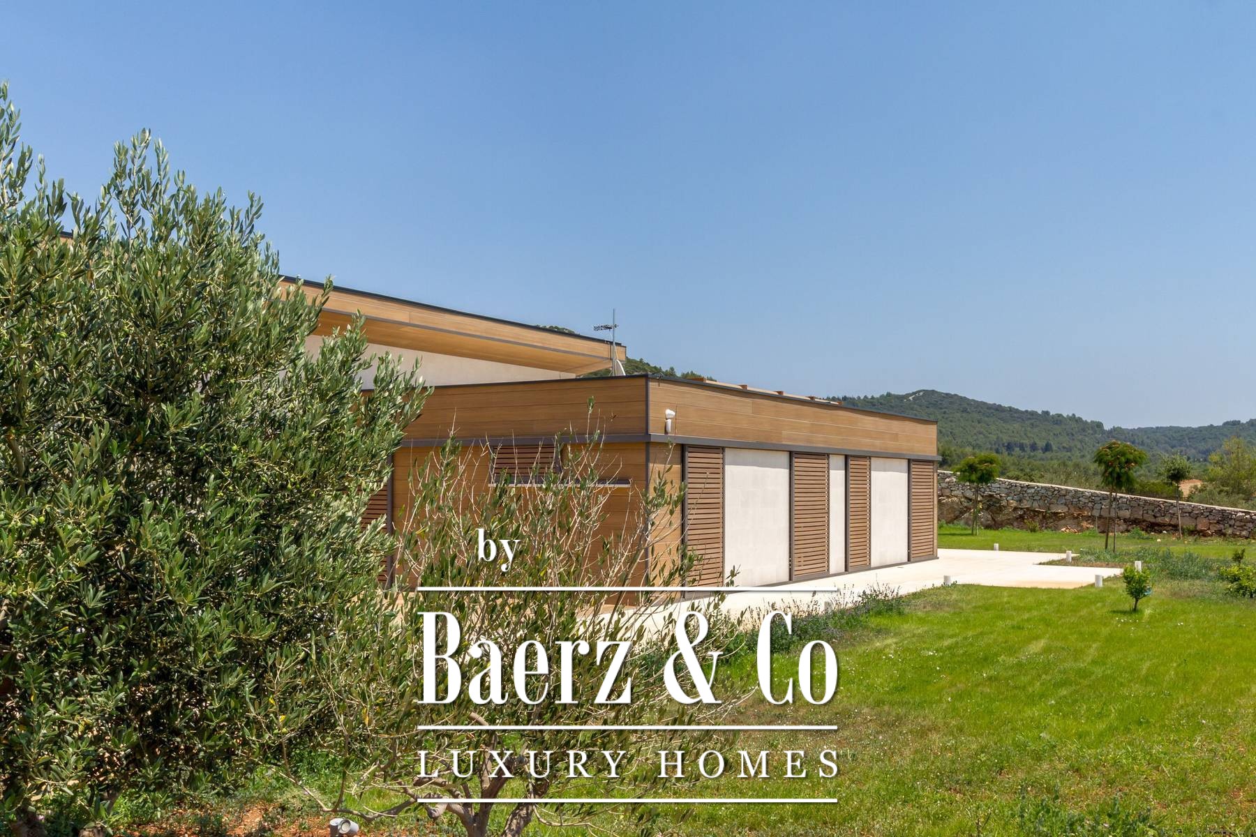 and three bedrooms, one of which has an attached bathroom. In the basement there is another room with a bathroom, a wine cellar, and a spa area (hot tub, massage table, gym and sauna).The outdoor space is refined with a barbecue, a lighted tennis court, a bowling alley and a detached garden house with a studio apartment. The facility is equipped with a high-end electronic locking system and a video surveillance system and an alarm for additional security.It is less than two kilometers from the beautiful Pokrivenik bay.