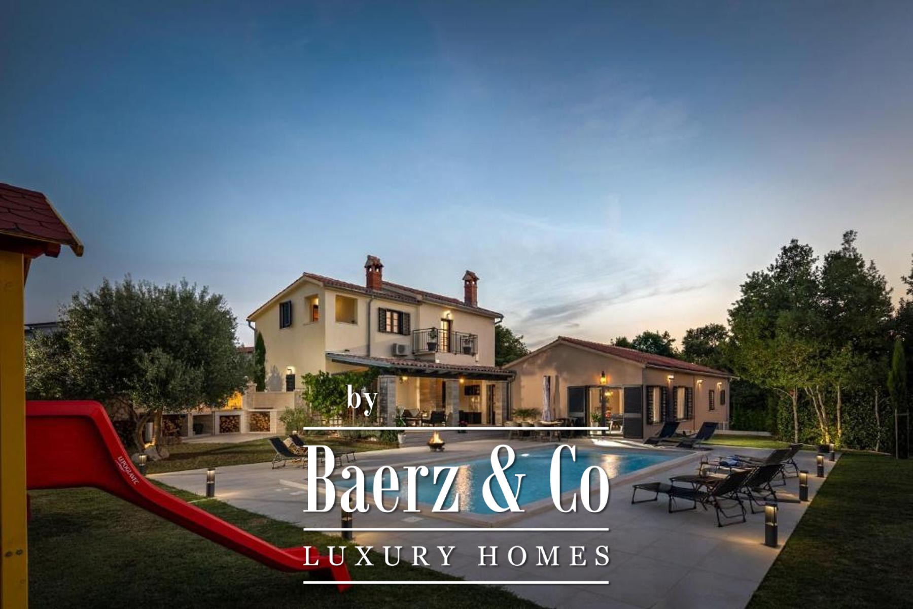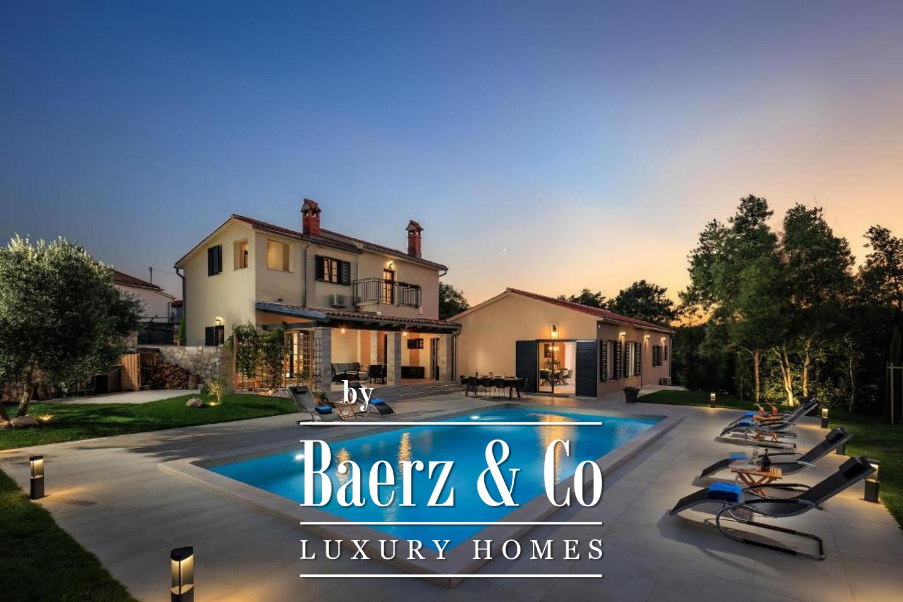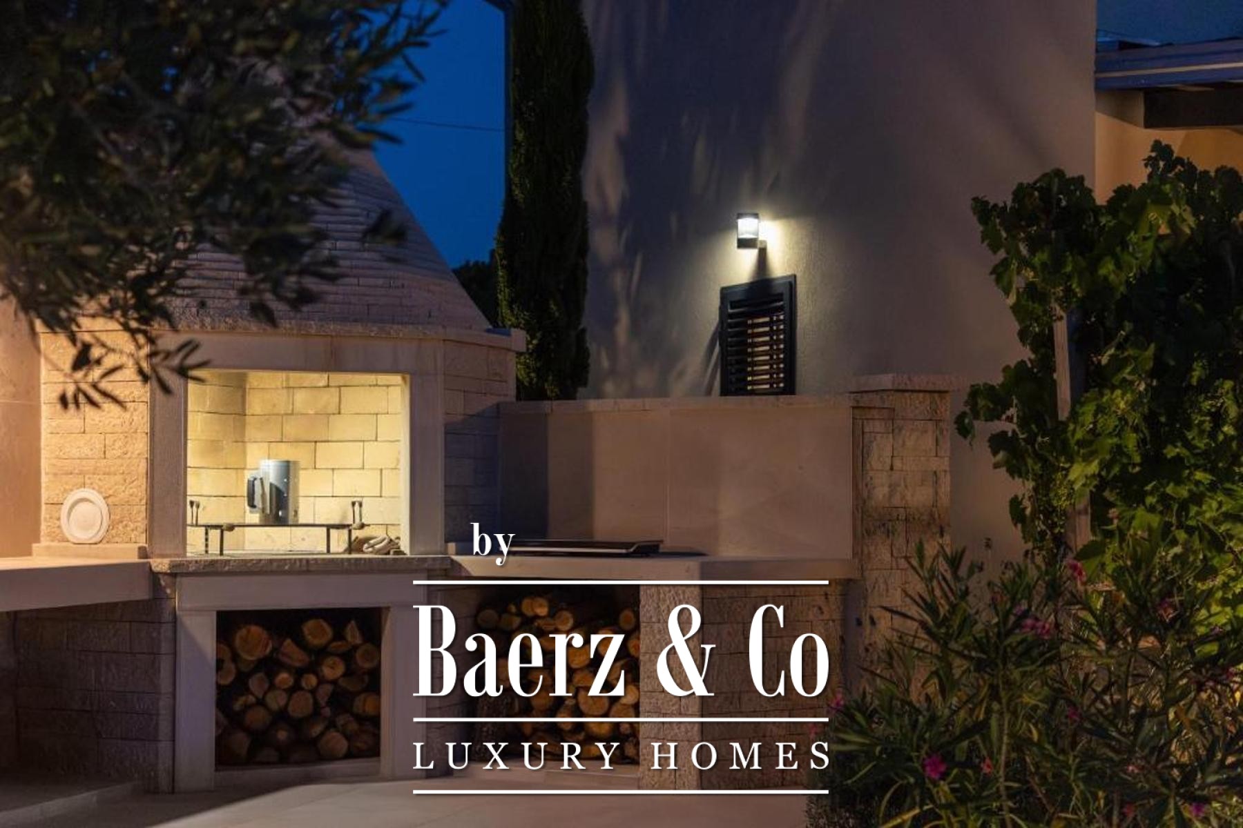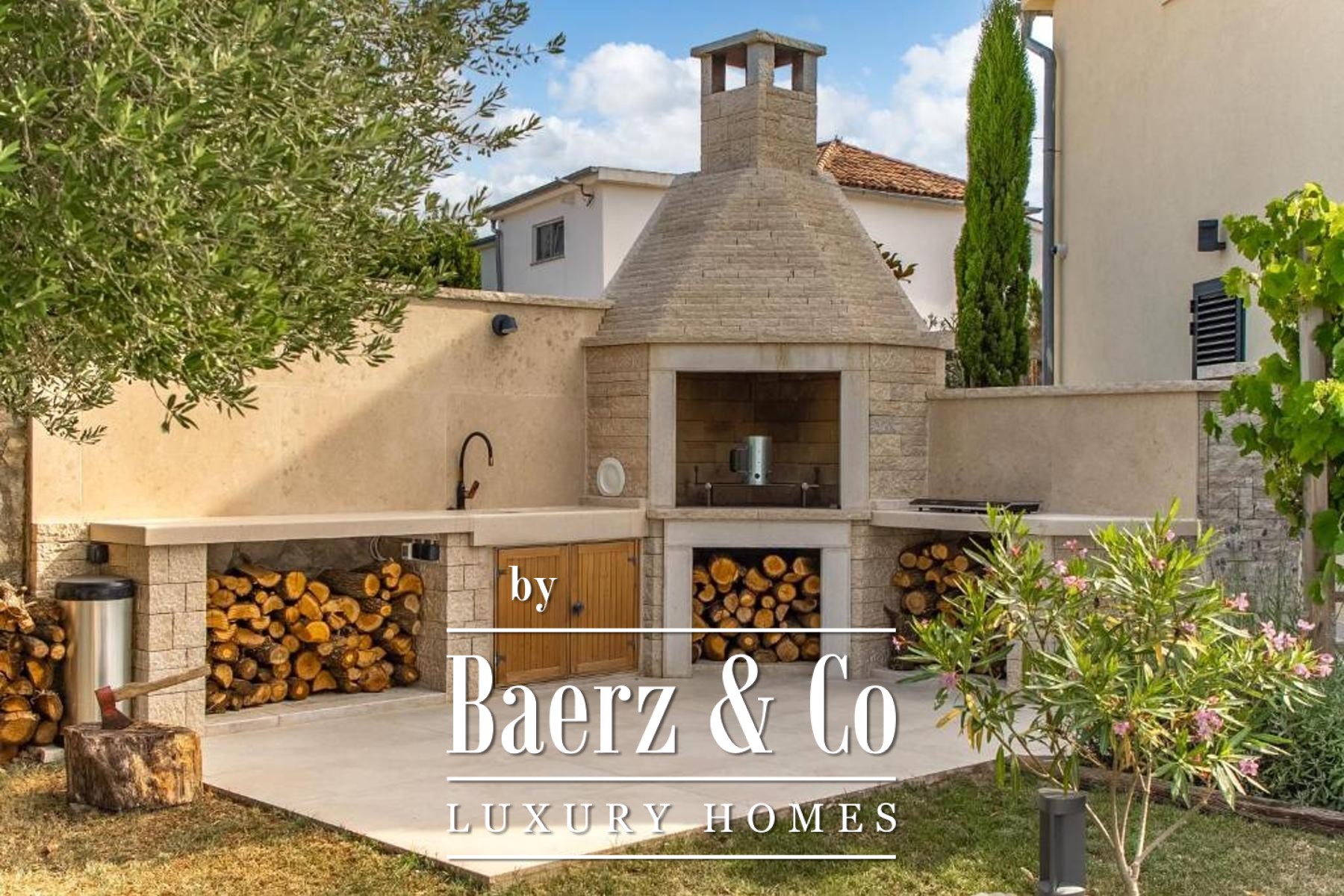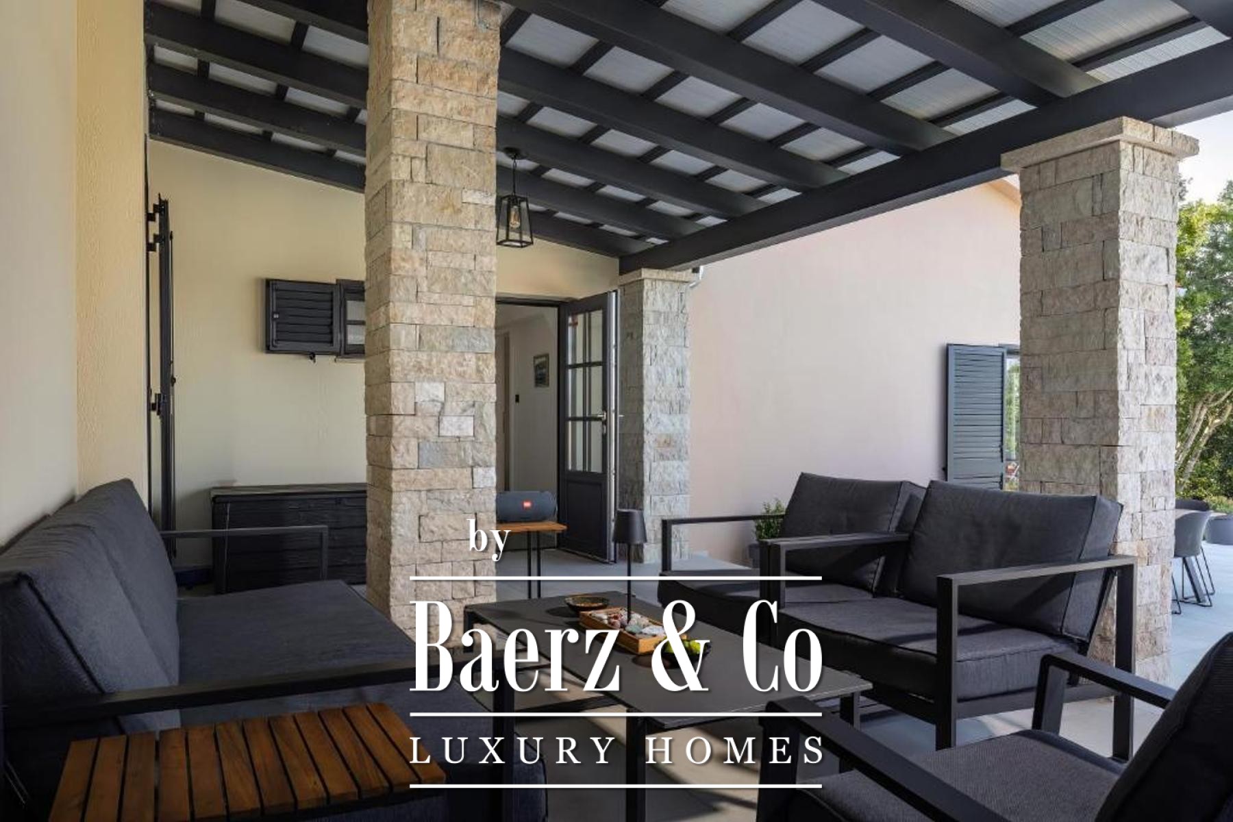 The ground floor has a living room decorated with a stone fireplace, a kitchen with a dining room equipped with a bar, two bedrooms and two bathrooms, a guest toilet and an internal staircase connecting the first floor where there are two more bedrooms with private bathrooms and terraces.The rooms on the ground floor, through glass walls, provide access to a fenced garden of 2,500 m2, which offers a covered terrace of 30 m2, an outdoor kitchen with a barbecue made of Kanfanar stone,