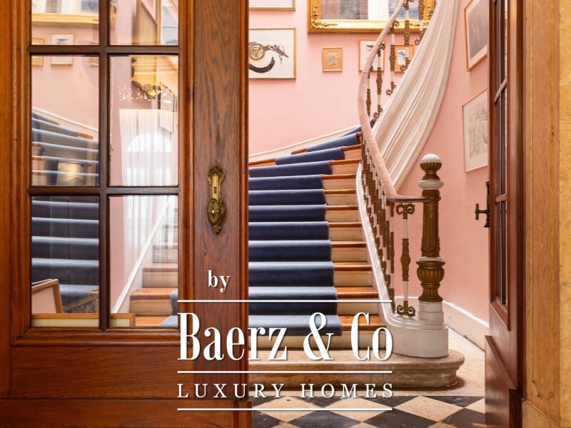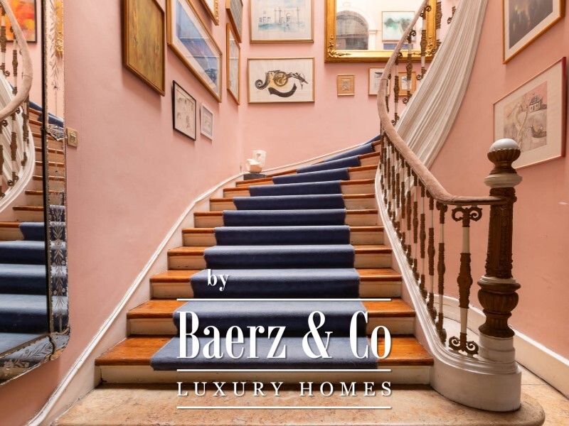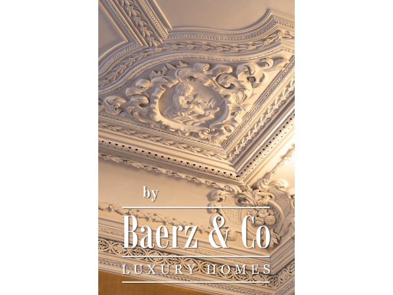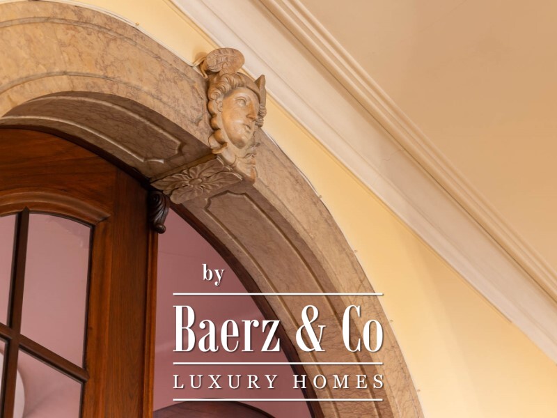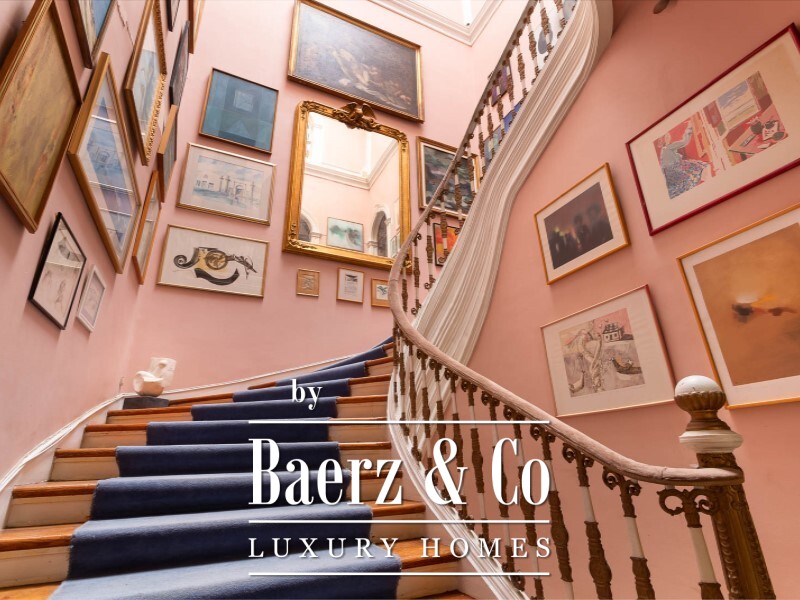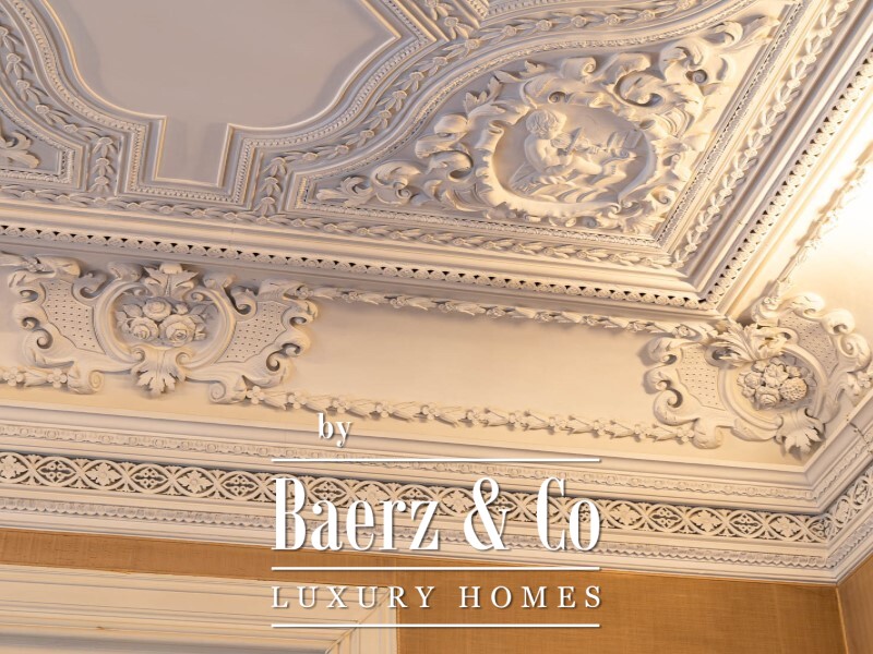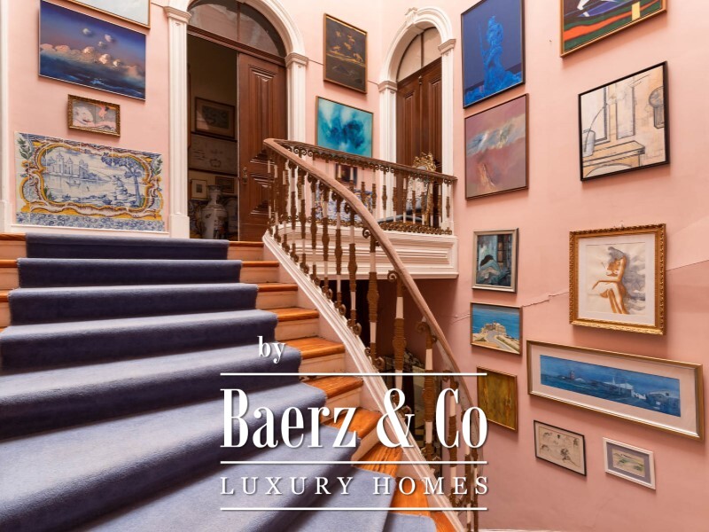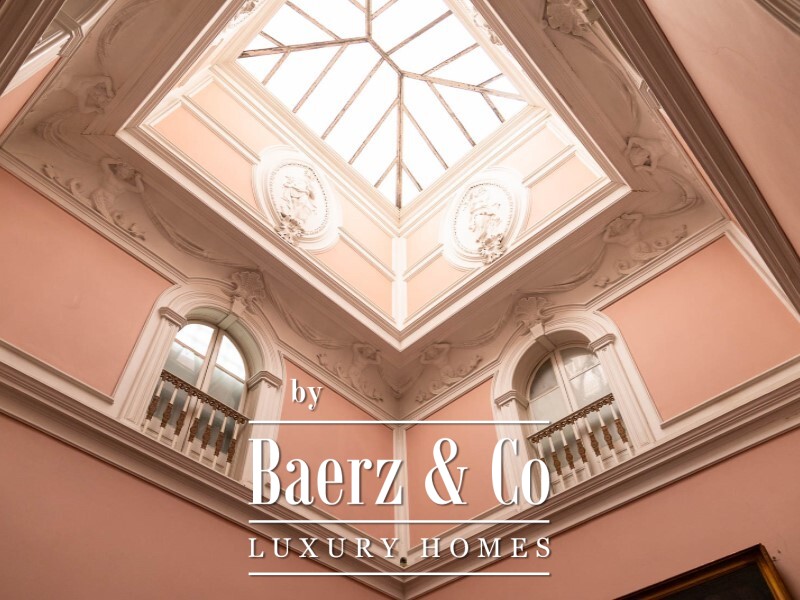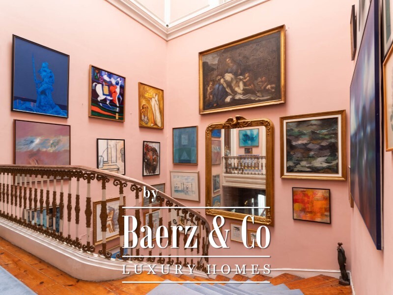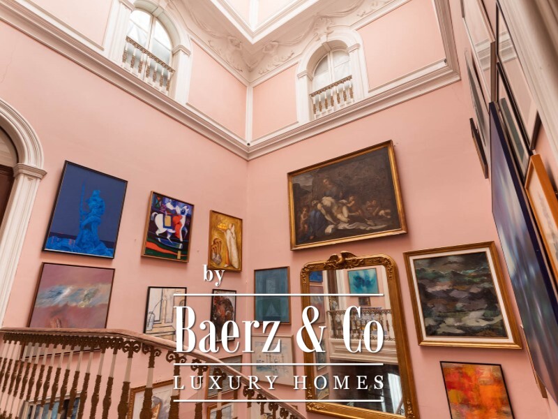 The majestic staircase leading to the ground floor is adorned with crafted walls and ceilings, and an impressive skylight window that creates a unique ambience.