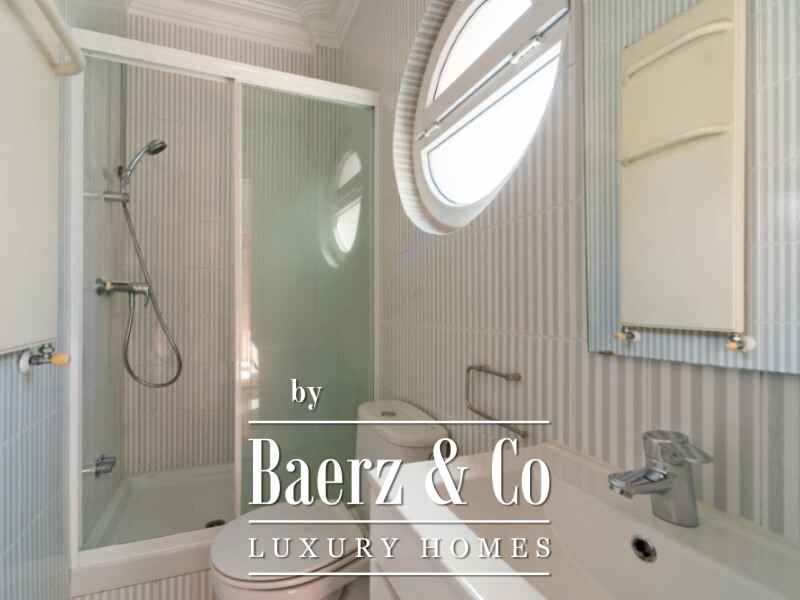 The three bedrooms offer distinct and versatile features: one with a built-in bookcase, another with a wardrobe, and the third with an enclosed sunroom and built-in storage cabinets. There is also a large closet for household linen, two full bathrooms, and a balcony.
