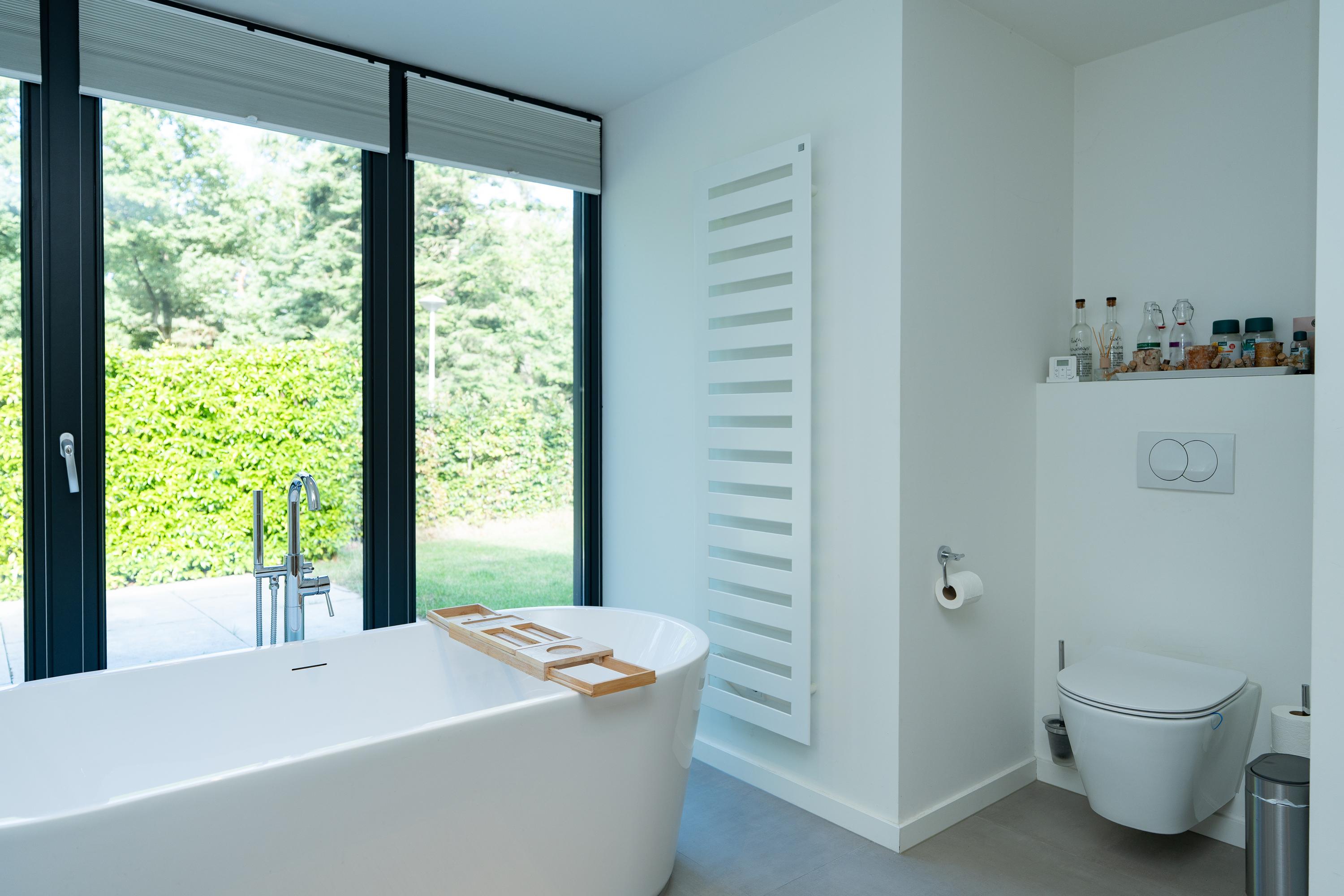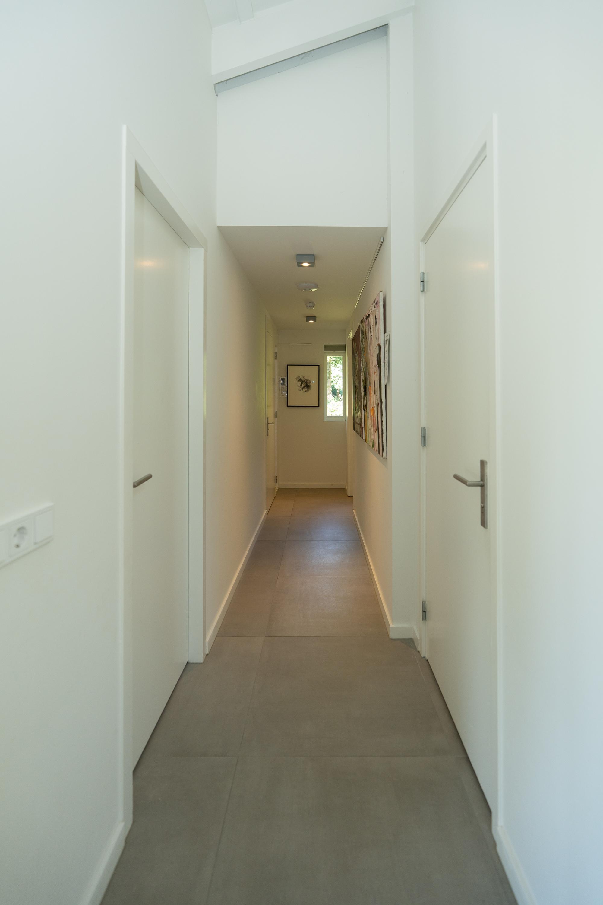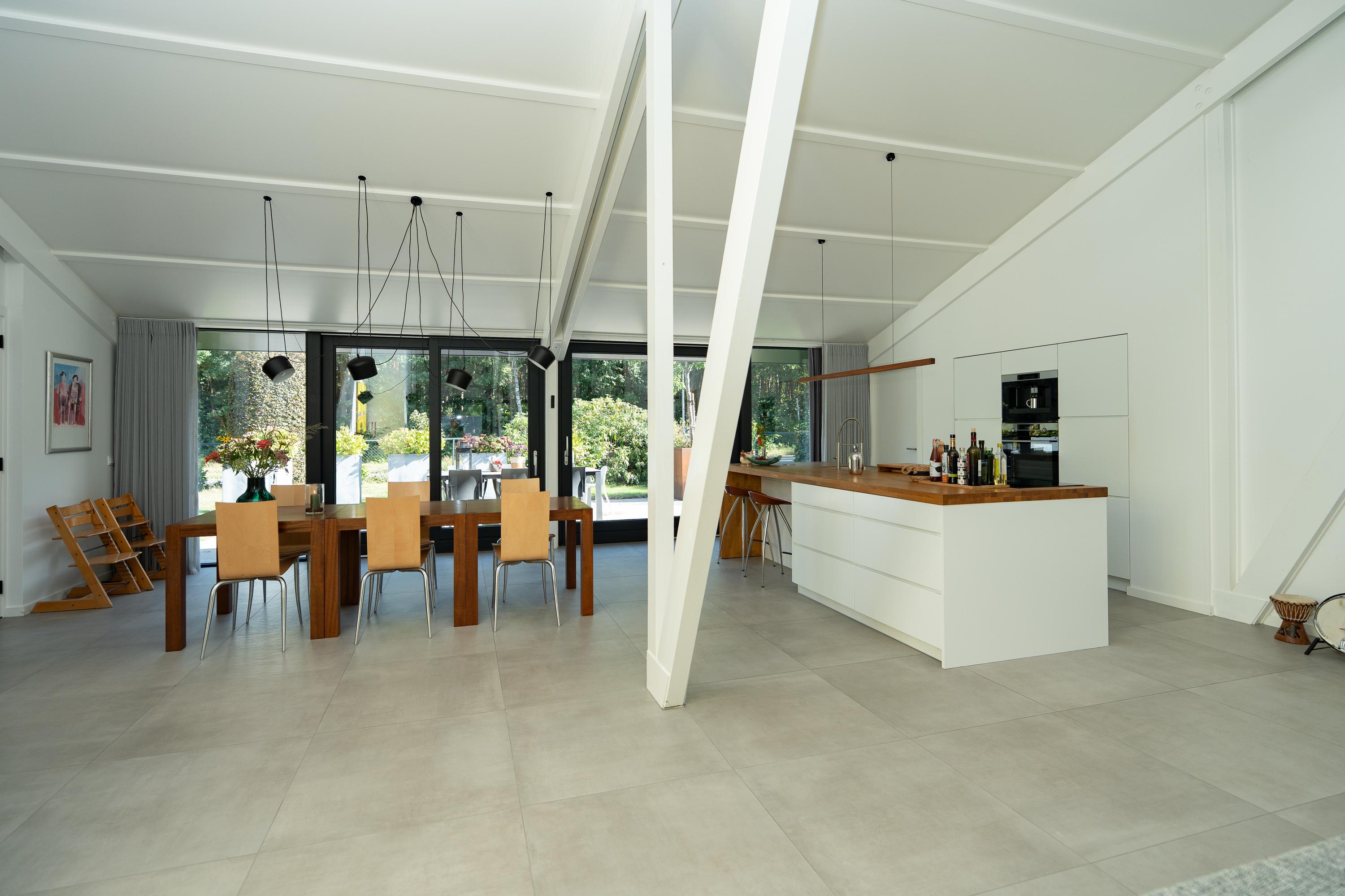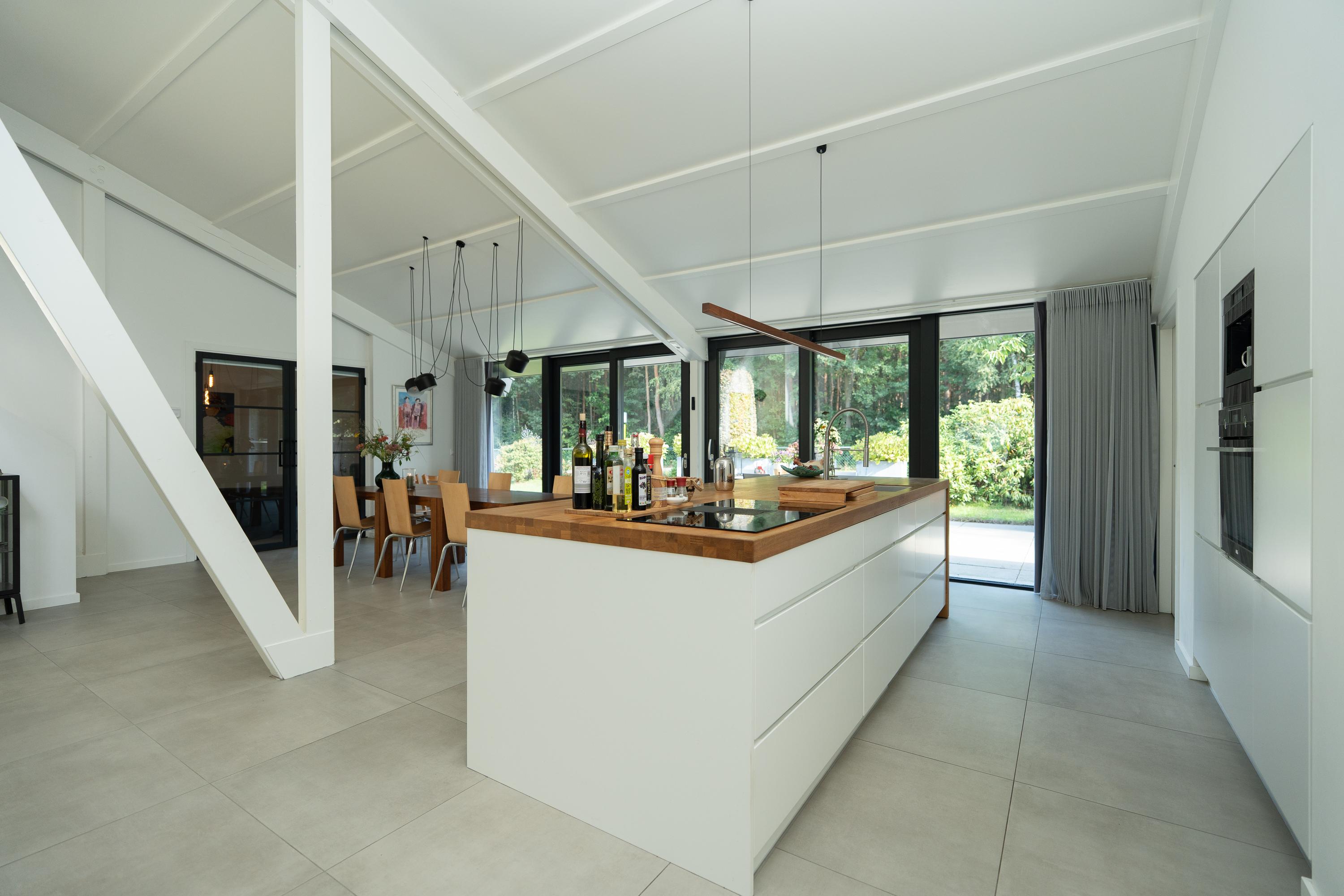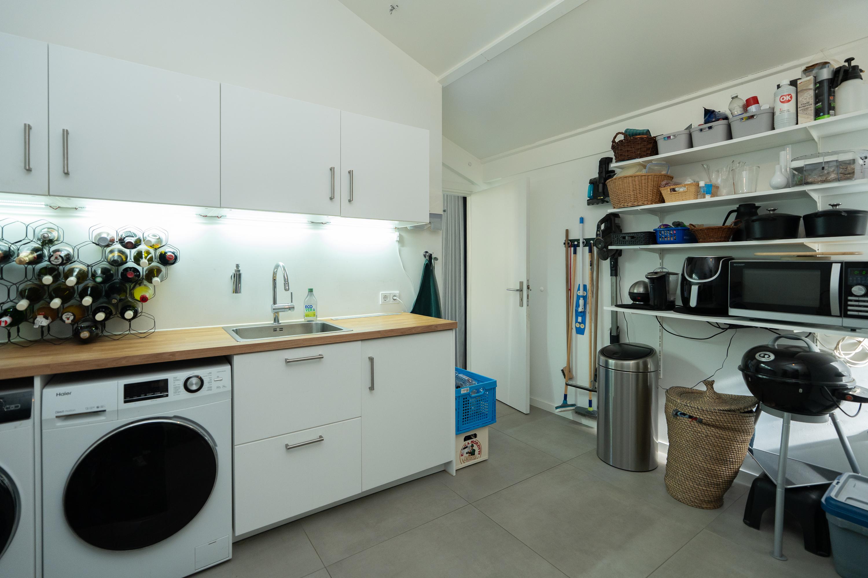 Entrance hall, spacious hall that immediately emphasises the spacious character of the house. The hall contains the meter cupboard, loft and the first toilet with washbasin. A spacious living room with high ceiling, where the many windows on all sides provide beautiful light and an open atmosphere. There are sliding doors to the front and back gardens at both the front and rear. There is also a spacious indoor storage room under the stairs and the staircase itself is beautifully concealed. Modern open kitchen with a large cooking island. The tall cabinets are beautifully concealed in the wall and the kitchen is equipped with various luxury built-in appliances. The utility room is located at the front of the house and has a kitchen unit, heat pump and boiler, and an extra outside door.