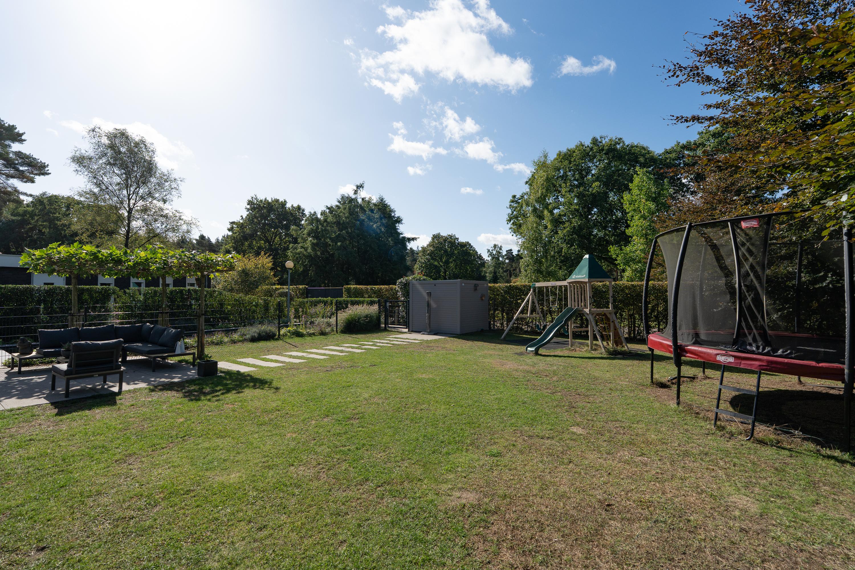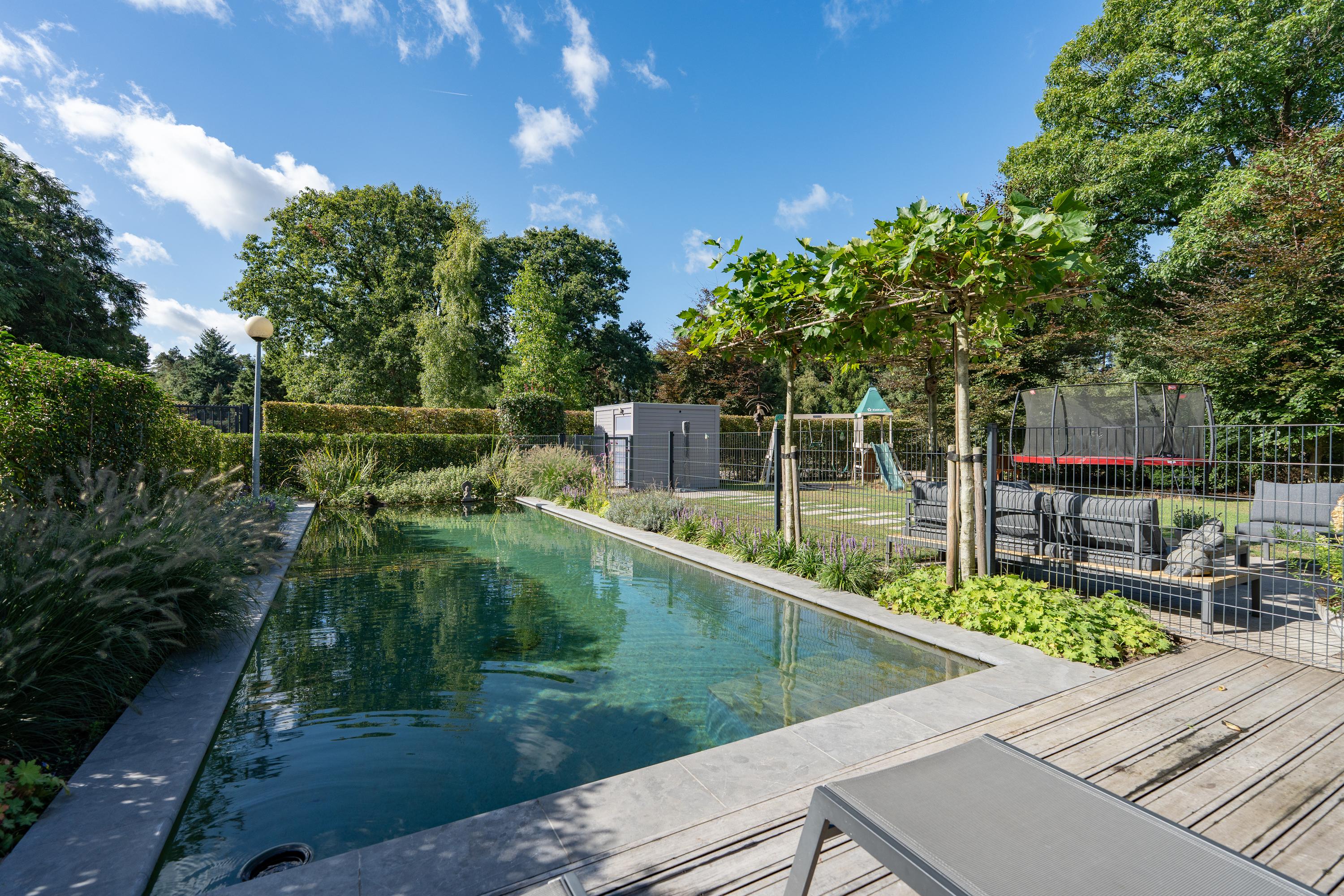 The property is surrounded by a well-maintained front, side and back garden, with several terraces so you can find a nice spot in the sun or shade at any time of the day. There is also an additional storage room. The fenced swimming pond is a real eye-catcher and gives the garden a special look. There is also ample parking space on the property.