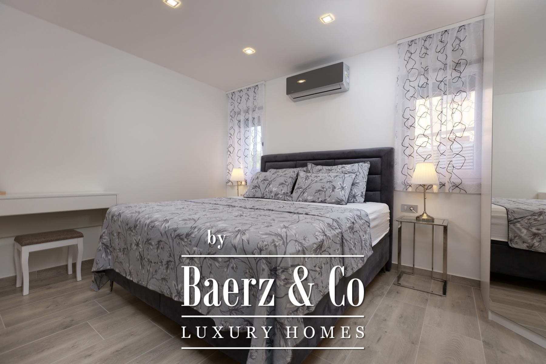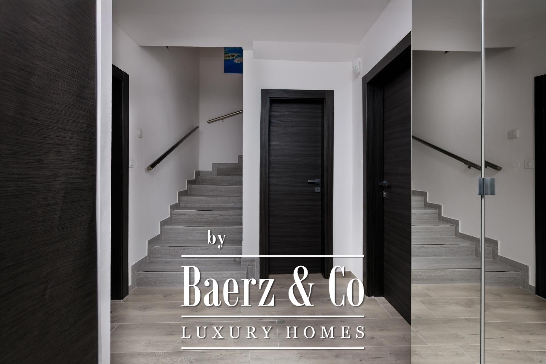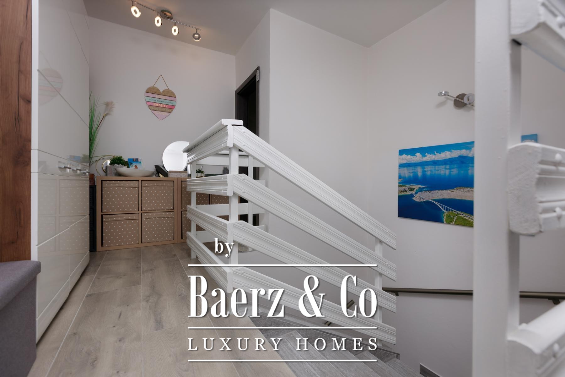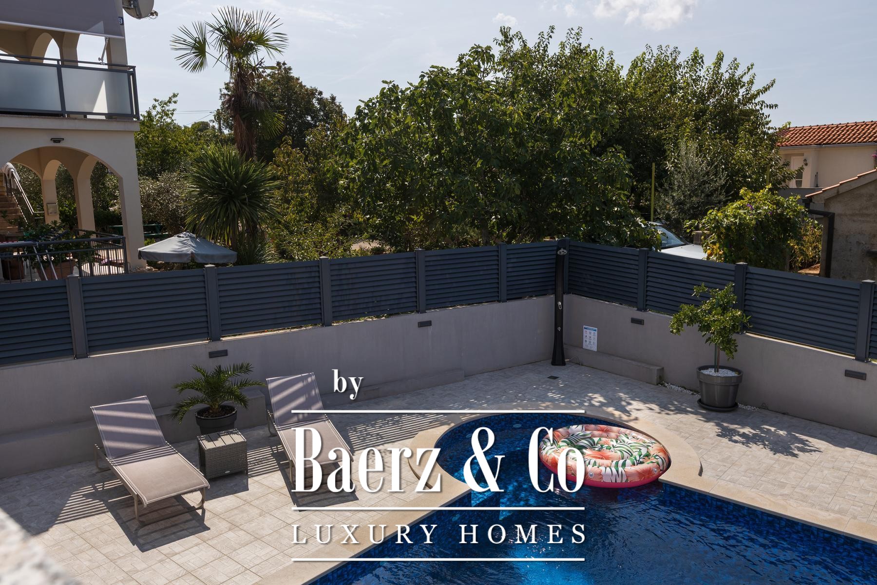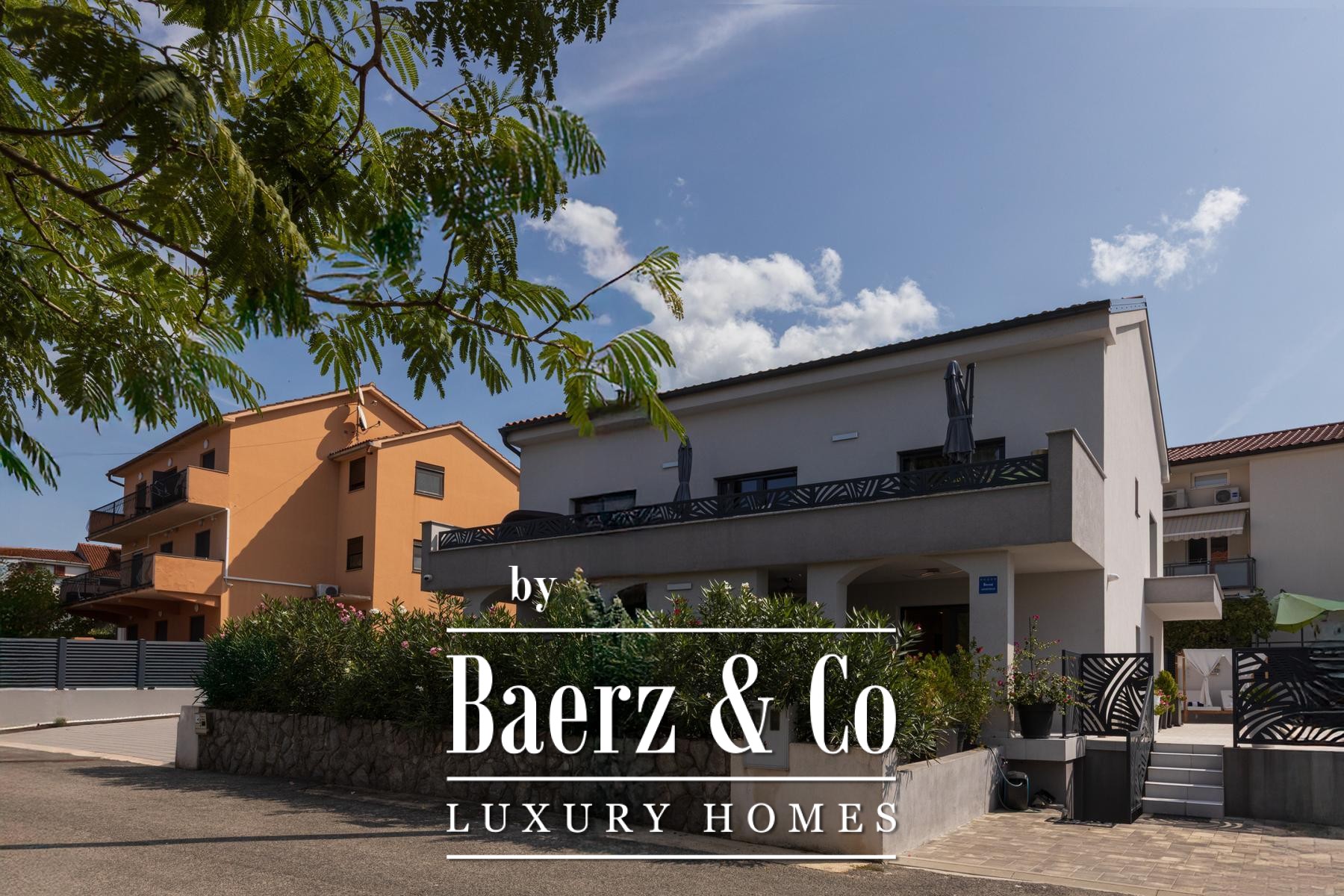 a high standard: the ground floor apartments have PVC joinery, while the upper floor has aluminum joinery; all windows are fitted with electric shutters and insect screens. Comfort and security are ensured by eight air conditioning units, an alarm system, smoke and glass-break detectors, and four surveillance cameras. All three kitchens are from the renowned brand DAN Küchen, while the bathrooms are furnished with premium carpentry. The attic, measuring 60 m², offers the possibility to create an additional apartment, and the most recent renovation of the house was carried out in 2025.Outdoors, there is a large swimming pool measuring 10 x 5 meters, with a heat pump already provided that only needs to be connected. The property also includes four outdoor parking spaces.This house combines privacy, luxury living, and investment potential in one of the most desirable locations on the island of Krk.
