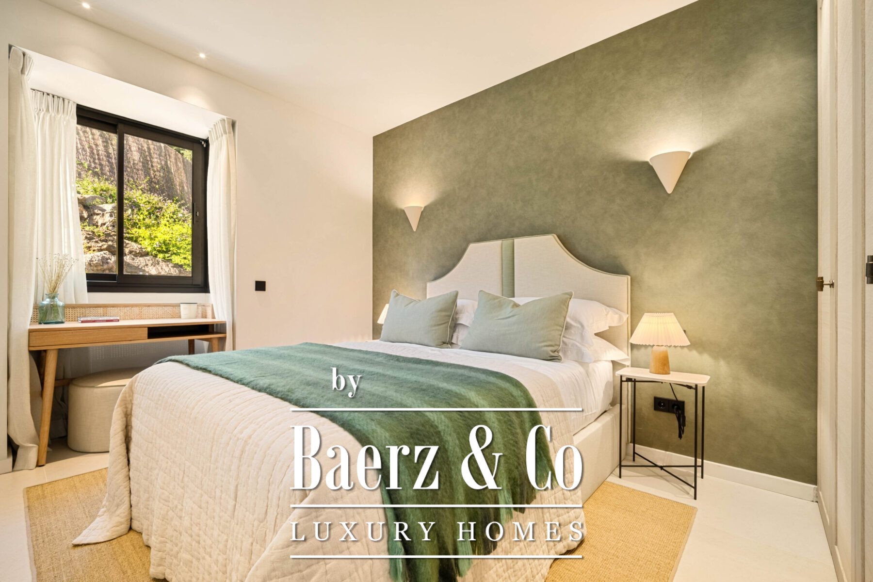 Villa Marbella with Sea and Mountain Views sits quietly in Nueva Andalucía, minutes from Los Naranjos Golf Course and close to Marbella’s celebrated beaches and dining. This fully renovated single-level villa, with 241 m² of living space and set on an 855 m² elevated plot, captures the essence of Mediterranean life. The main living area is defined by its open-plan design, vaulted ceilings, and a palette of soothing natural tones. Light moves freely throughout, courtesy of floor-to-ceiling glass doors that lead to a generous terrace, where an infinity-edge pool appears suspended above the valley. From both inside and the rooftop terrace, expansive views reach across the valley to meet the sea.