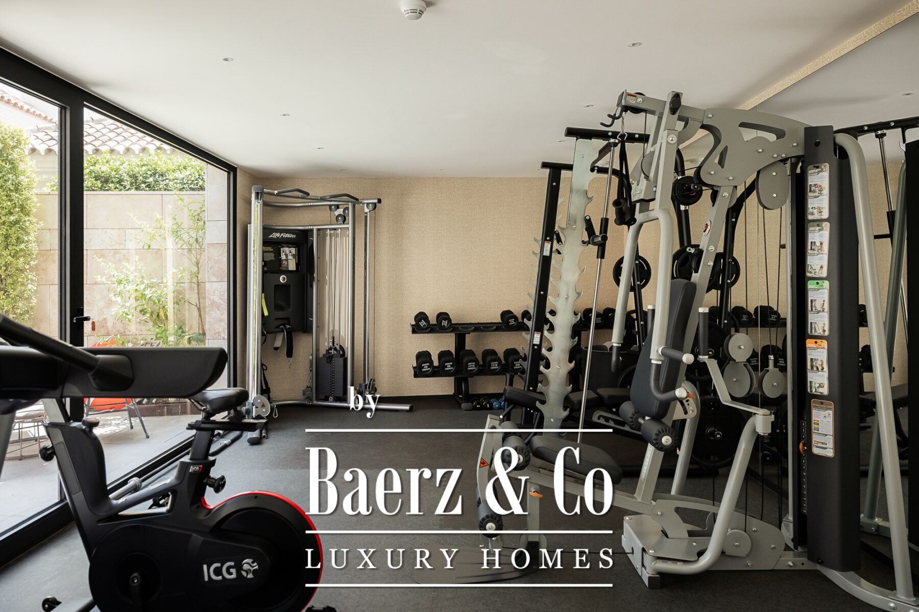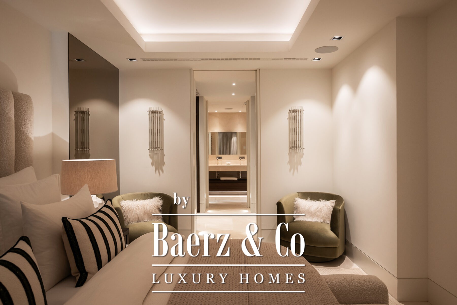 Arriving through a central hall, the apartment’s layout divides efficiently between social and private zones. The open-plan living area flows into a kitchen appointed with Gaggenau and Miele appliances, a striking floor-to-ceiling wine display, and fully automated glazing that merges indoor living with the terrace. In the private wing, the master suite features a walk-in wardrobe and full bathroom, accompanied by two further en-suite bedrooms facing the tranquil gardens. Additional amenities include a laundry room, smart home systems, premium materials throughout, and two garage spaces with a registered electric buggy and storage room.