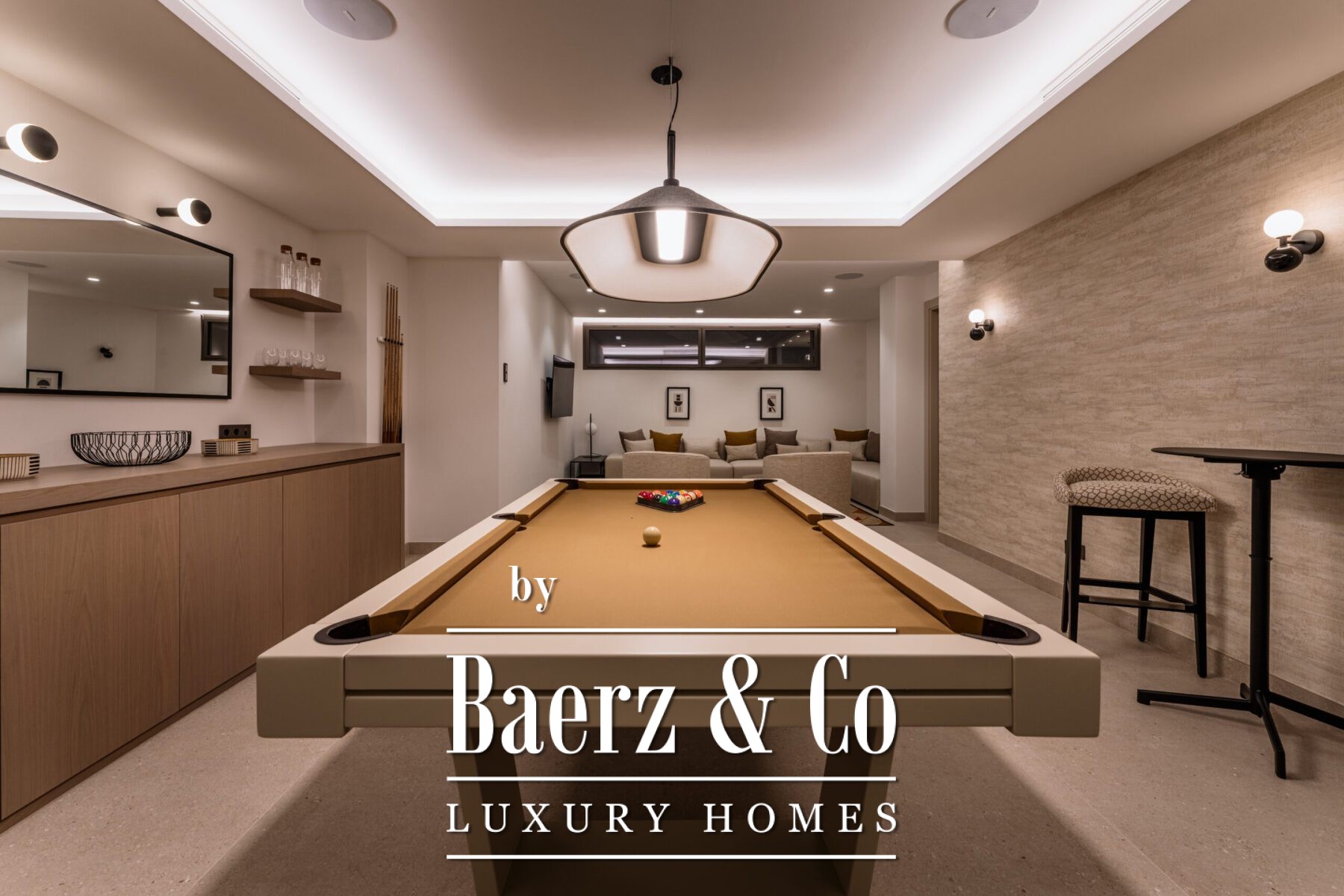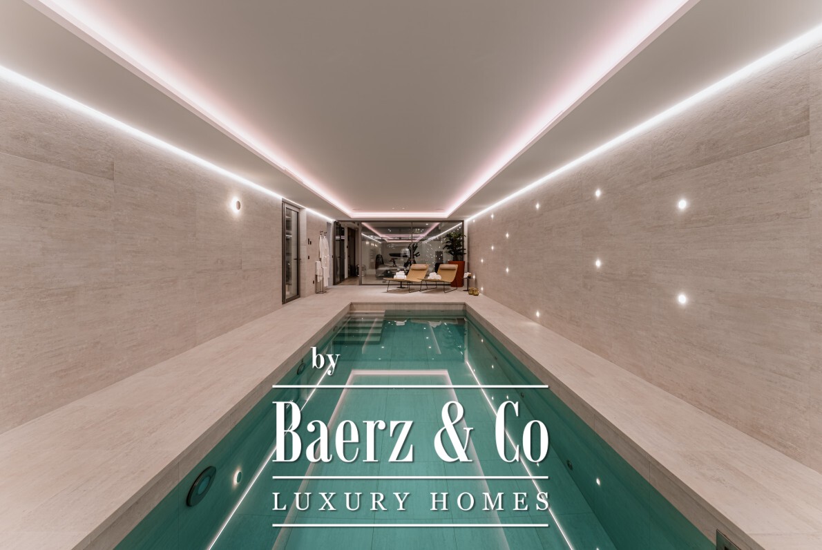 The upper level delivers both privacy and perspective. The master suite features dual bathrooms, separate wardrobes, and expanses of glass framing the landscape. Two further guest suites, one with a private terrace, complete this sanctuary. On the lower floor, a spa with heated indoor pool, sauna, gym, and steam room await, complemented by an entertainment lounge, climate-controlled wine cellar, and a staffed apartment with its own kitchen. Four cars rest securely in the garage, with additional guest parking for six vehicles.