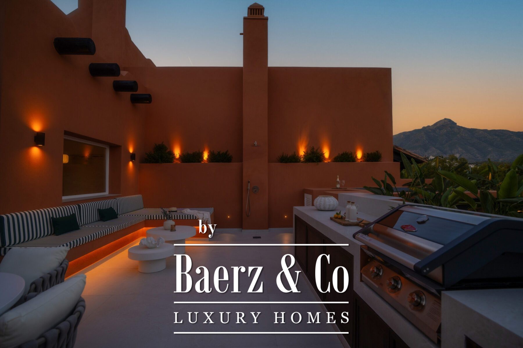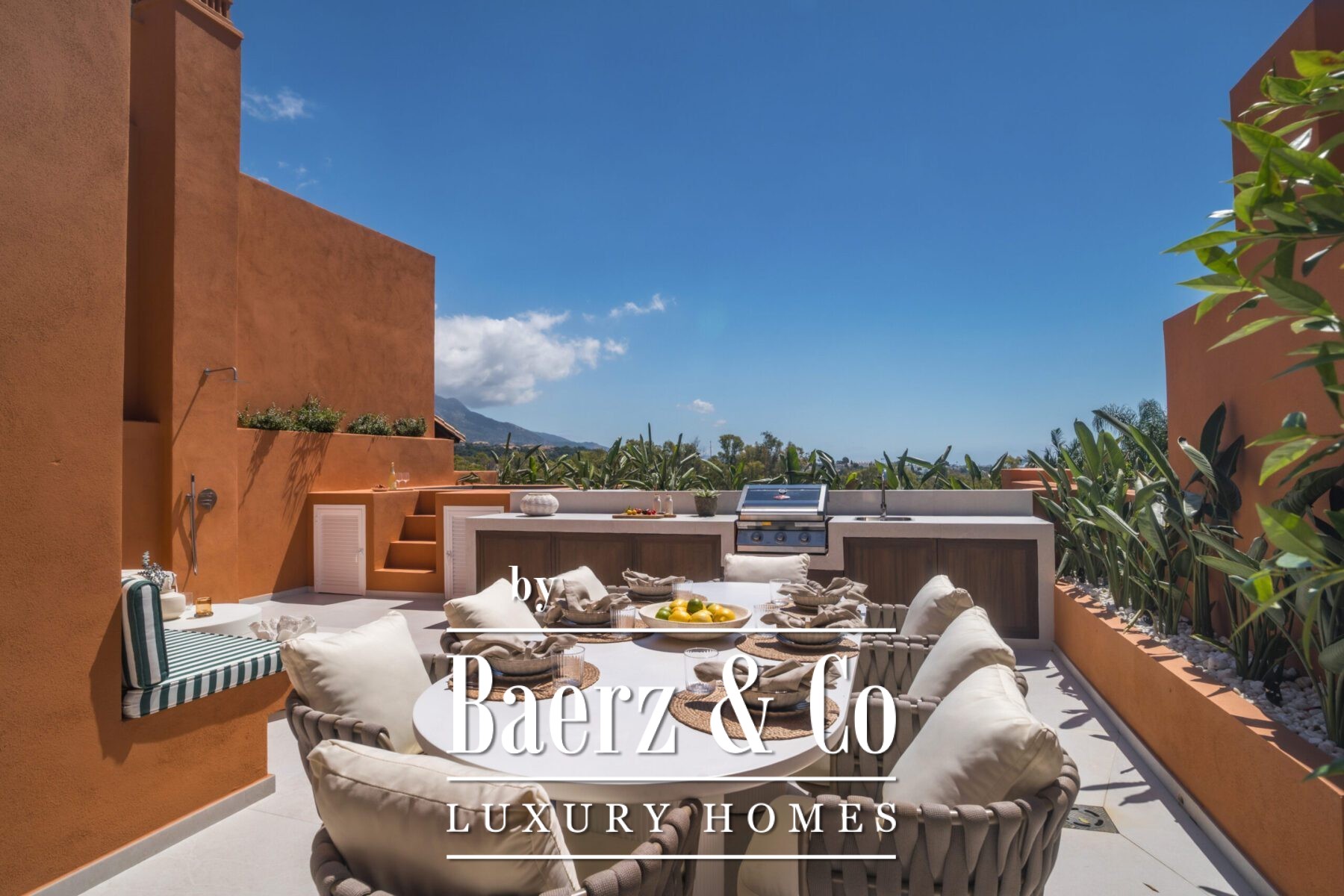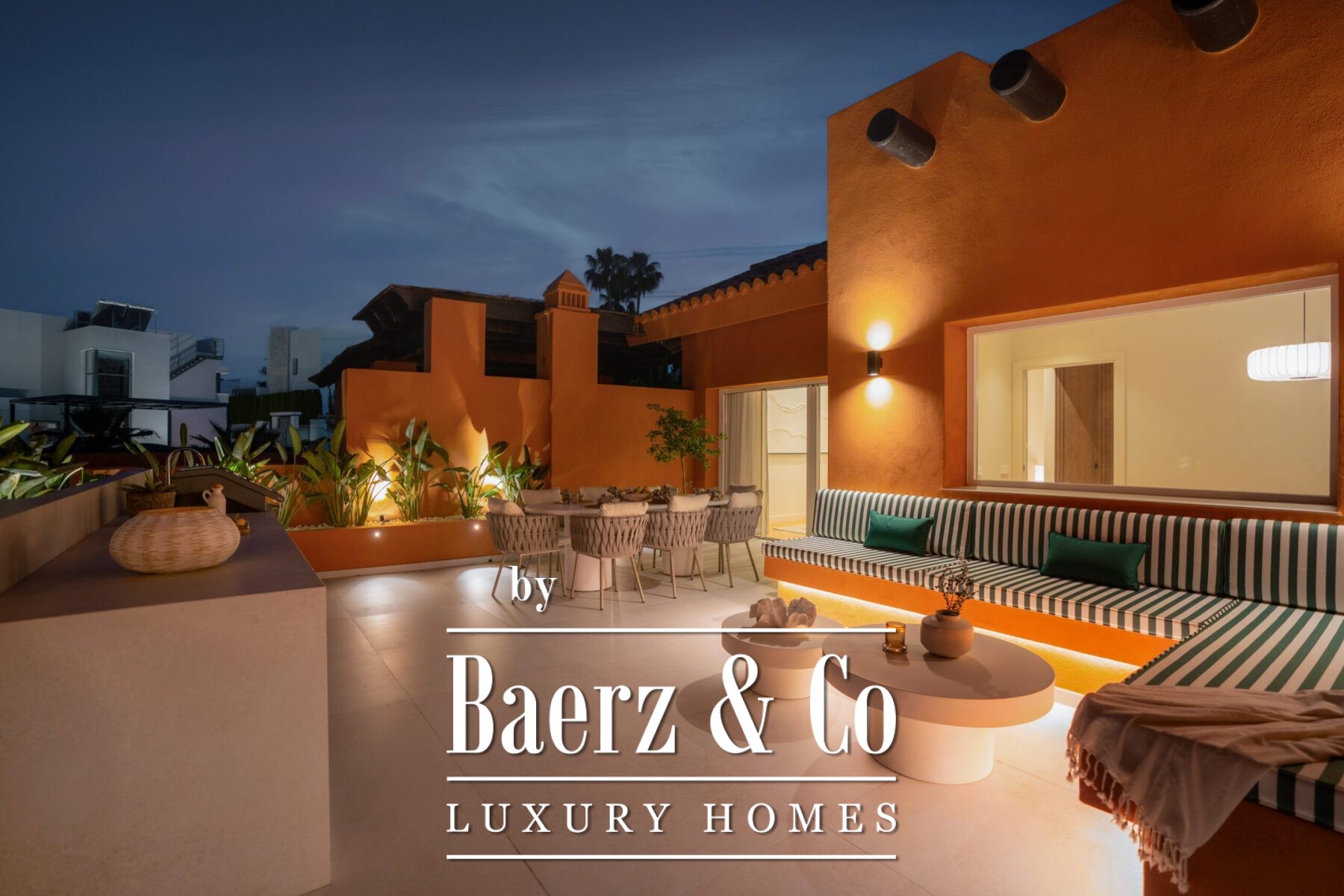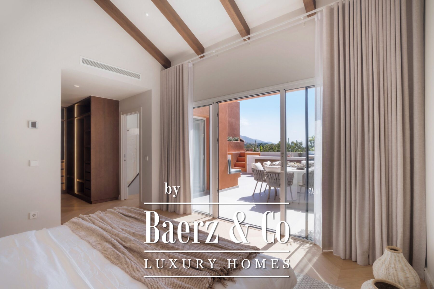 The duplex penthouse Marbella resides within a gated community in Nueva Andalucía, offering a discreet refuge moments from the Mediterranean Sea. Newly renovated, this 210 m² home comprises four bedrooms and three bathrooms, balancing contemporary architecture with elevated finishes. On the main level, a Miele-equipped kitchen adjoins open living and dining spaces, leading to a terrace that frames striking views of La Concha and the sea.