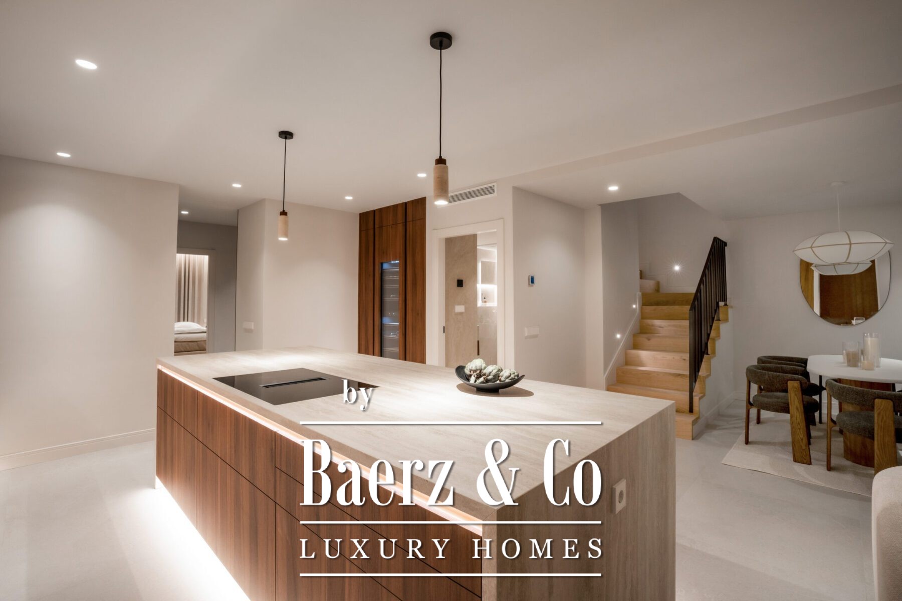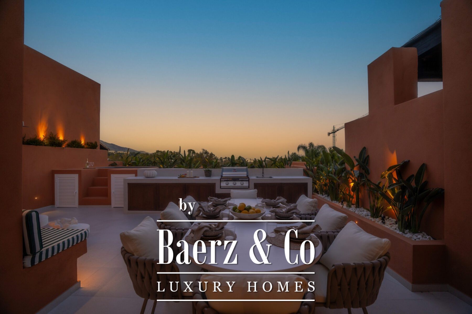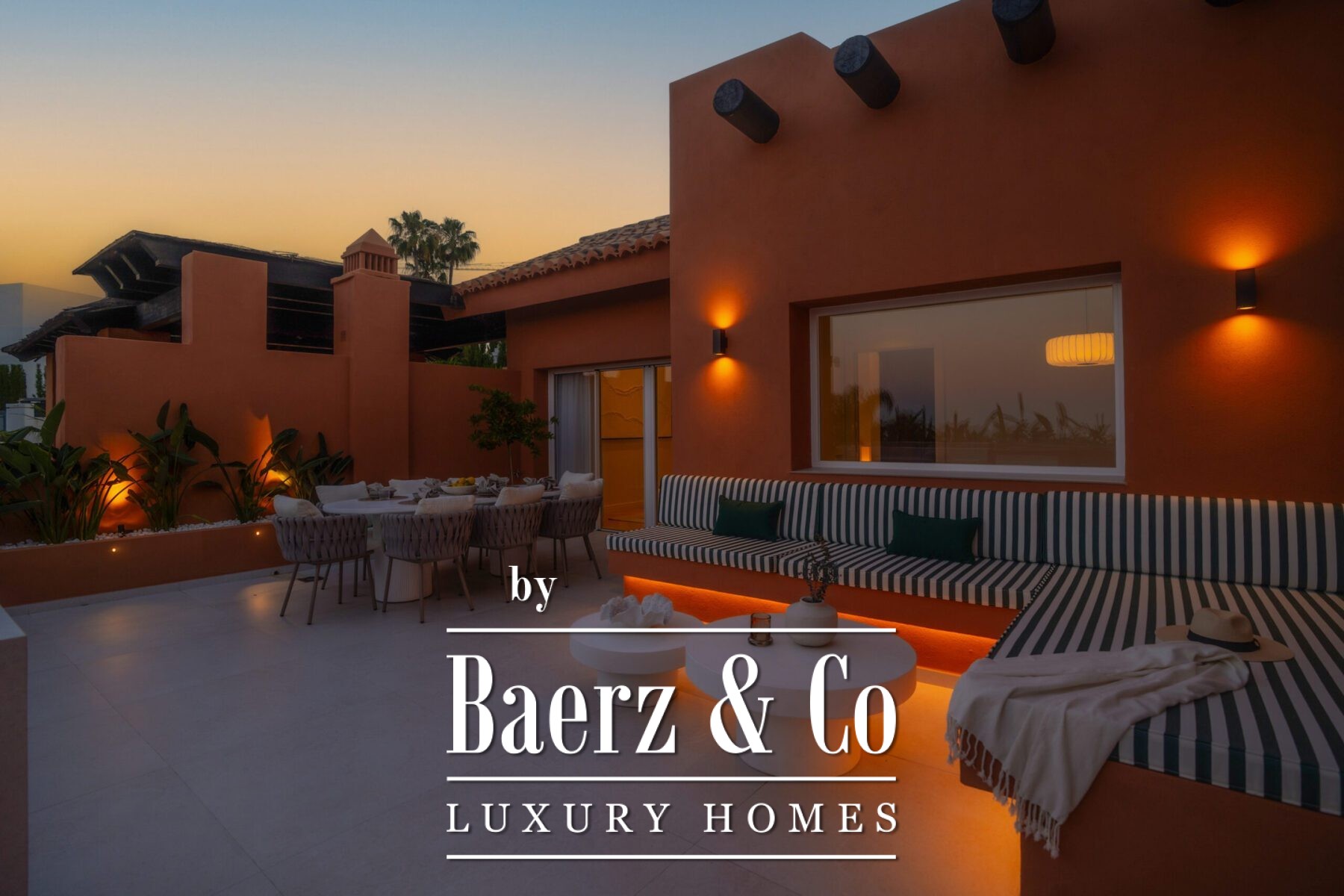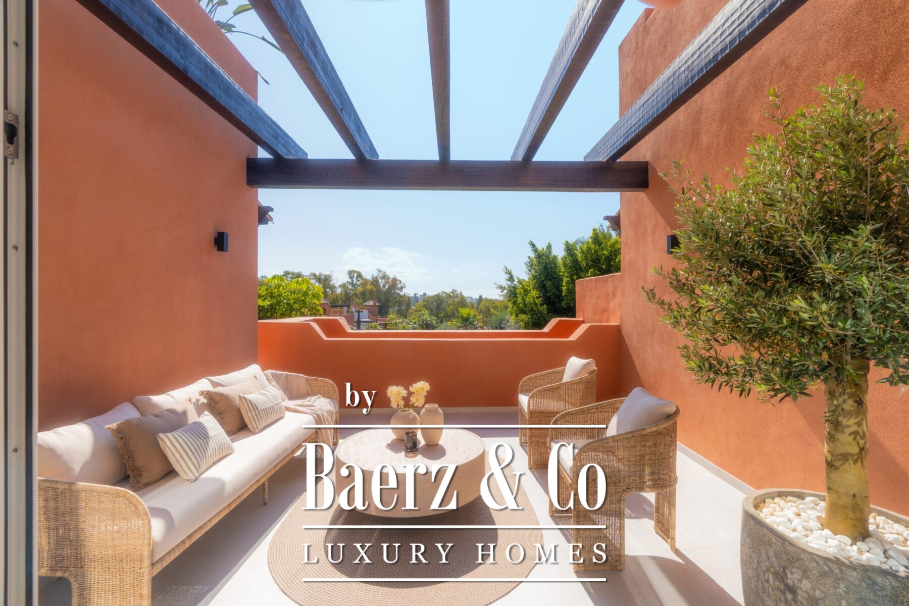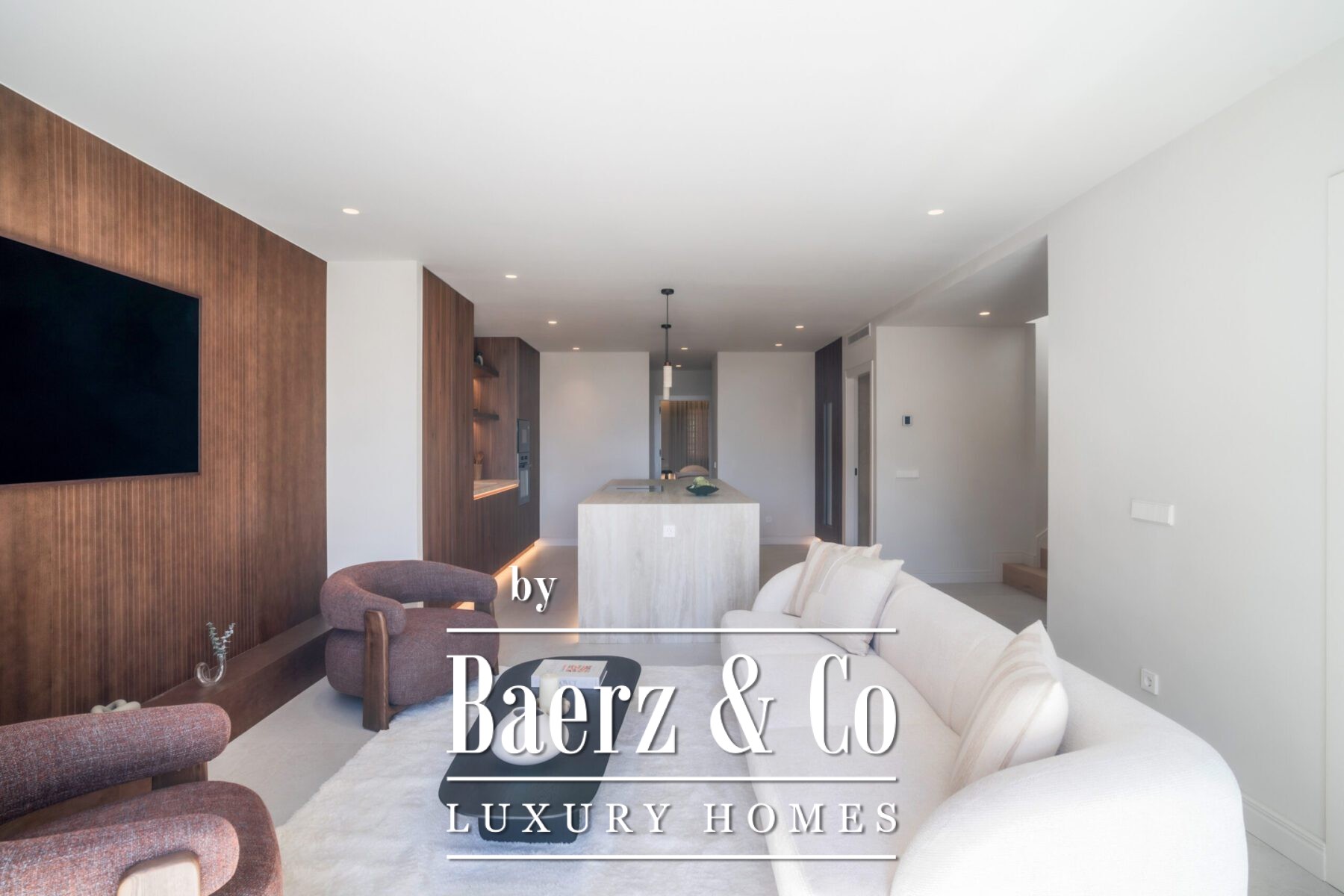 The duplex penthouse Marbella resides within a gated community in Nueva Andalucía, offering a discreet refuge moments from the Mediterranean Sea. Newly renovated, this 210 m² home comprises four bedrooms and three bathrooms, balancing contemporary architecture with elevated finishes. On the main level, a Miele-equipped kitchen adjoins open living and dining spaces, leading to a terrace that frames striking views of La Concha and the sea.
