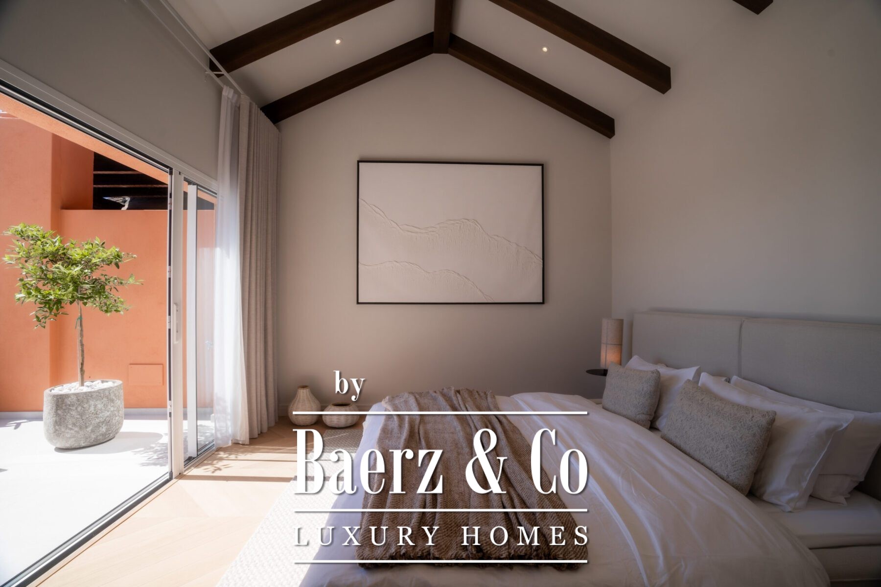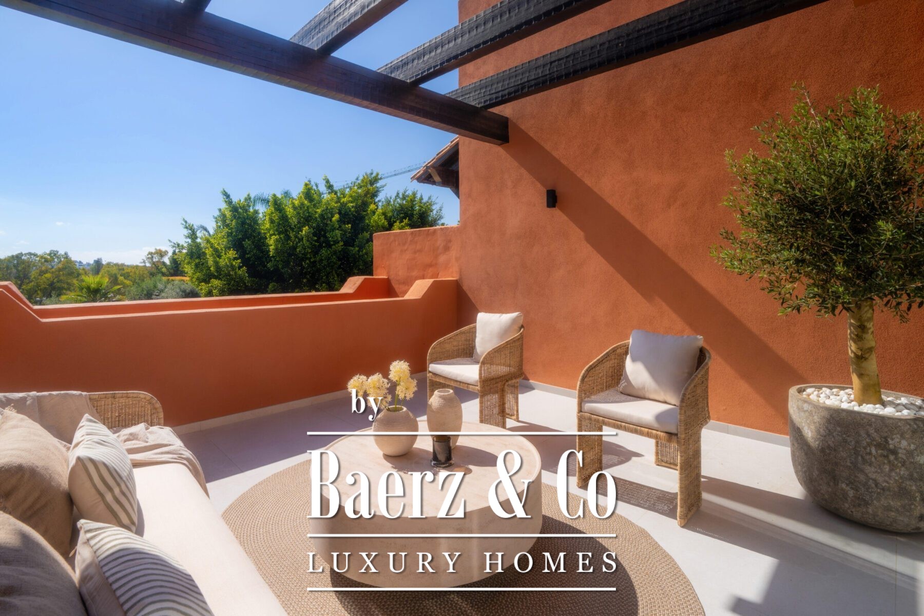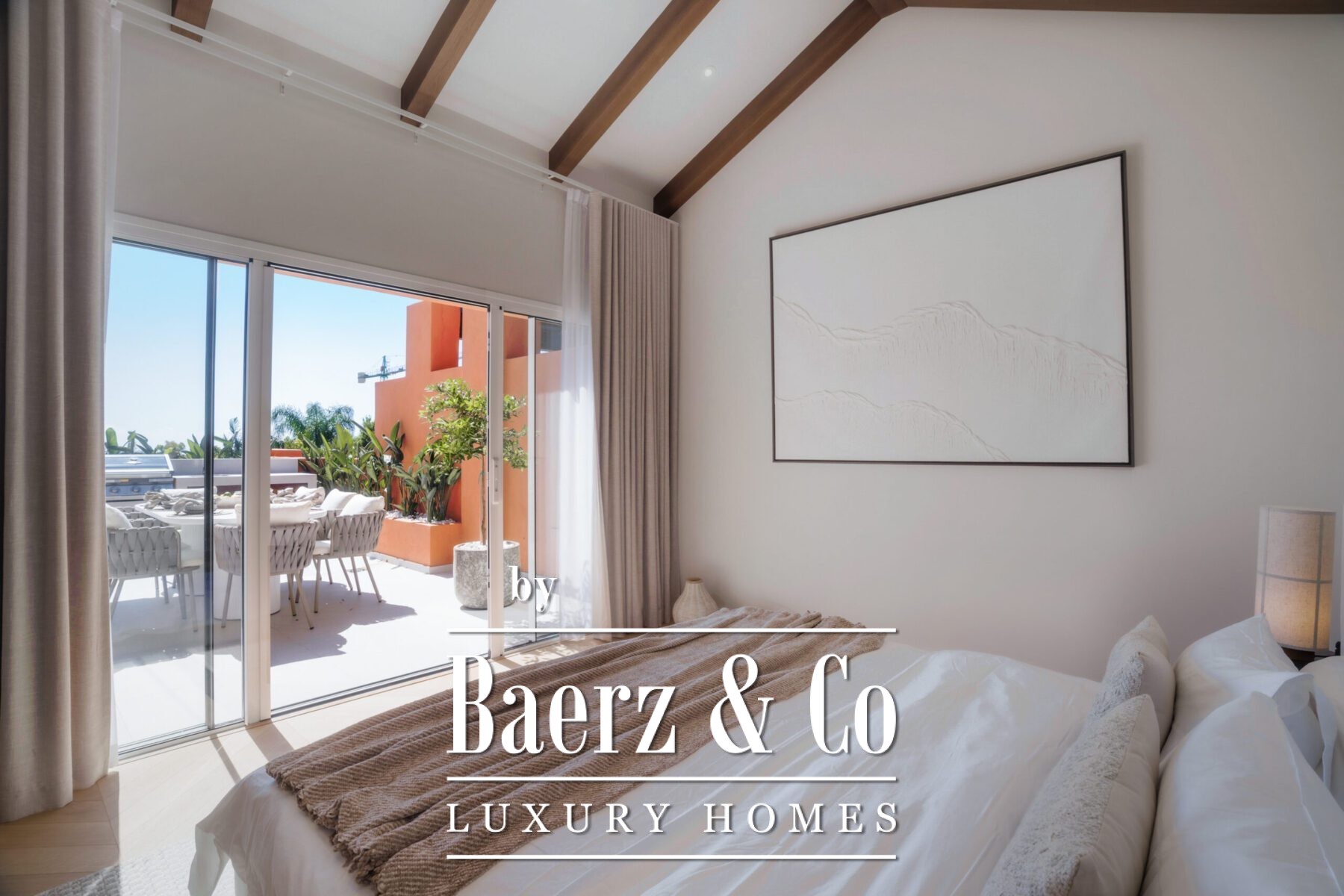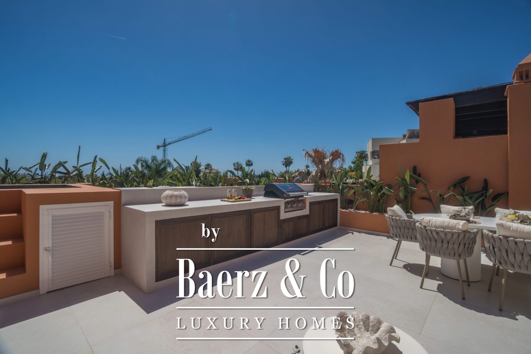 The duplex penthouse Marbella resides within a gated community in Nueva Andalucía, offering a discreet refuge moments from the Mediterranean Sea. Newly renovated, this 210 m² home comprises four bedrooms and three bathrooms, balancing contemporary architecture with elevated finishes. On the main level, a Miele-equipped kitchen adjoins open living and dining spaces, leading to a terrace that frames striking views of La Concha and the sea.