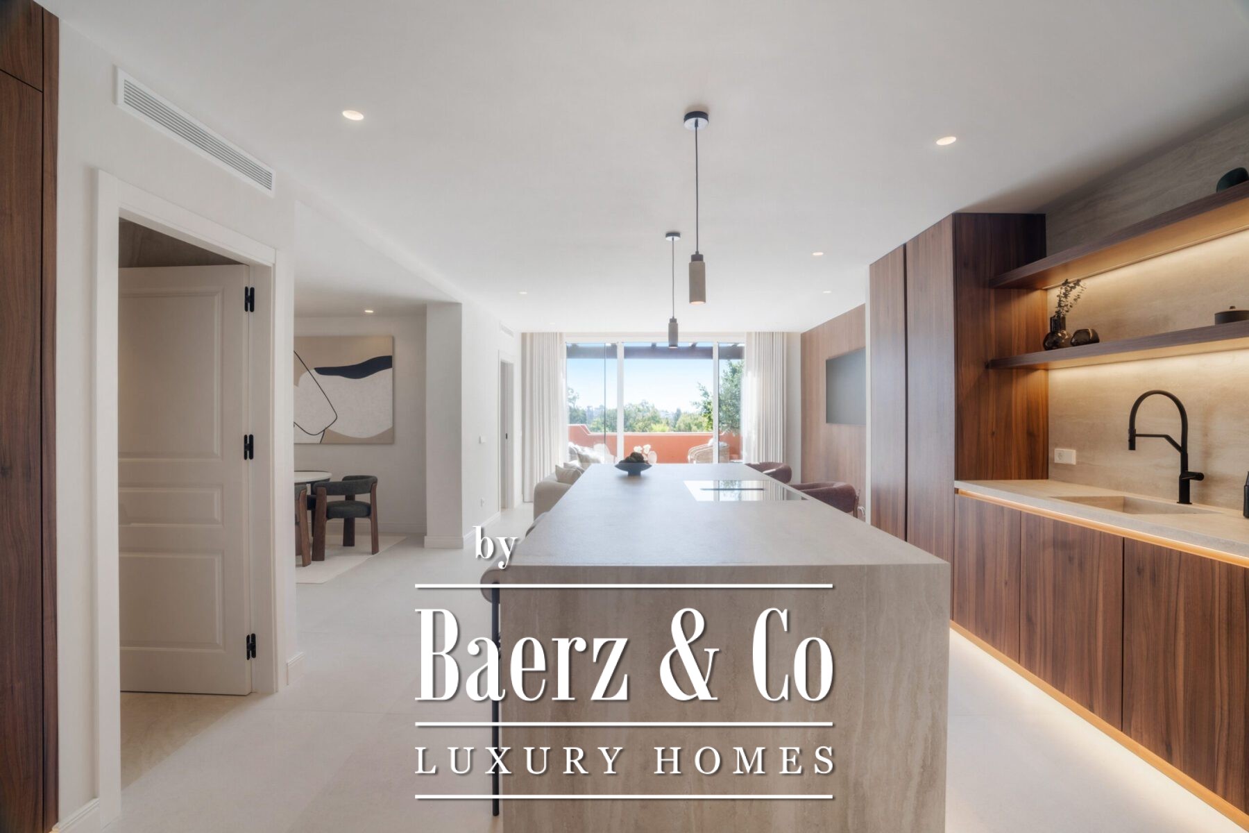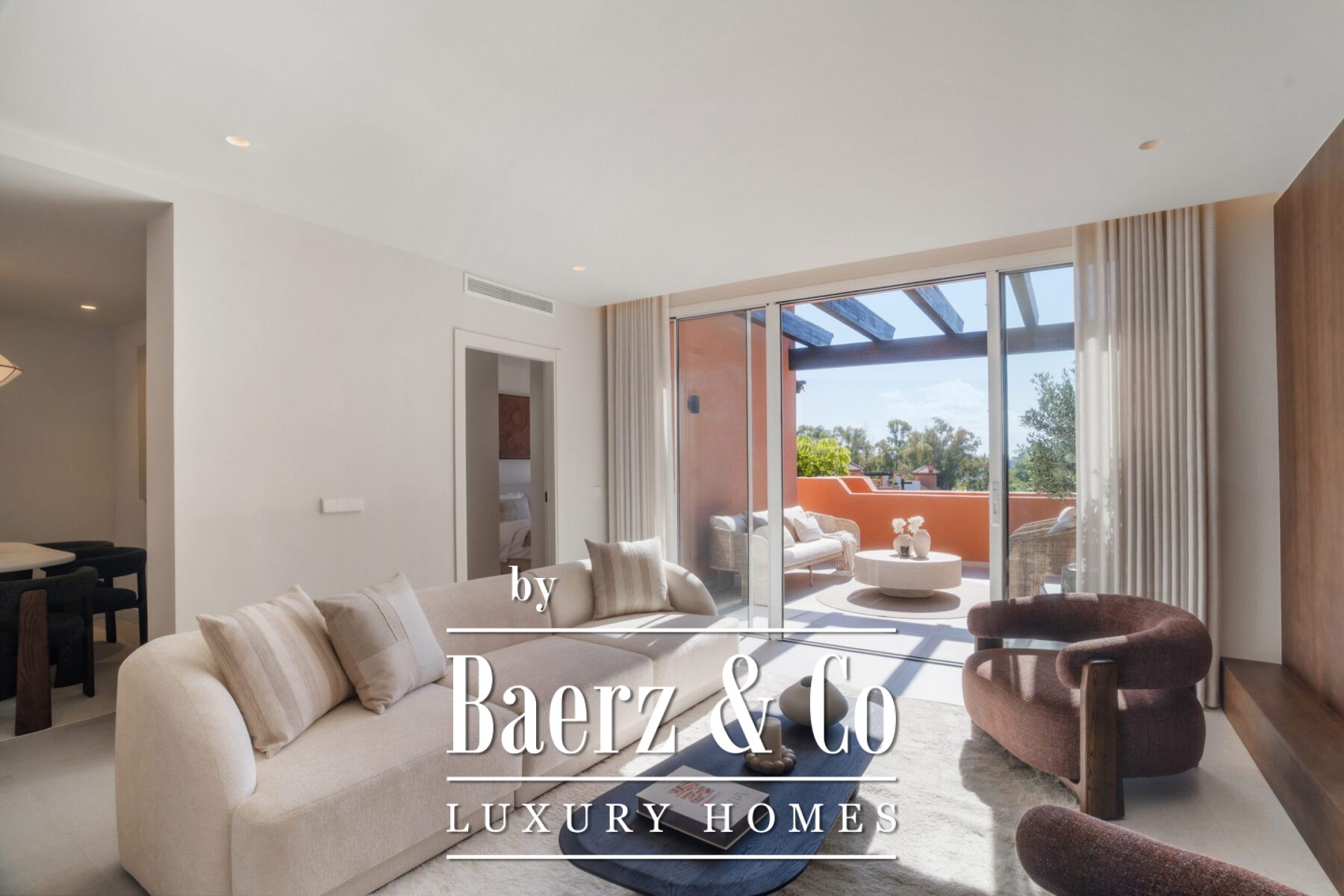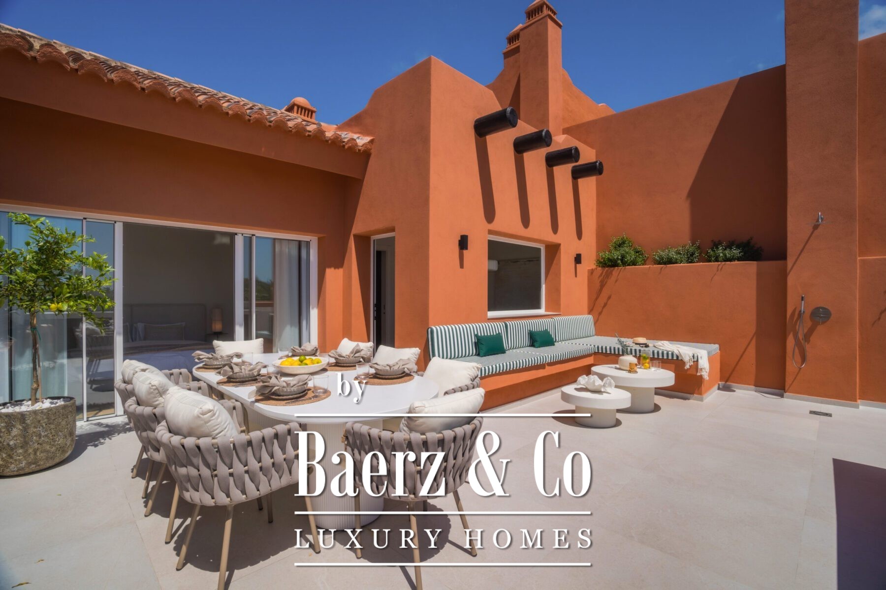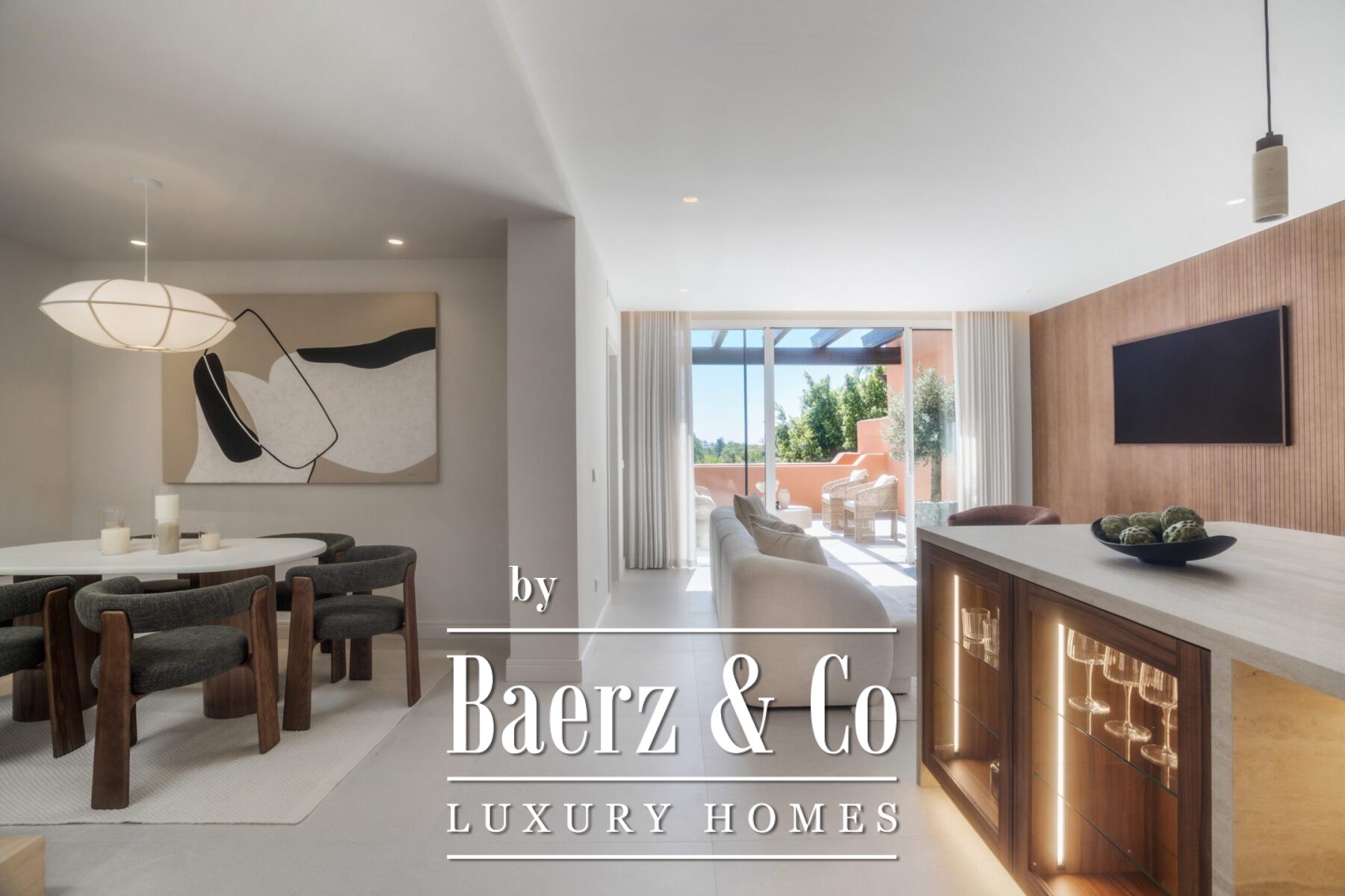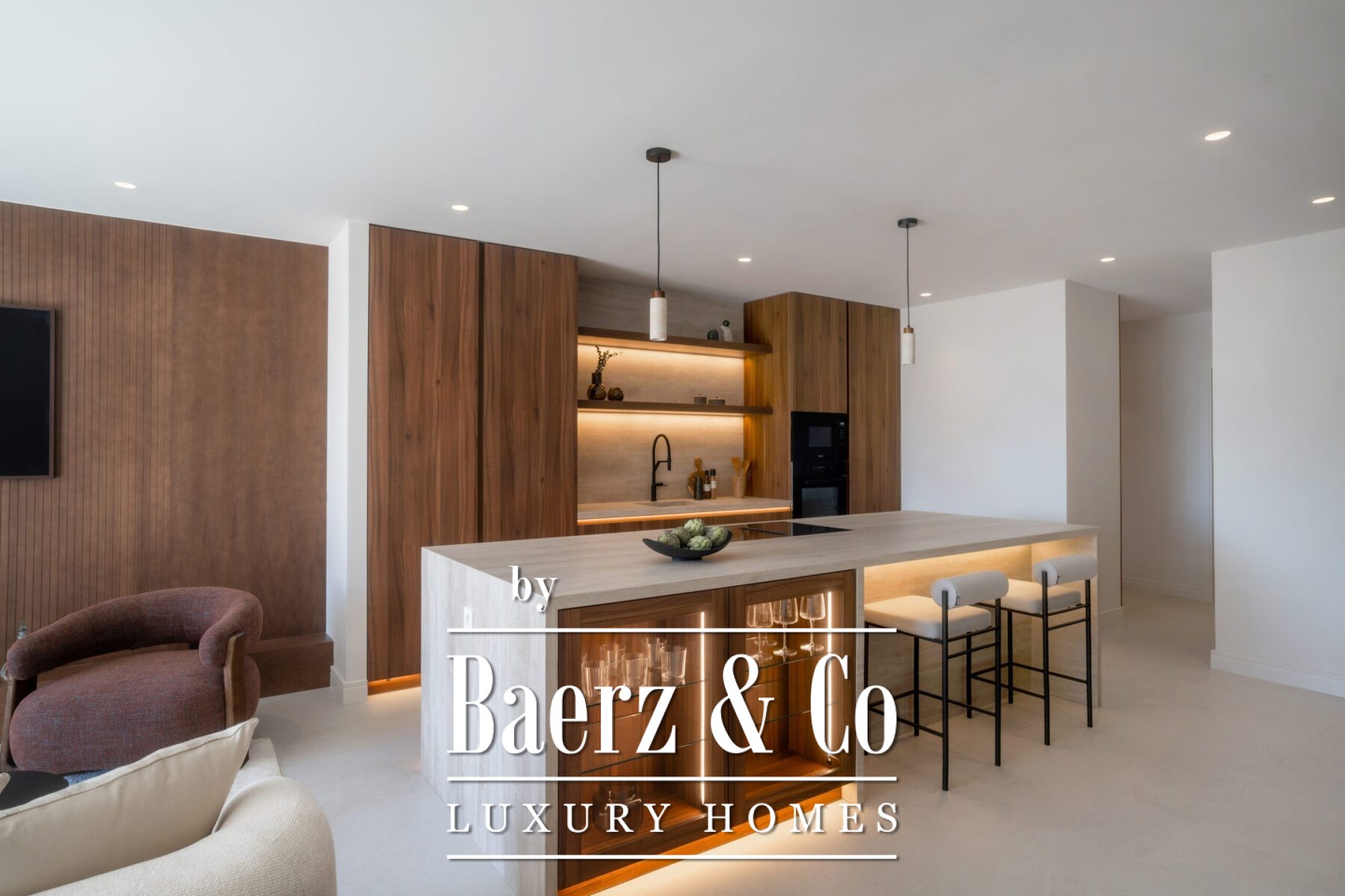 The duplex penthouse Marbella resides within a gated community in Nueva Andalucía, offering a discreet refuge moments from the Mediterranean Sea. Newly renovated, this 210 m² home comprises four bedrooms and three bathrooms, balancing contemporary architecture with elevated finishes. On the main level, a Miele-equipped kitchen adjoins open living and dining spaces, leading to a terrace that frames striking views of La Concha and the sea.