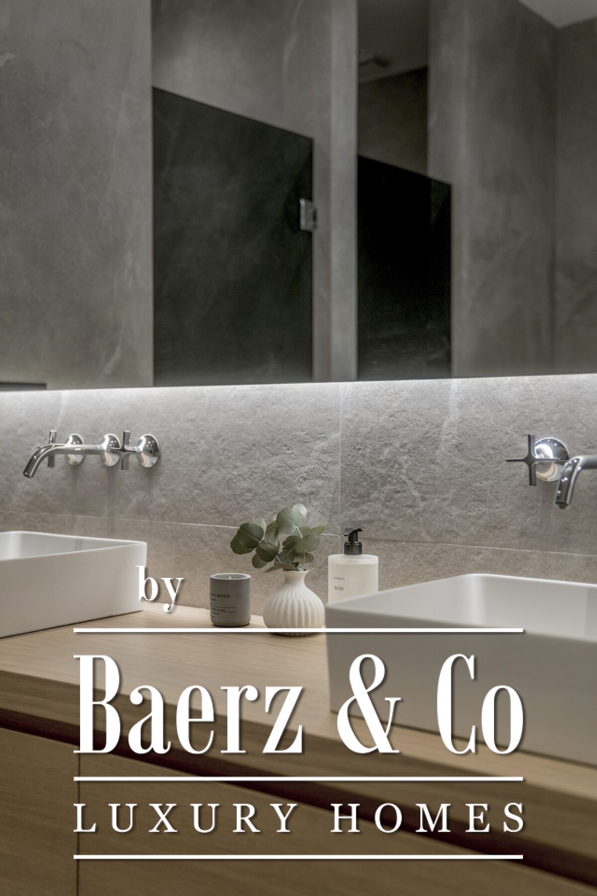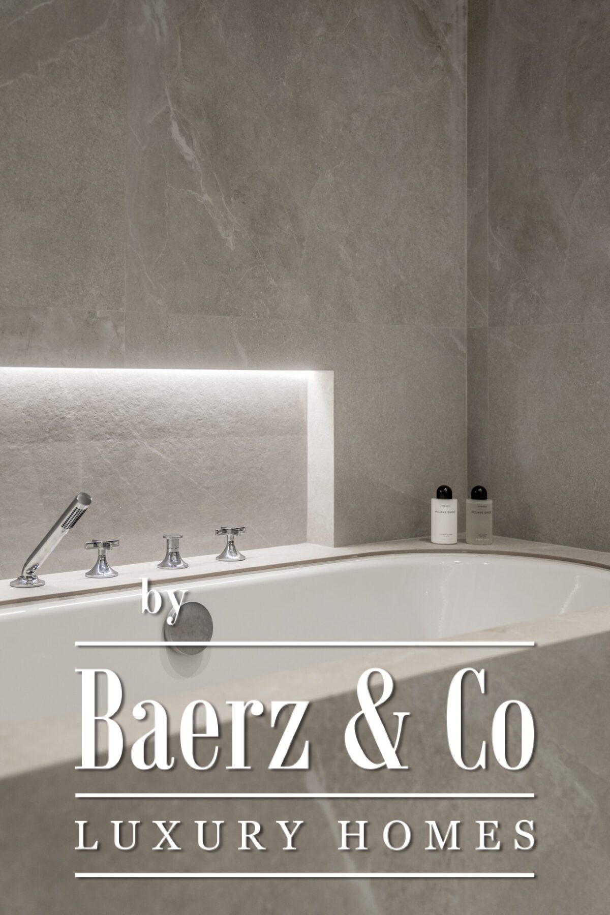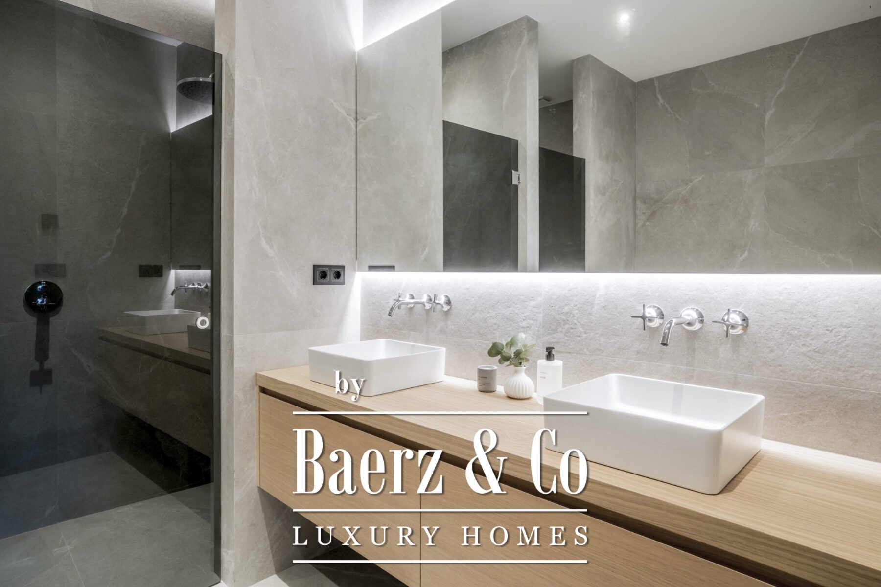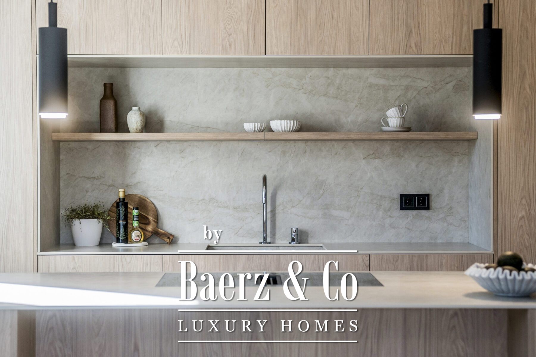The 145 m² interior offers three bedrooms, each marked by custom wardrobes, understated LED lighting, and harmonious wooden elements. Bathrooms feature Dornbracht showers and faucets, with the master suite showcasing a double vanity and a sculptural bathtub. The atmosphere throughout is balanced, warm, and spatially generous.