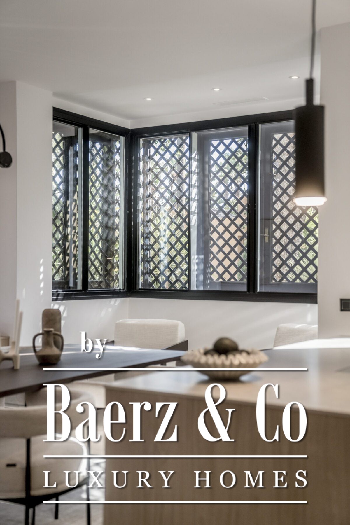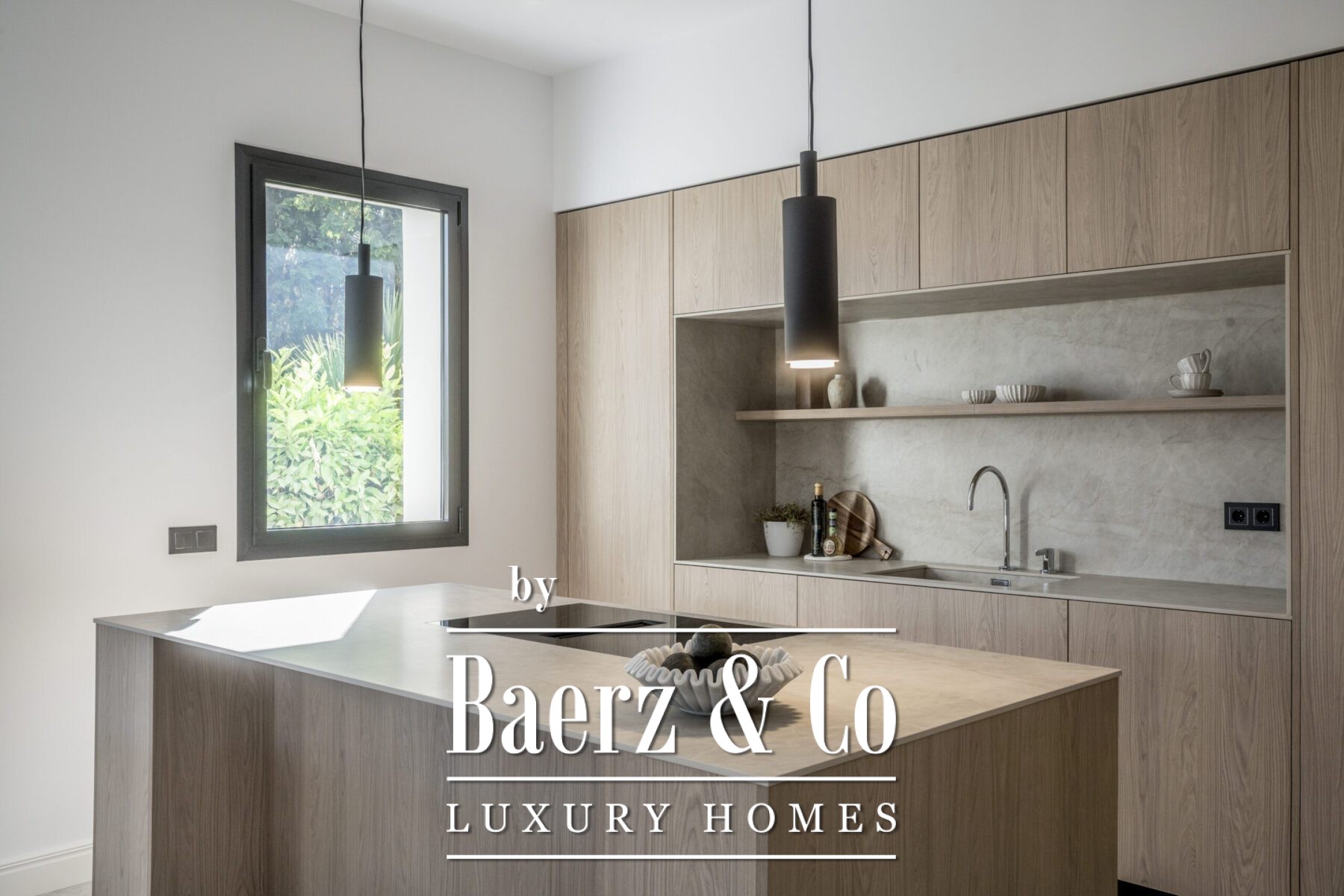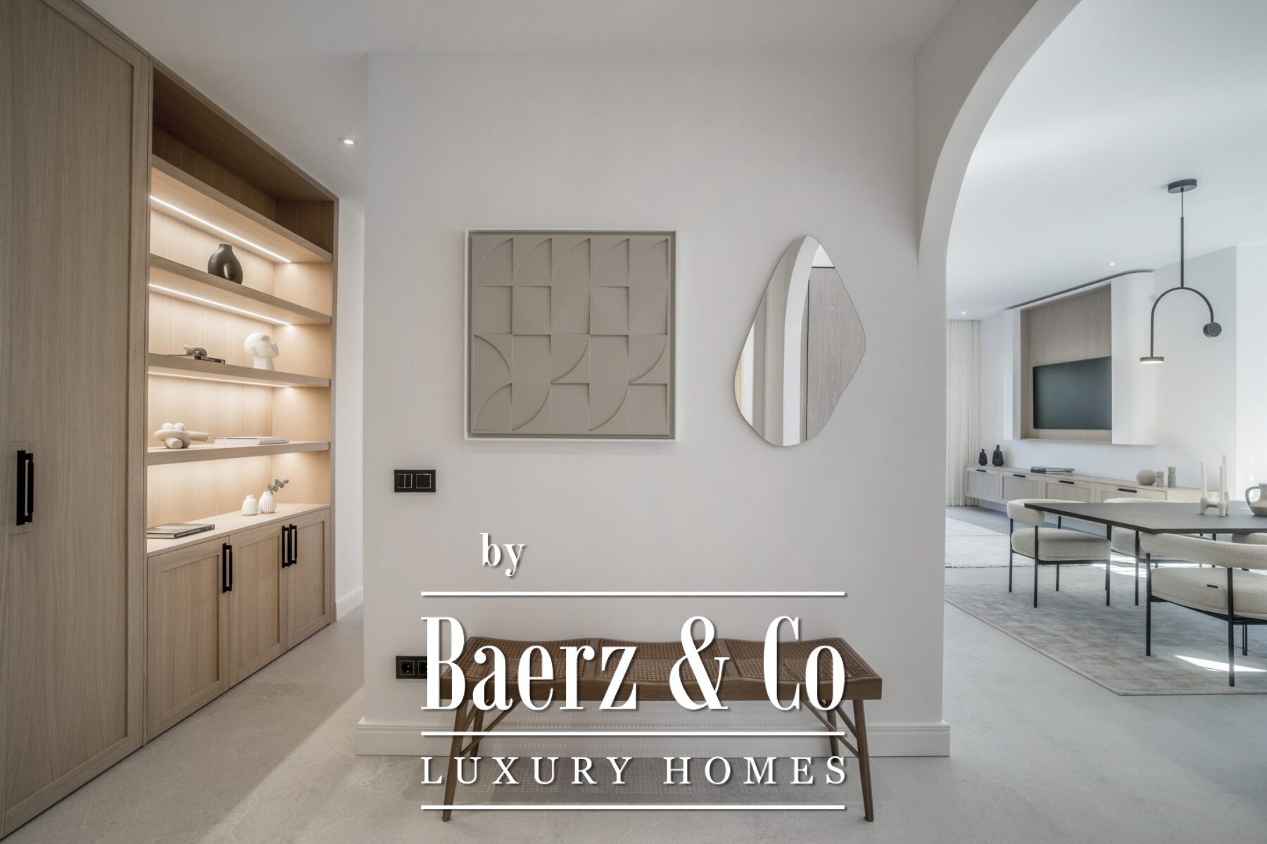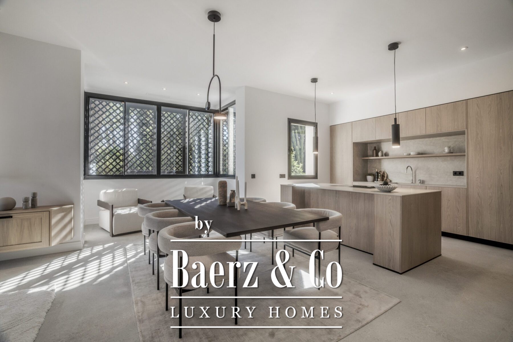 Apartment Marbella occupies a privileged position within Sierra Blanca, where each detail pivots on refined craftsmanship and a sense of effortless order. The living area is defined by natural textures, bespoke wood carpentry, high ceilings, and an open designer kitchen fitted with Miele appliances. Marble surfaces, deep wooden accents, and an integrated wine cooler shape a kitchen both elegant and practical, designed for culinary enjoyment and sociable evenings.