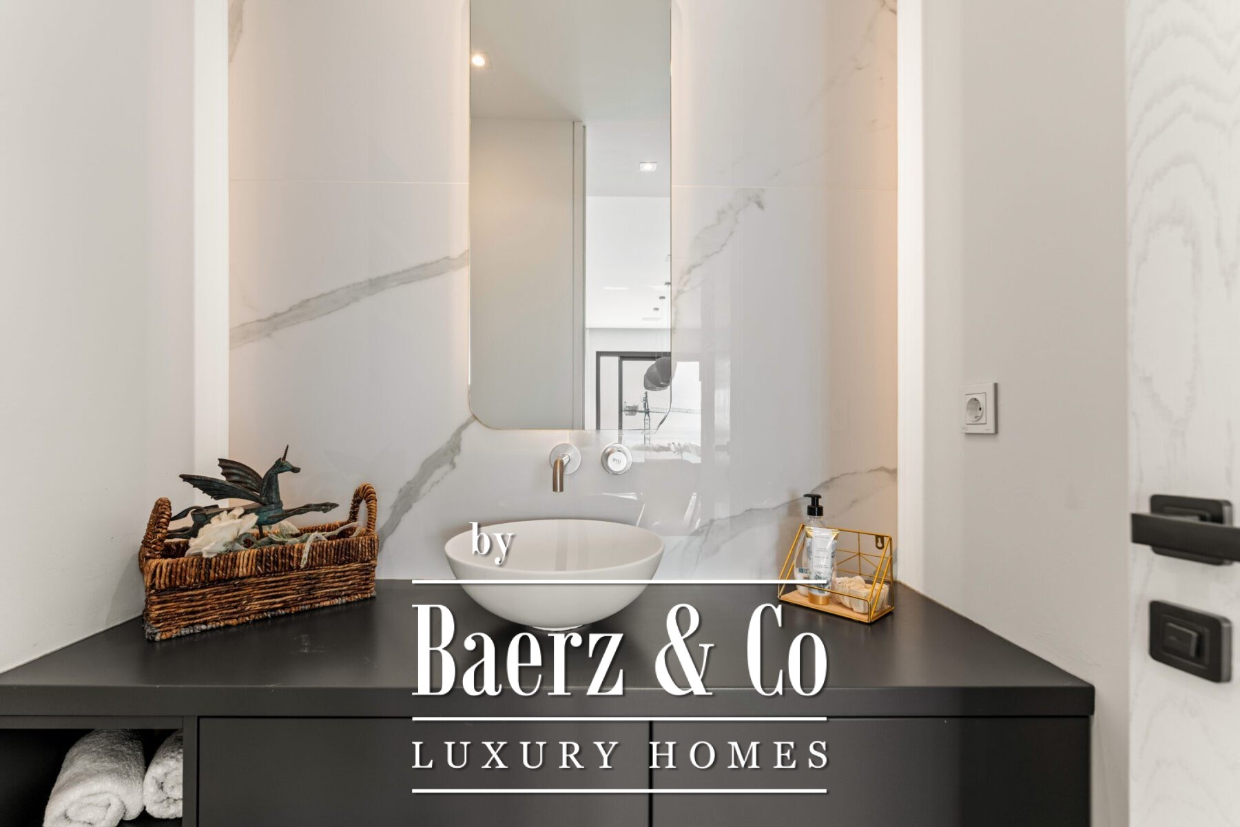 Indoors, open-plan living, dining, and kitchen areas harmonise contemporary Scandinavian tone with functional sophistication. Features such as floor-to-ceiling doors, Miele appliances, stone worktops, electric blinds, underfloor heating, and a guest WC contribute to a cohesive, comfortable atmosphere. Two underground parking spaces and a storage room ensure practical luxury.