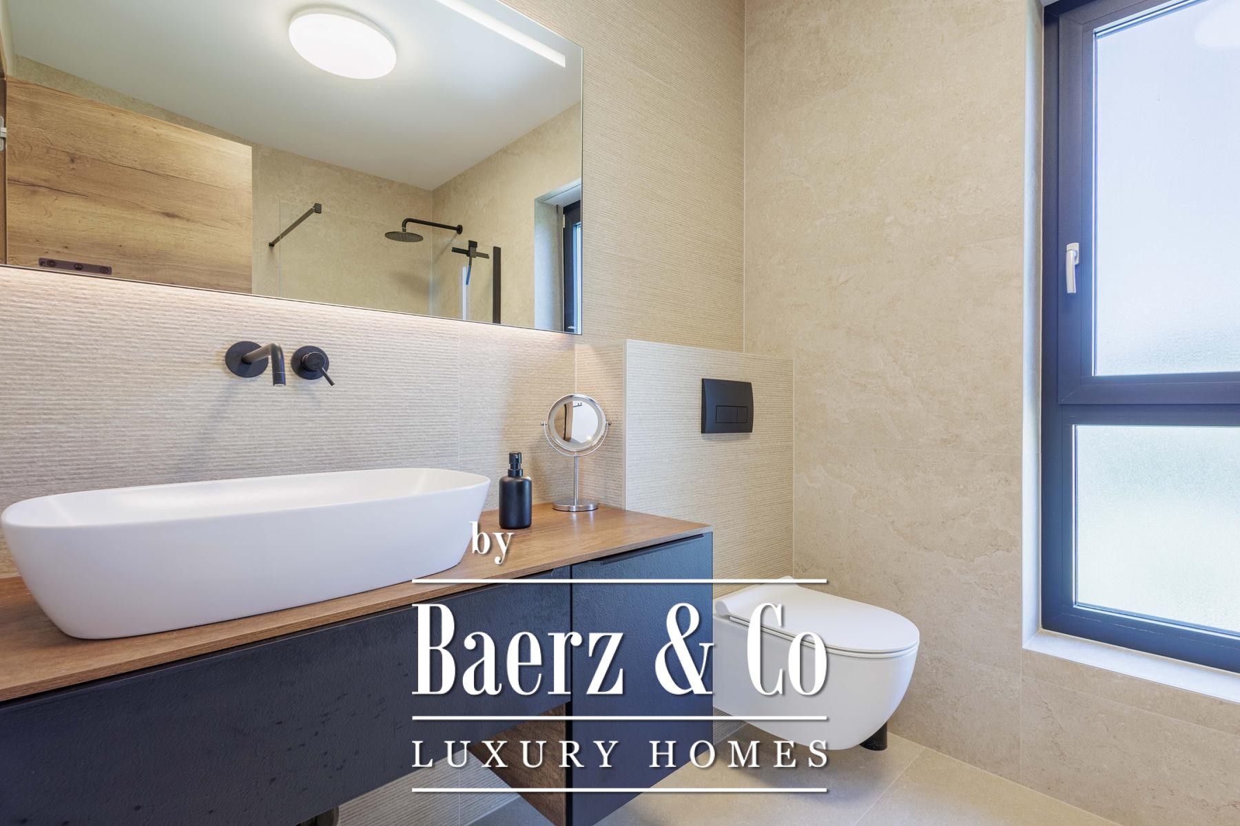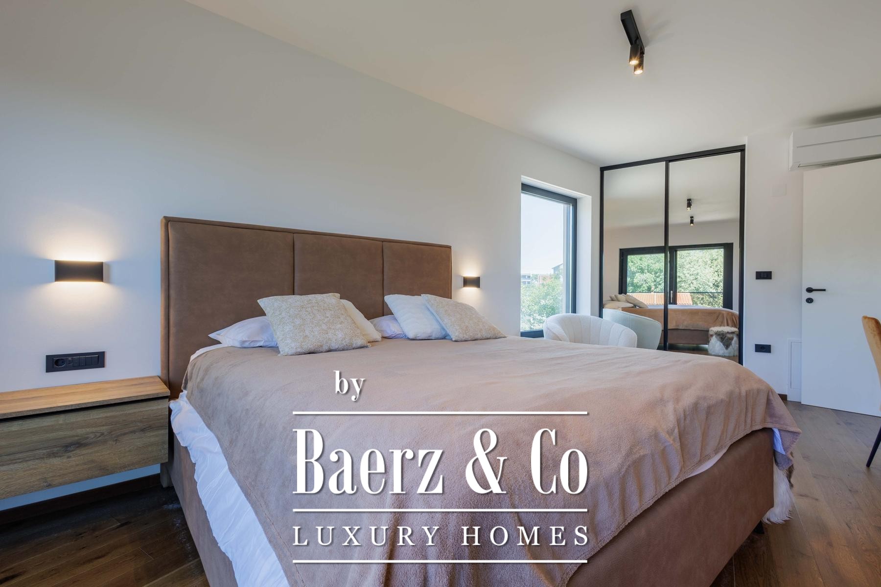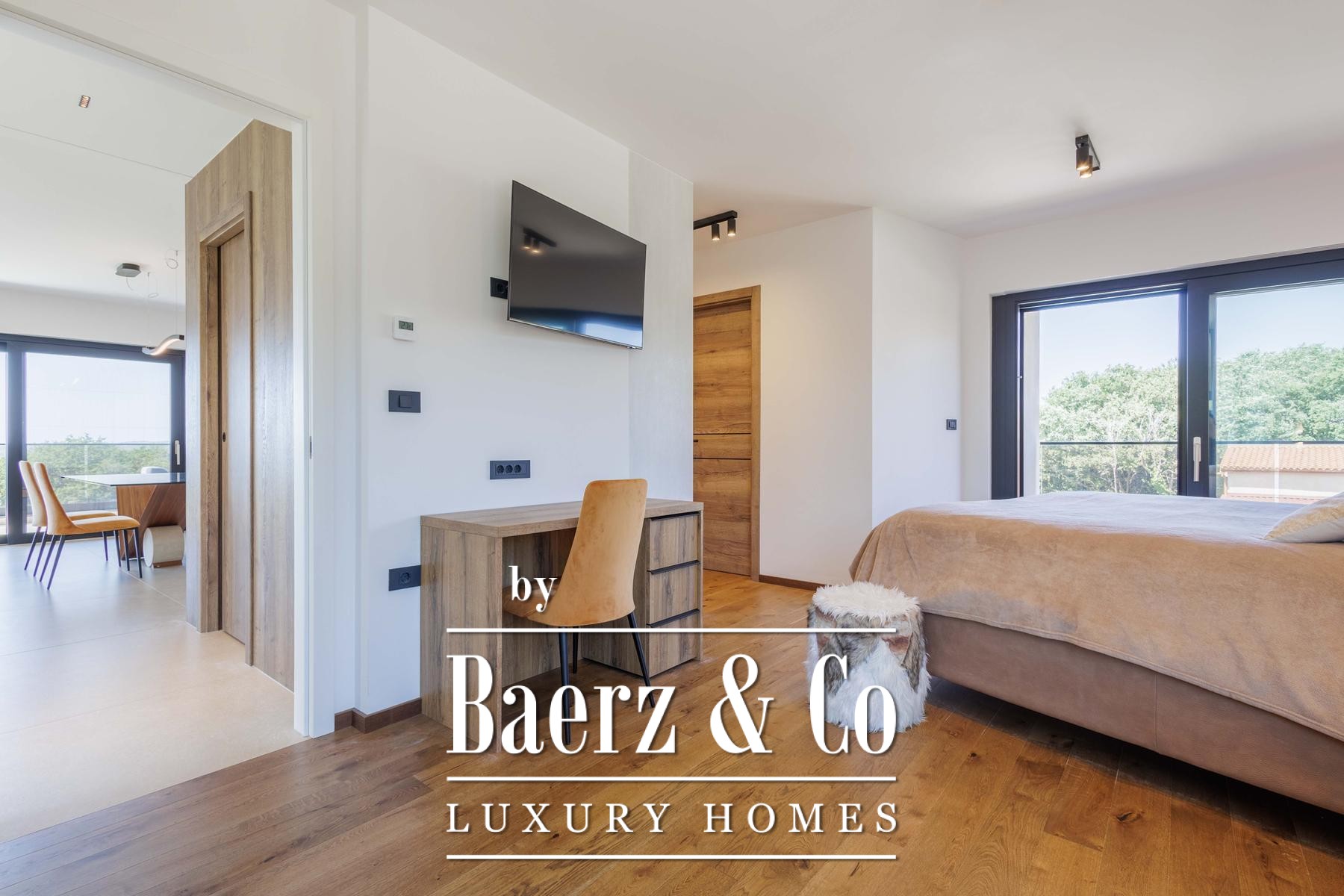 In a quiet part of Medulin, on a spacious plot of 780 m², a modern villa offers the perfect combination of luxury, comfort, and an extraordinary sea view. The house, with a total living area of 311 m², is arranged over several floors. Upon arrival, you will be greeted by a large private parking lot with direct access to the ground floor. On this level, there are two elegant bedrooms, each with its bathroom and terrace, and an additional toilet. An internal staircase leads to the first floor, where there is a spacious bedroom with its bathroom, a practical storage room, and an open living room connected to the kitchen and dining room in an open space concept. The living area leads to a large terrace with a spectacular view of the sea and the Medulin Bay, and a sliding glass wall subtly separates the living area from the relaxation area.Due to the cascading configuration of the terrain, an external staircase leads to the lower floor, where there is a separate apartment with a living room, kitchen, dining room, bathroom, and two unfinished rooms that can be adapted