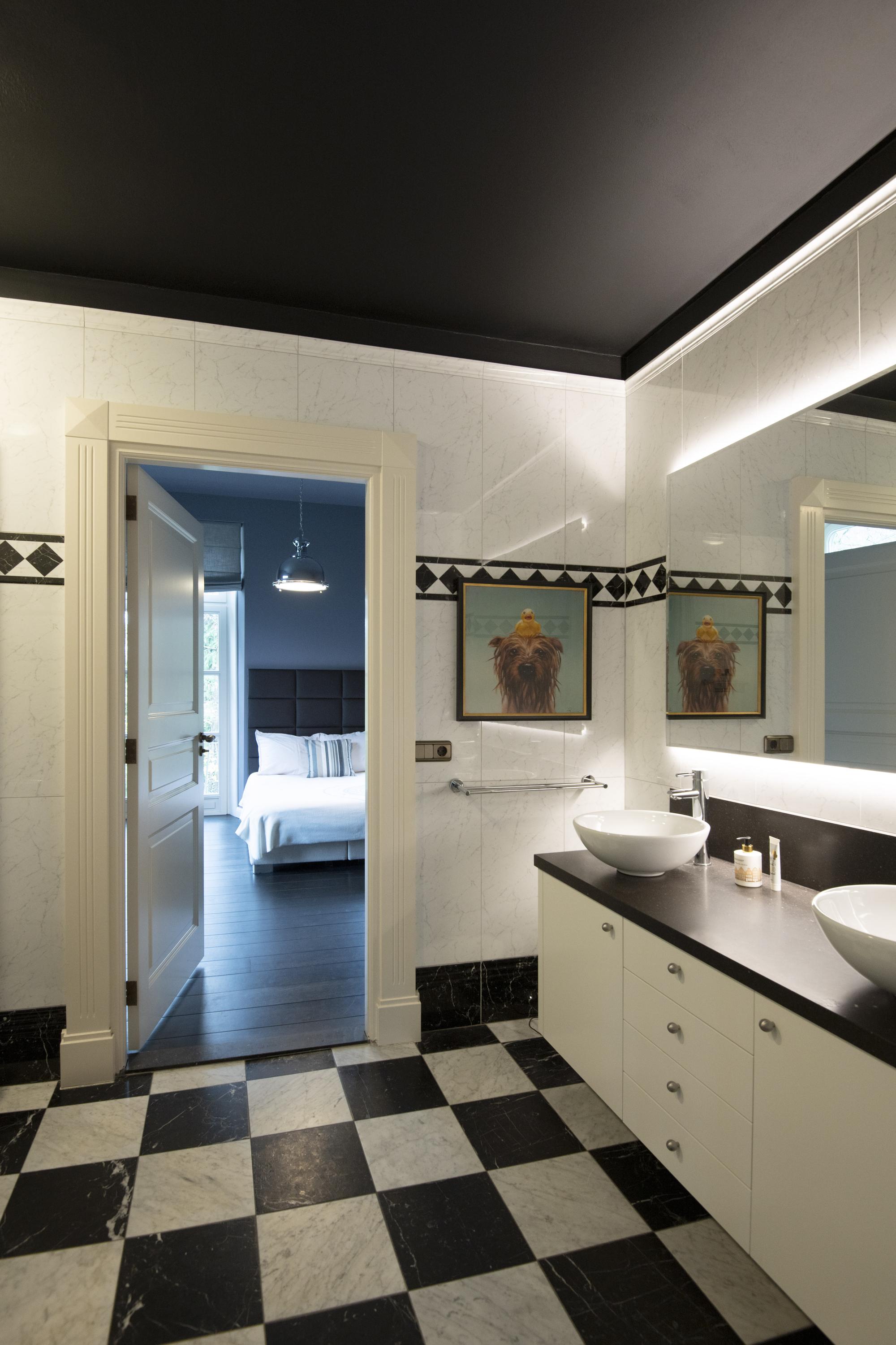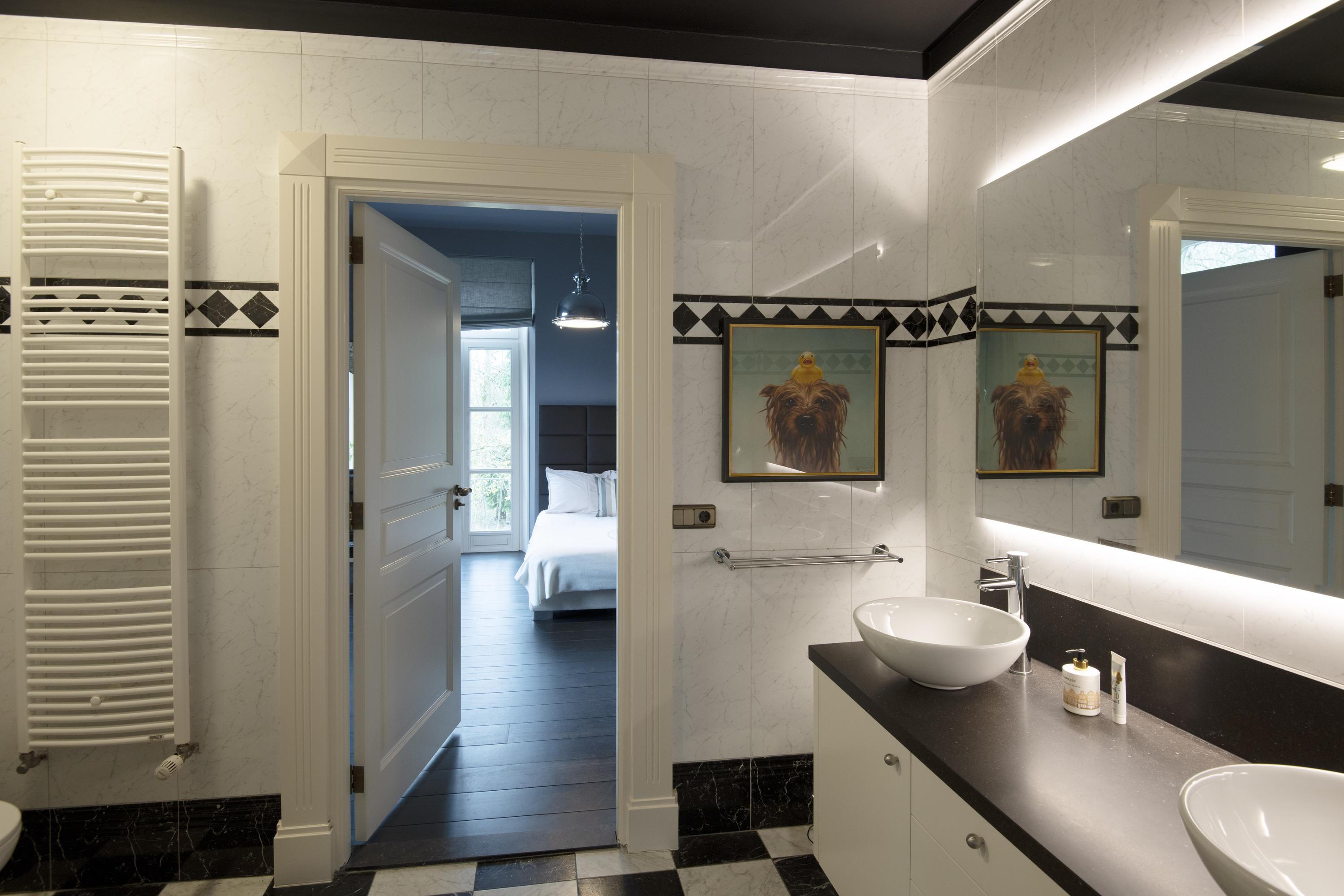 The completely nature-oriented living room consists of a sitting room and a dining room. There are two fireplaces and four pairs of French doors to the garden. The 3.60m high stucco ceilings combined with the amount of light through the high windows create a magnificent spatial experience. Double doors lead into the cozy eat-in kitchen. This fully equipped kitchen is furnished with a classic Tinello kitchen unit with a natural stone worktop, sink island and high-quality appliances. In the tower adjacent to the kitchen diner is a pantry. In the living kitchen are two pairs of double doors to the garden. The entire first floor has underfloor heating.